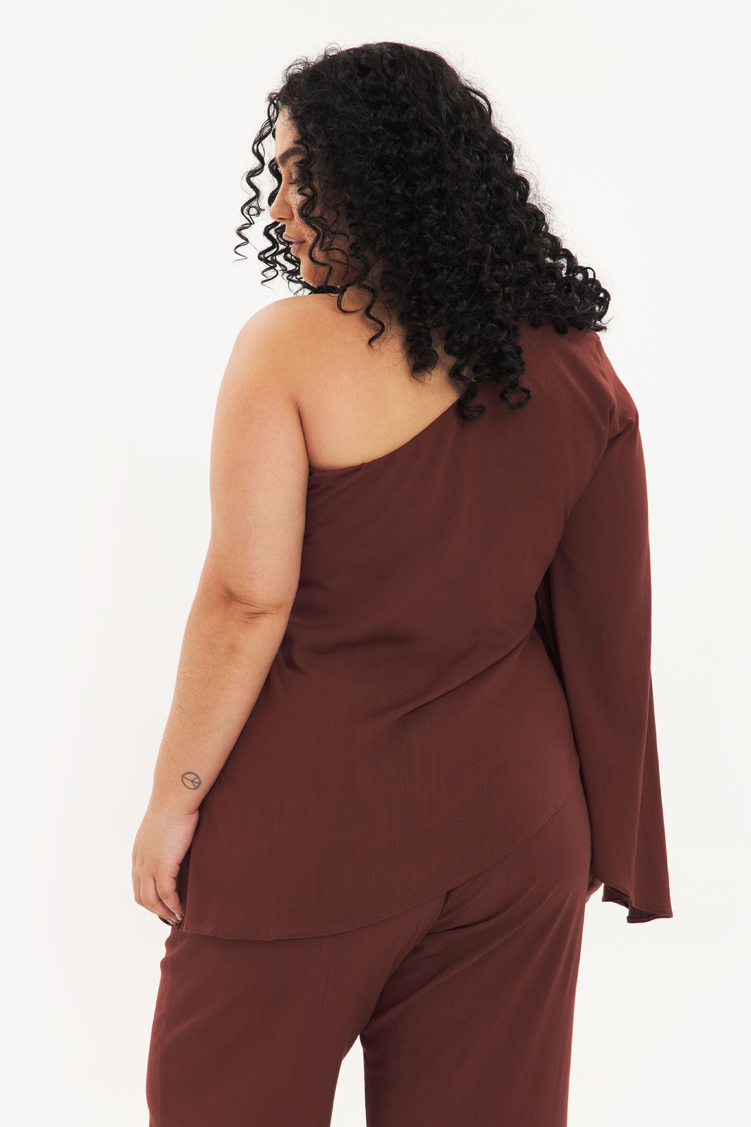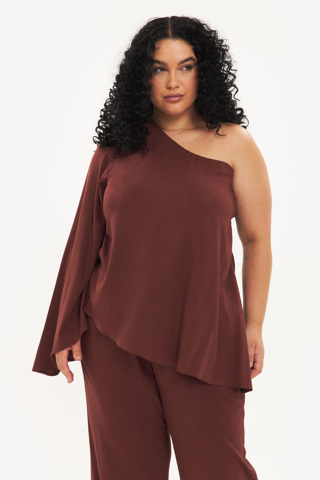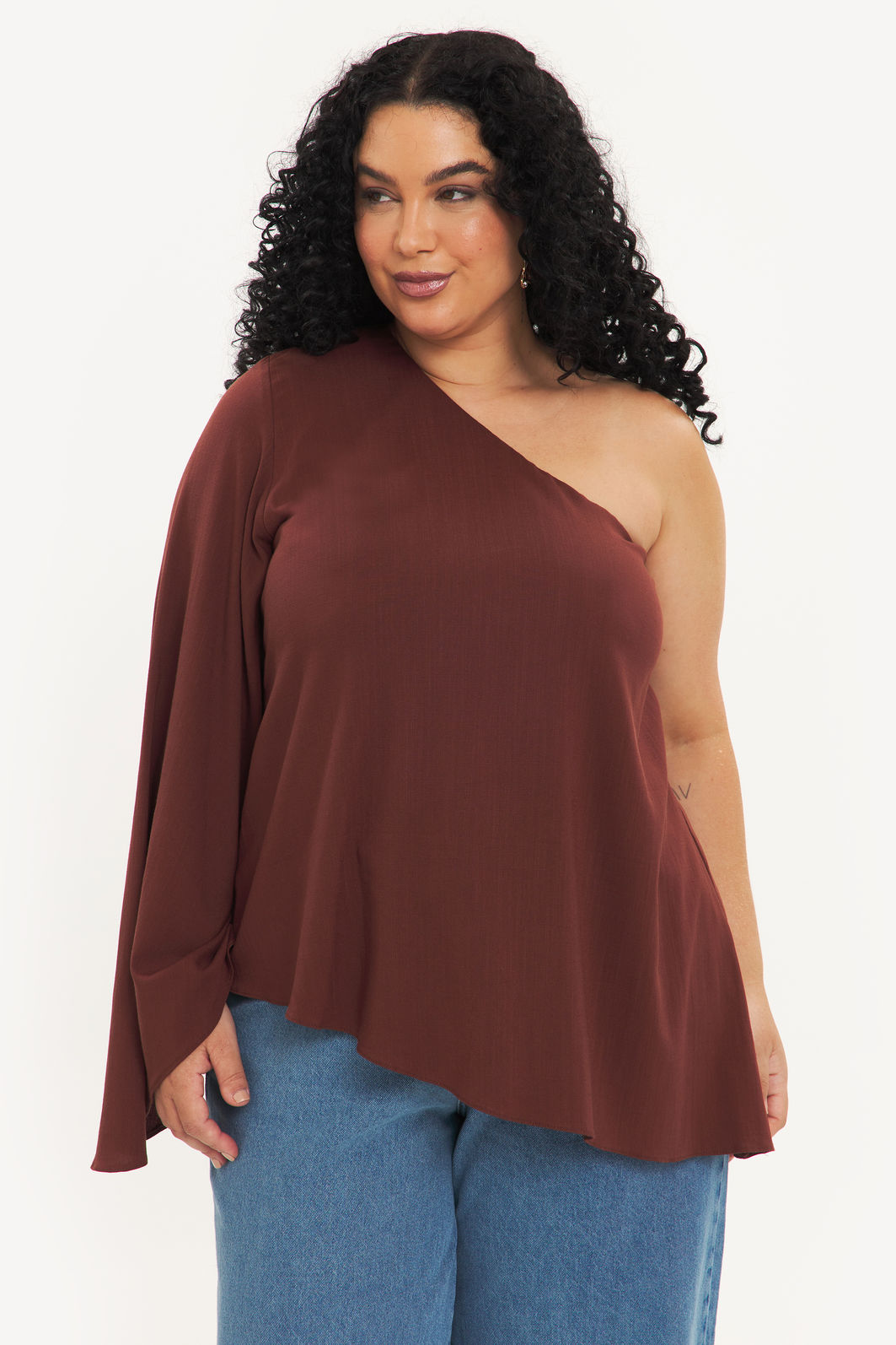 Blusa feminina confeccionada em tecido de viscose com elastano. A peça de modelo assimétrico deixando um ombro à mostra, uma manga longa e fluida, barra pontiaguda no lado oposto à manga, com forro no busto e shape solto. Modelagem especializada para corpos plus & curve size.