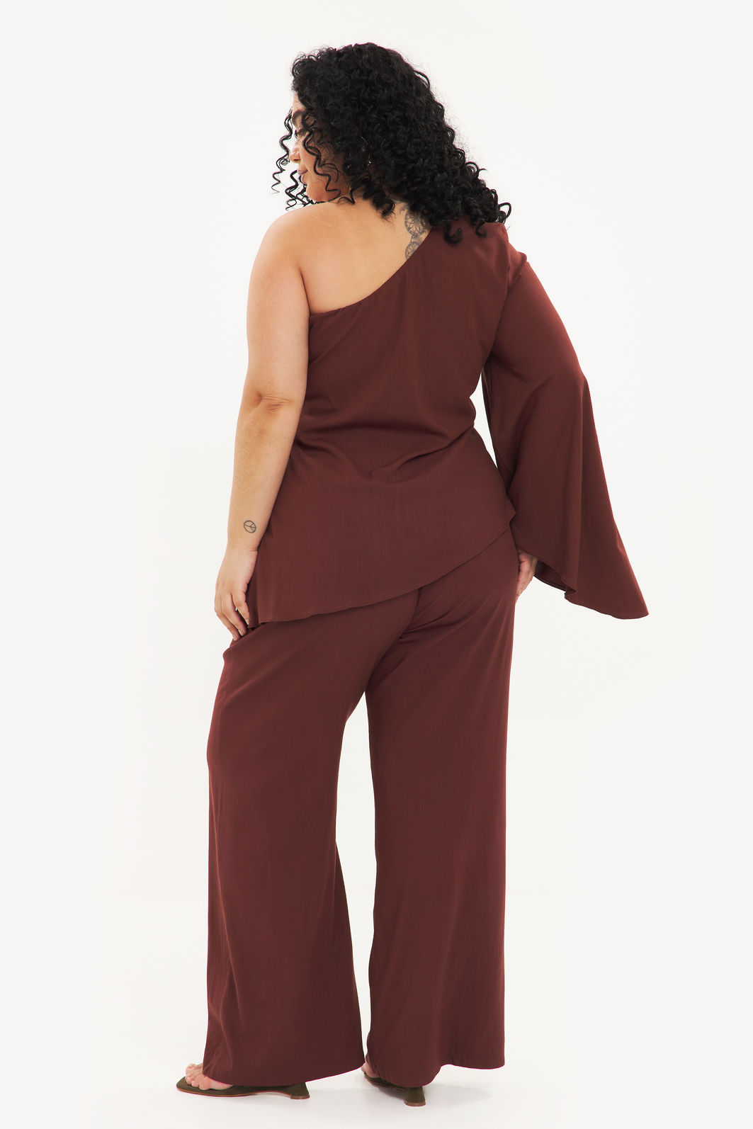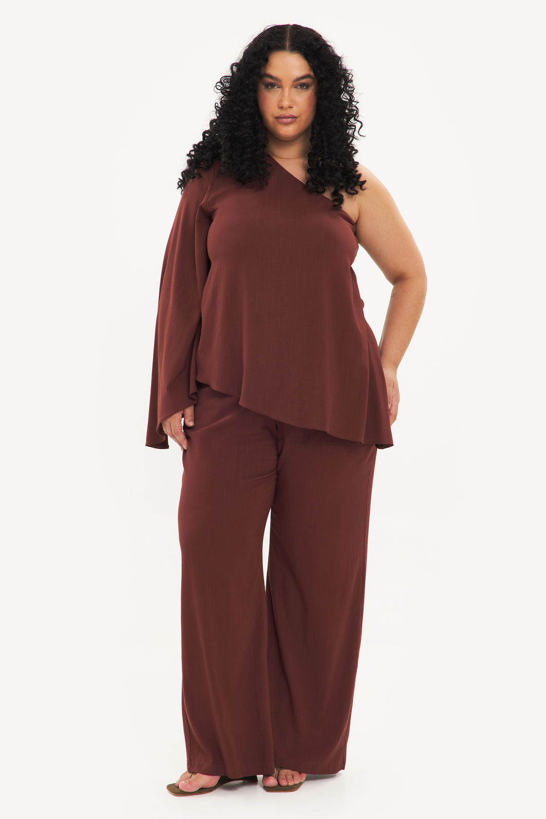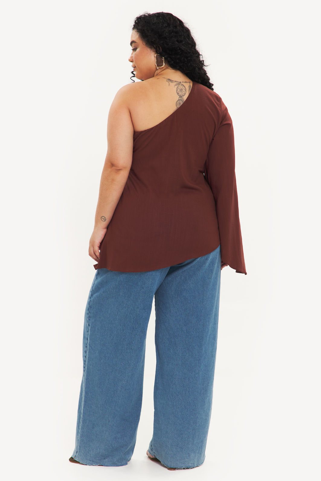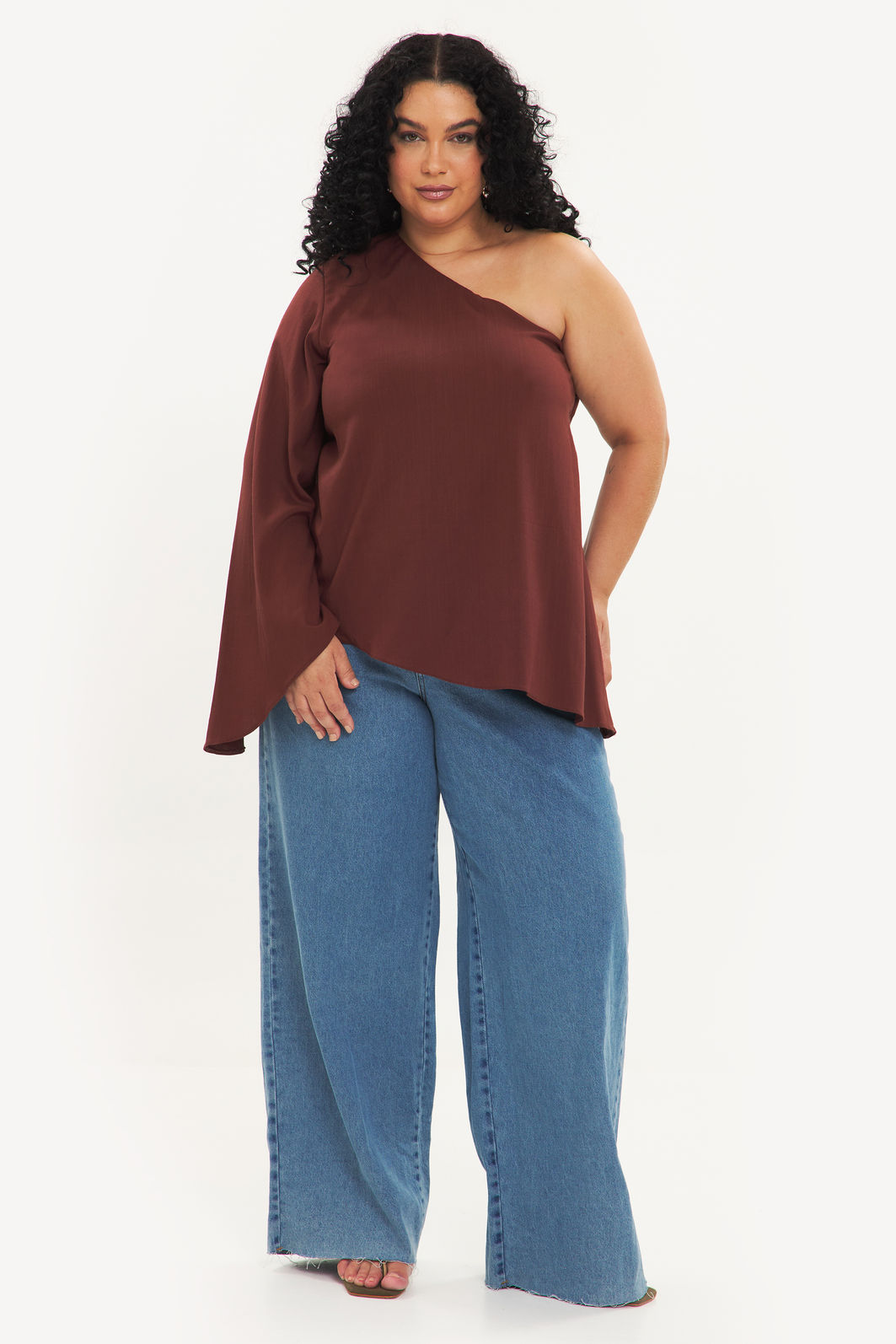 Blusa feminina confeccionada em tecido de viscose com elastano. A peça de modelo assimétrico deixando um ombro à mostra, uma manga longa e fluida, barra pontiaguda no lado oposto à manga, com forro no busto e shape solto. Modelagem especializada para corpos plus & curve size.