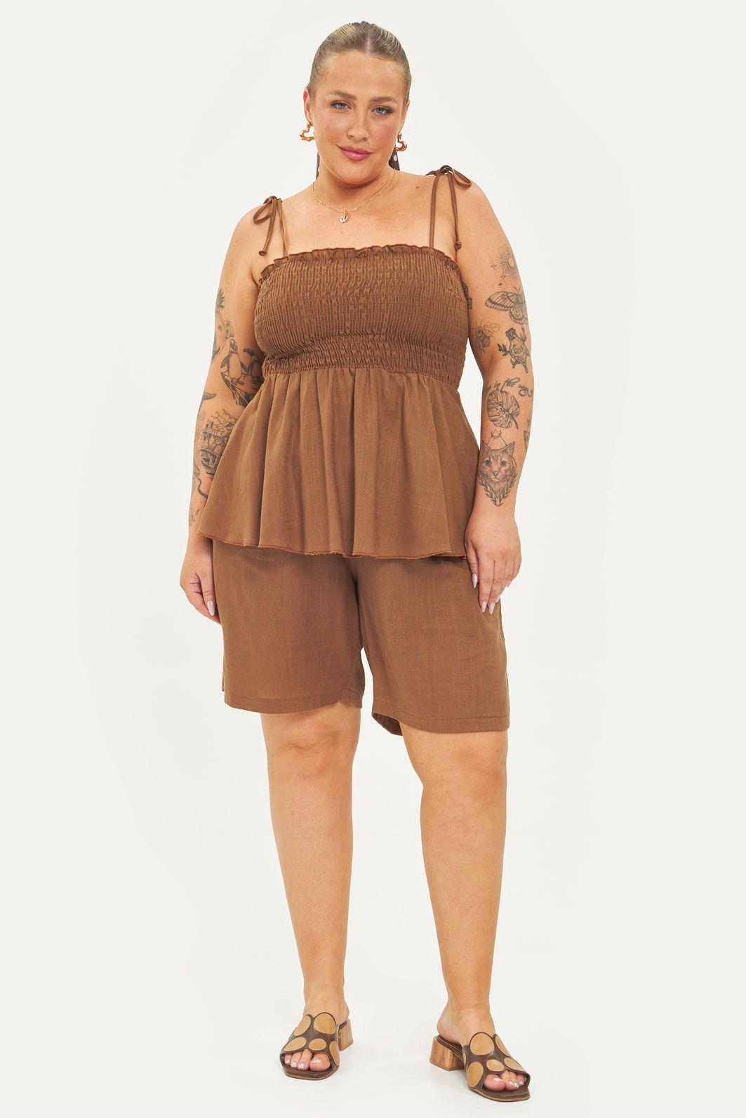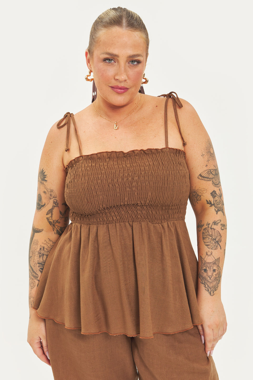Blusa feminina confeccionada em tecido viscose com linho. A peça possui decote tomara que caia, alças finas com amarração para ajuste, busto e costas com lastex para melhor sustentação e acabamento em peplum na cintura. Modelagem especializada para corpos plus & curve size.