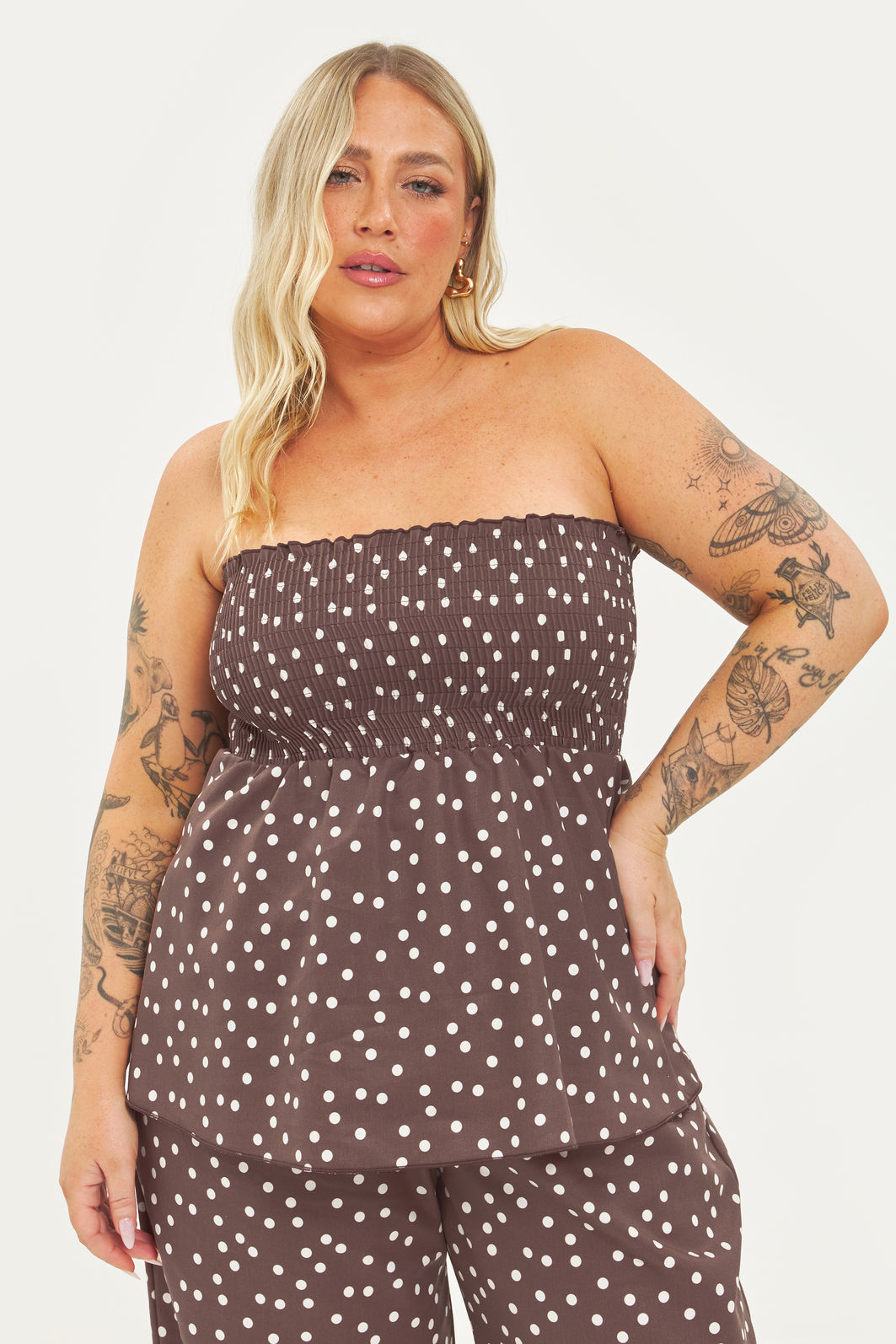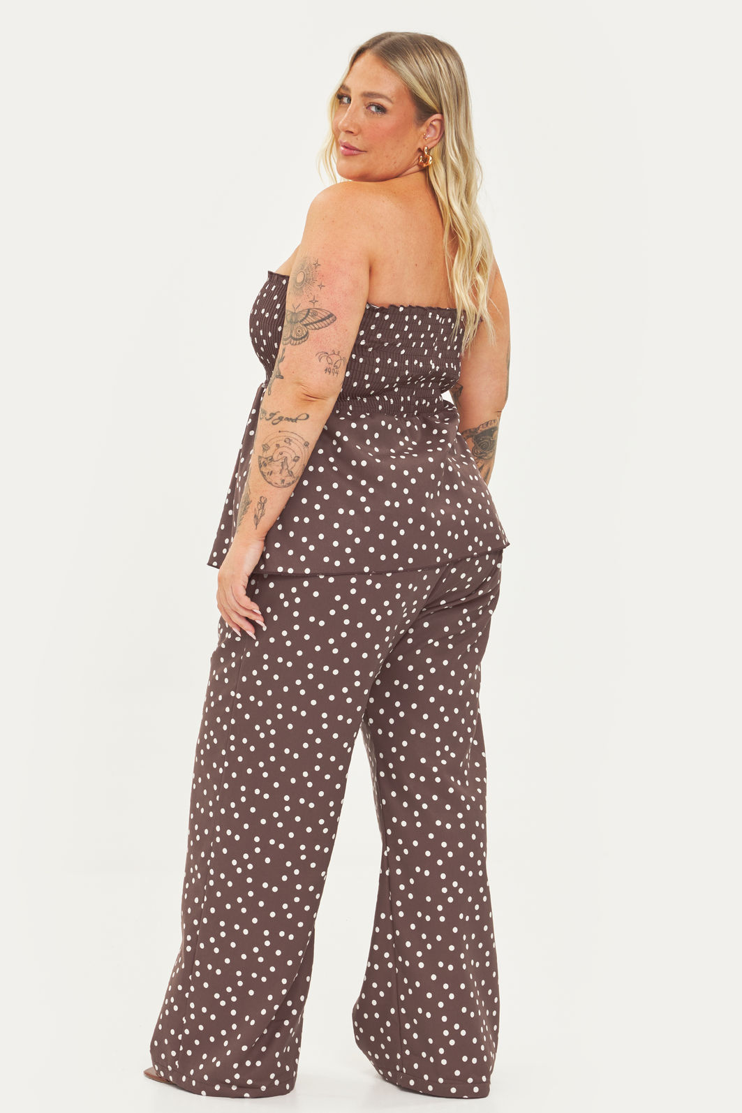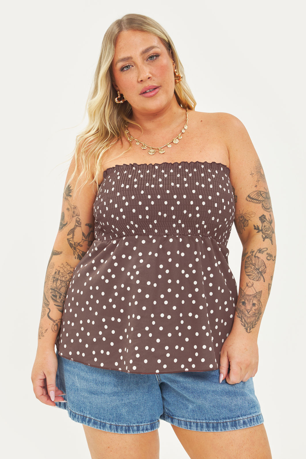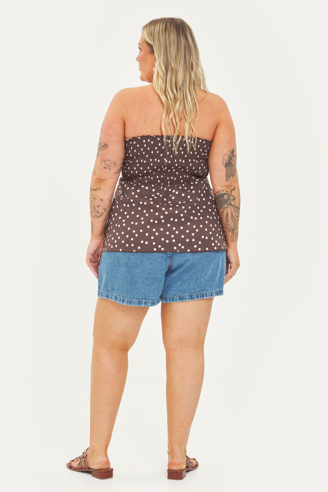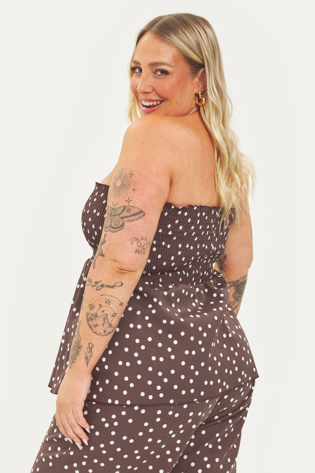 Blusa feminina confeccionada em tecido 100% viscose. A peça possui decote tomara que caia, busto e costas com lastex para melhor sustentação e acabamento em peplum na cintura. Com estampa exclusiva em cor contrastante. Modelagem especializada para corpos plus & curve size.