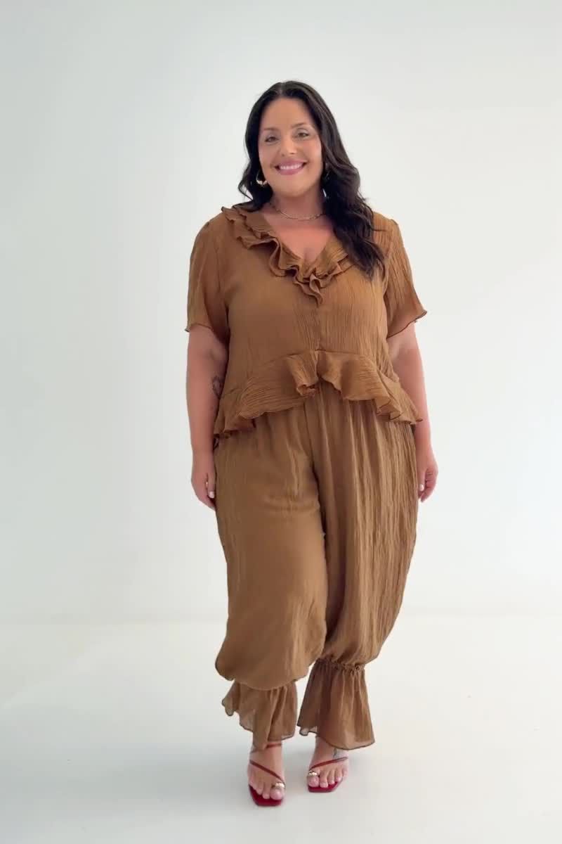 Calça feminina confeccionada em tecido fluído com aspecto levemente amassado natural. A peça de modelo aladim com detalhe franzido em elástico na barra, possui cintura alta, cós total em elástico para melhor adaptação a diferentes corpos, shape solto. Modelagem especializada para corpos plus & curve size.