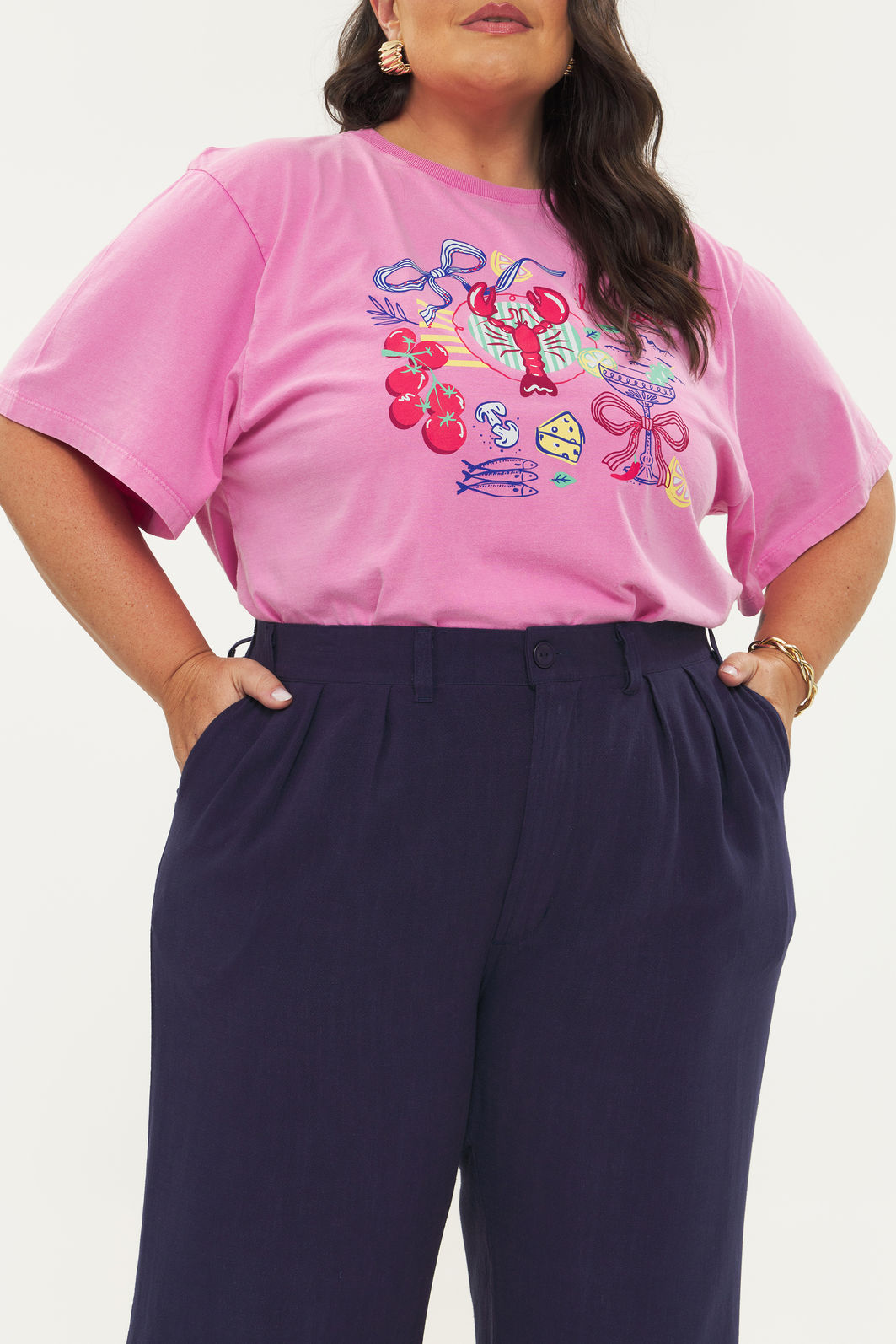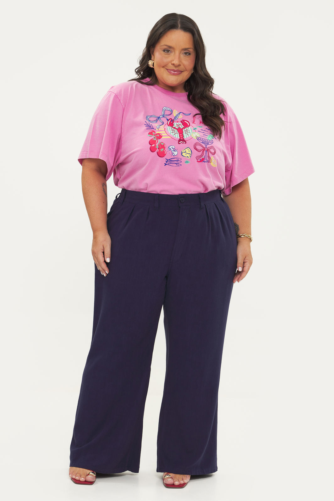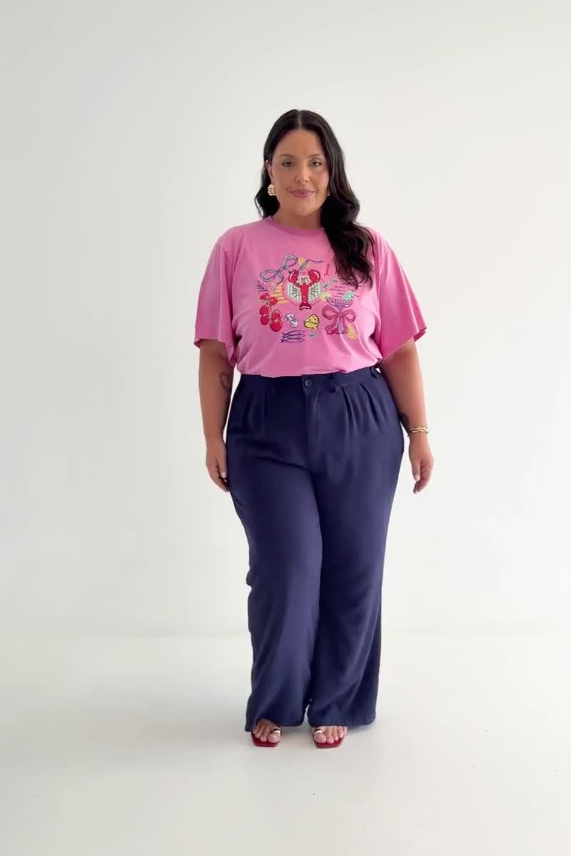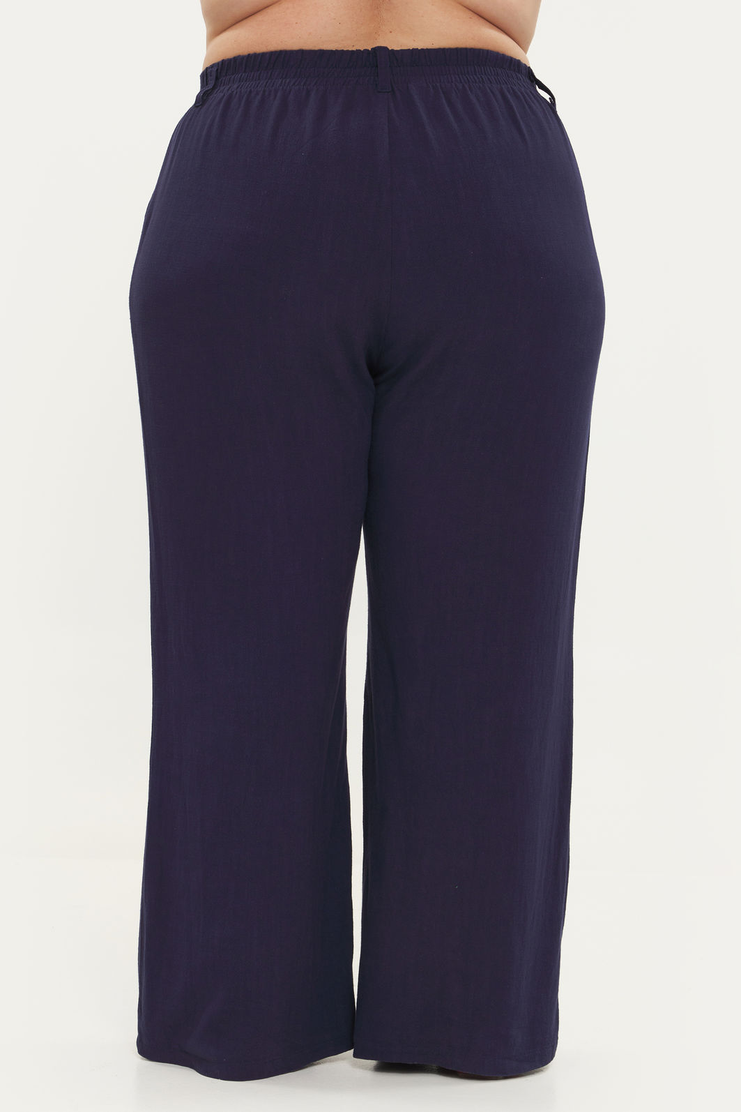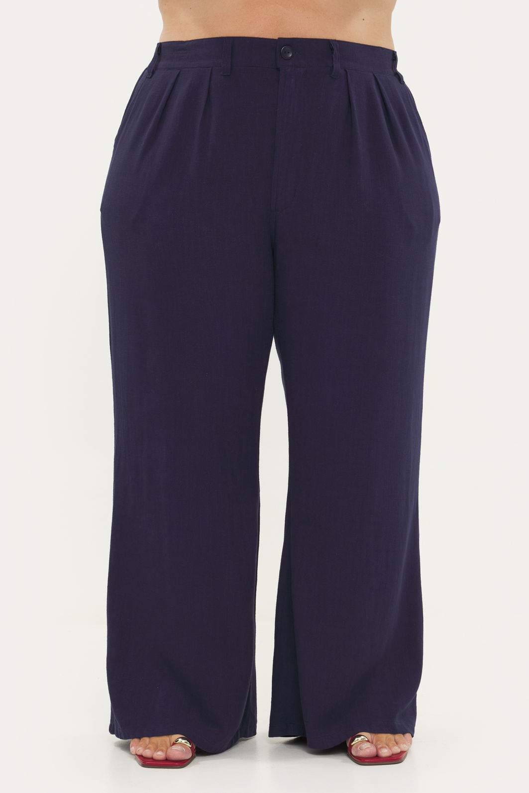 Calça feminina confeccionada em tecido de viscose com linho. Com modelagem wide leg, a peça possui cintura alta, elástico no cós traseiro, passantes para cinto, pregas na cintura, bolsos frontais funcionais, shape solto, caimento reto, fechamento por zíper e botão. Cós entretelado para não ficarem marcas de dobra conforme o uso. Modelagem especializada para corpos plus & curve size.