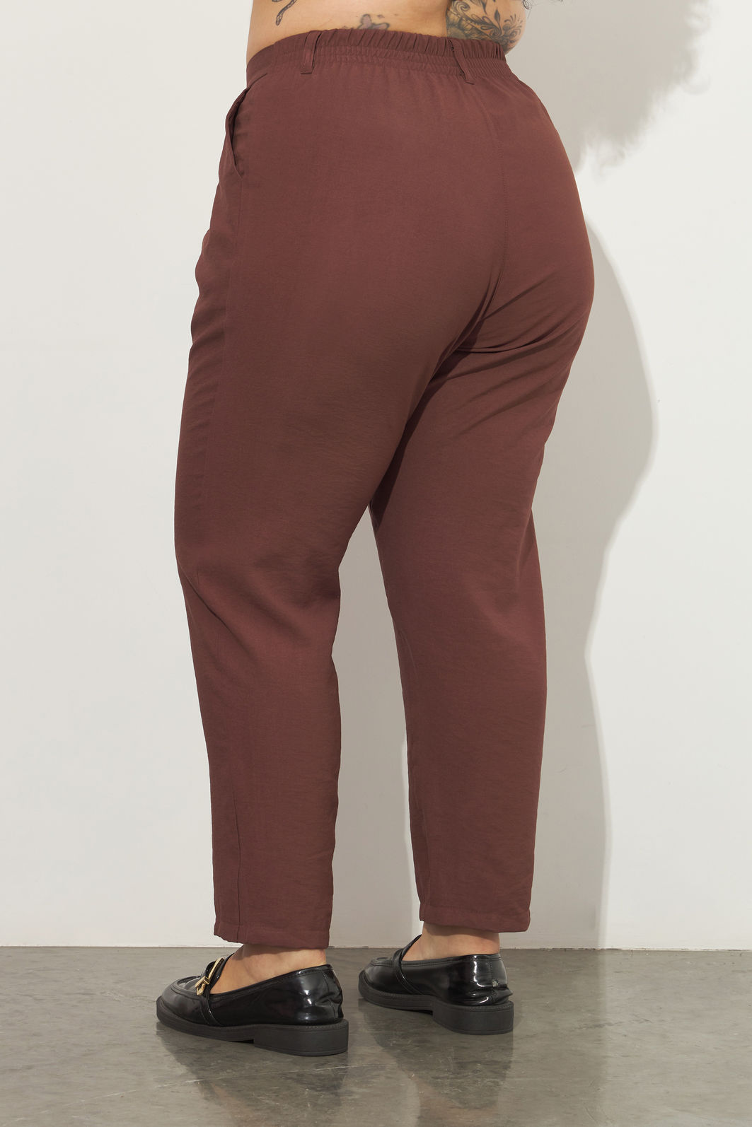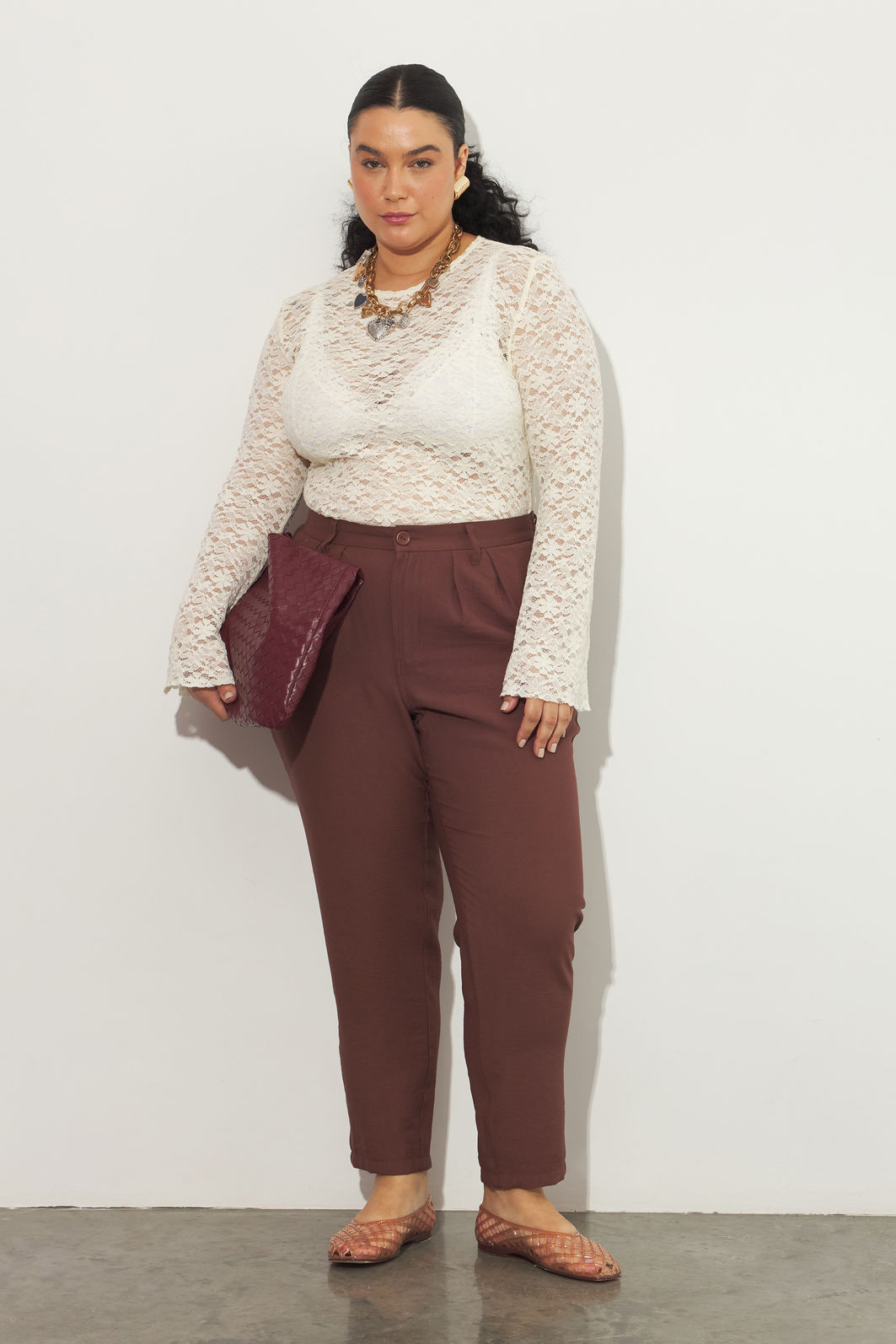 Calça feminina confeccionada em tecido de viscose. Com modelagem de alfaiataria, a peça possui cintura alta, cós traseiro com elástico para melhor adaptação a diferentes corpos, passantes para cinto, pregas na cintura, bolsos frontais, shape solto, caimento reto, fechamento por zíper e botão. Cós entretelado para não ficar marcas de dobra conforme o uso. Modelagem especializada para corpos plus & curve size.