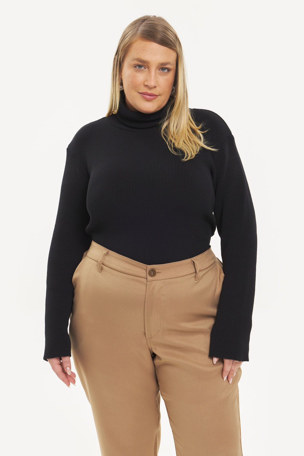 Calça feminina com modelagem reta. A peça possui cintura alta, cós traseiro com elástico, passantes para cinto, bolsos funcionais, caimento reto, acabamento pespontado, fechamento frontal por zíper e botão. Modelagem especializada para corpos plus & curve size.