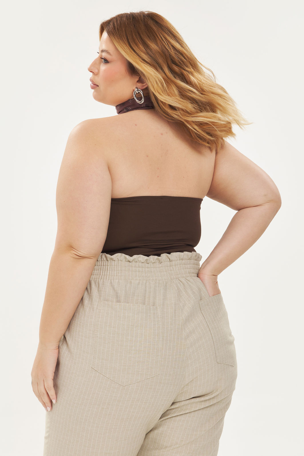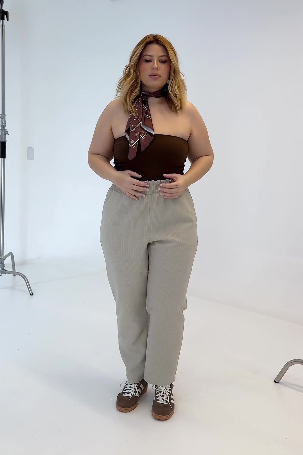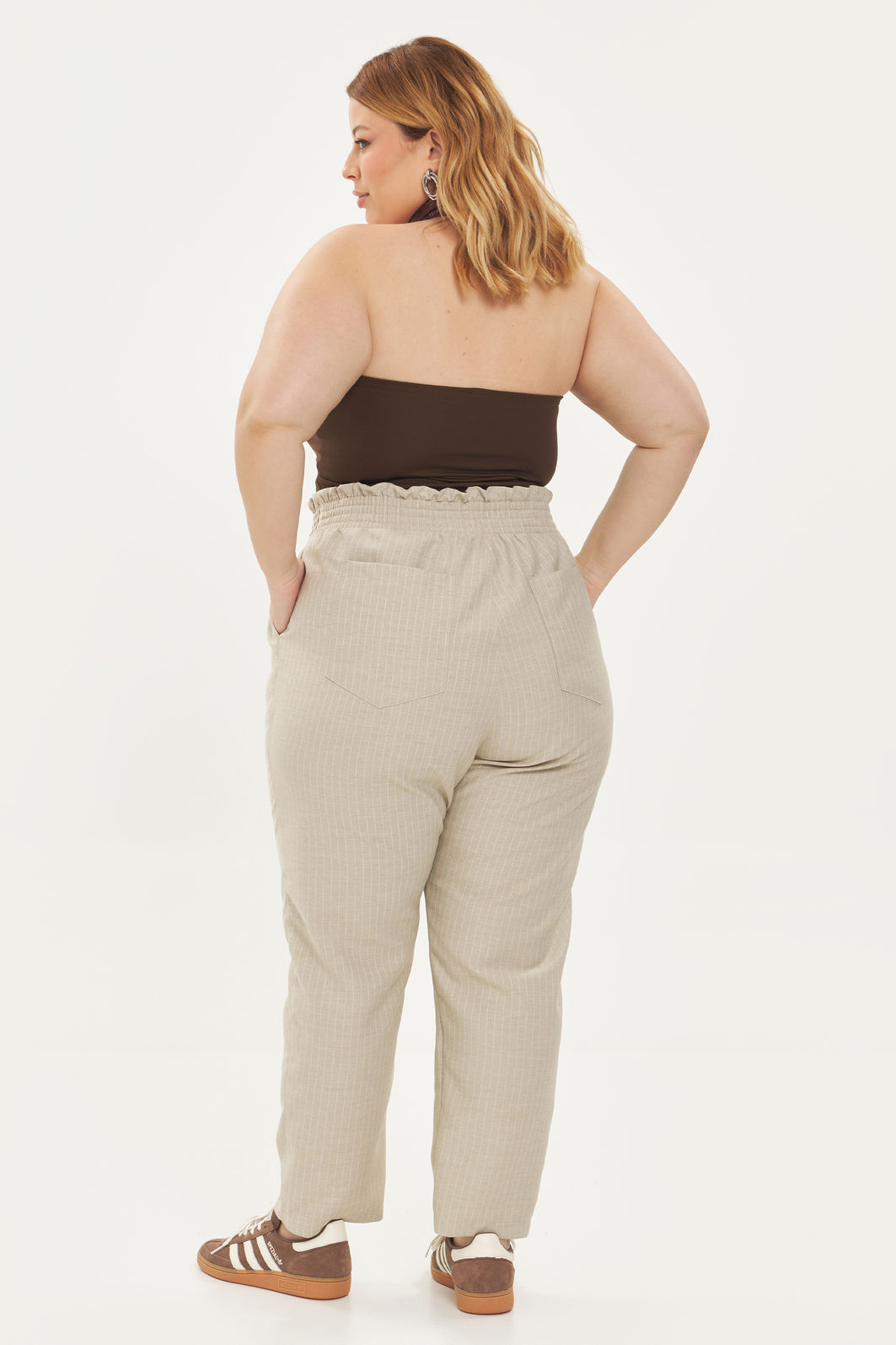 Calça feminina confeccionada em tecido de poliéster com viscose. A peça possui cintura alta, cós total com elástico, modelo clochard. Caimento reto, shape solto, bolsos funcionais frontais e traseiros. Modelagem especializada para corpos plus & curve size.