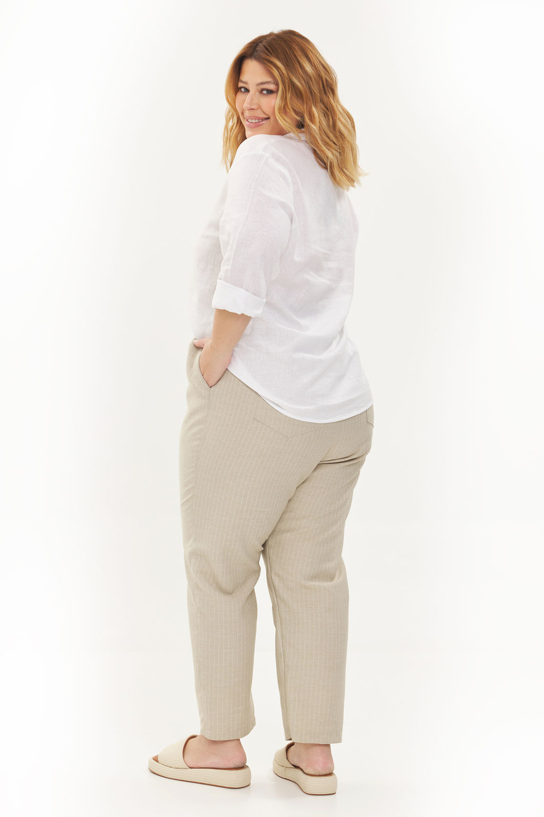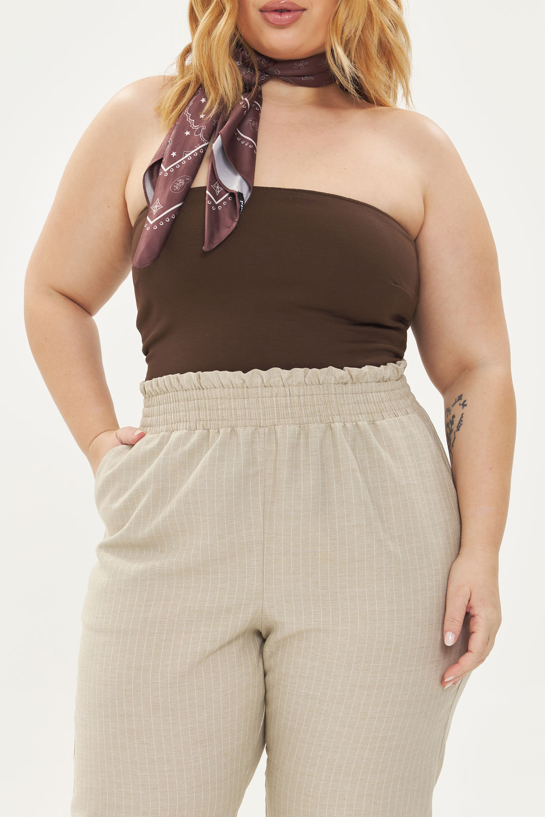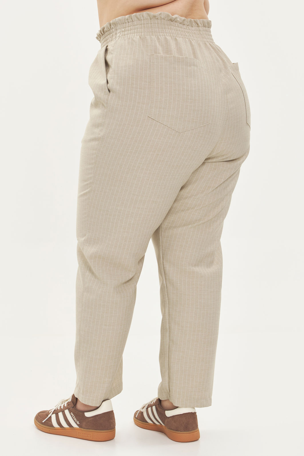 Calça feminina confeccionada em tecido de poliéster com viscose. A peça possui cintura alta, cós total com elástico, modelo clochard. Caimento reto, shape solto, bolsos funcionais frontais e traseiros. Modelagem especializada para corpos plus & curve size.