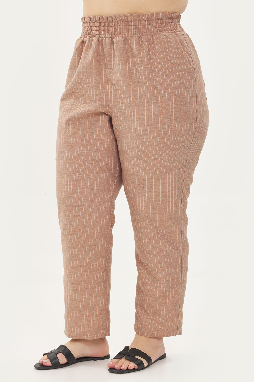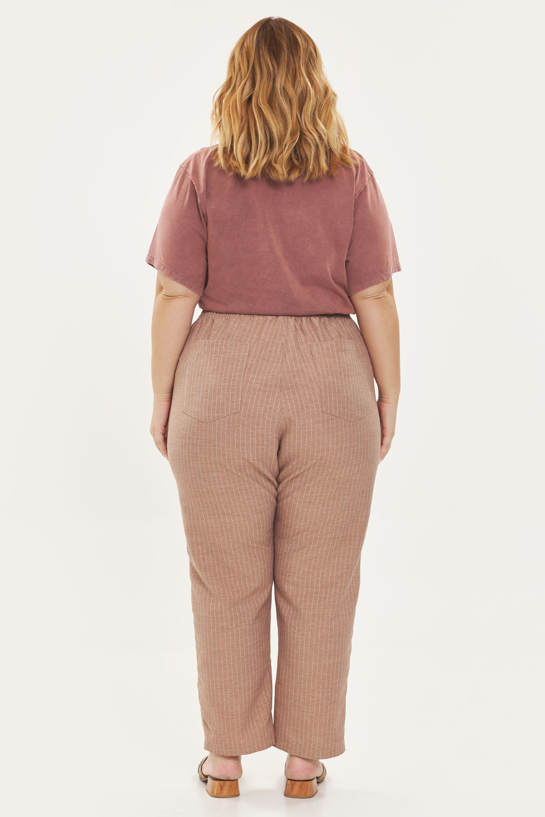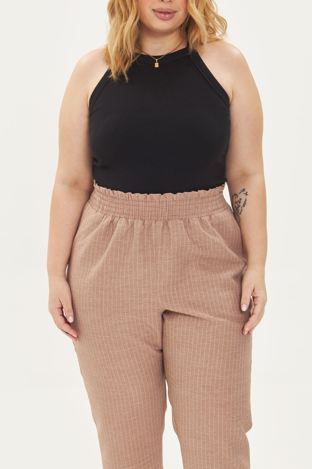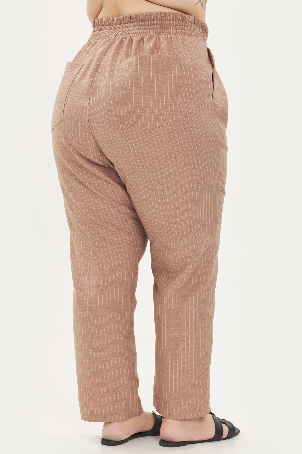 Calça feminina confeccionada em tecido de poliéster com viscose. A peça possui cintura alta, cós total com elástico, modelo clochard. Caimento reto, shape solto, bolsos funcionais frontais e traseiros. Modelagem especializada para corpos plus & curve size.