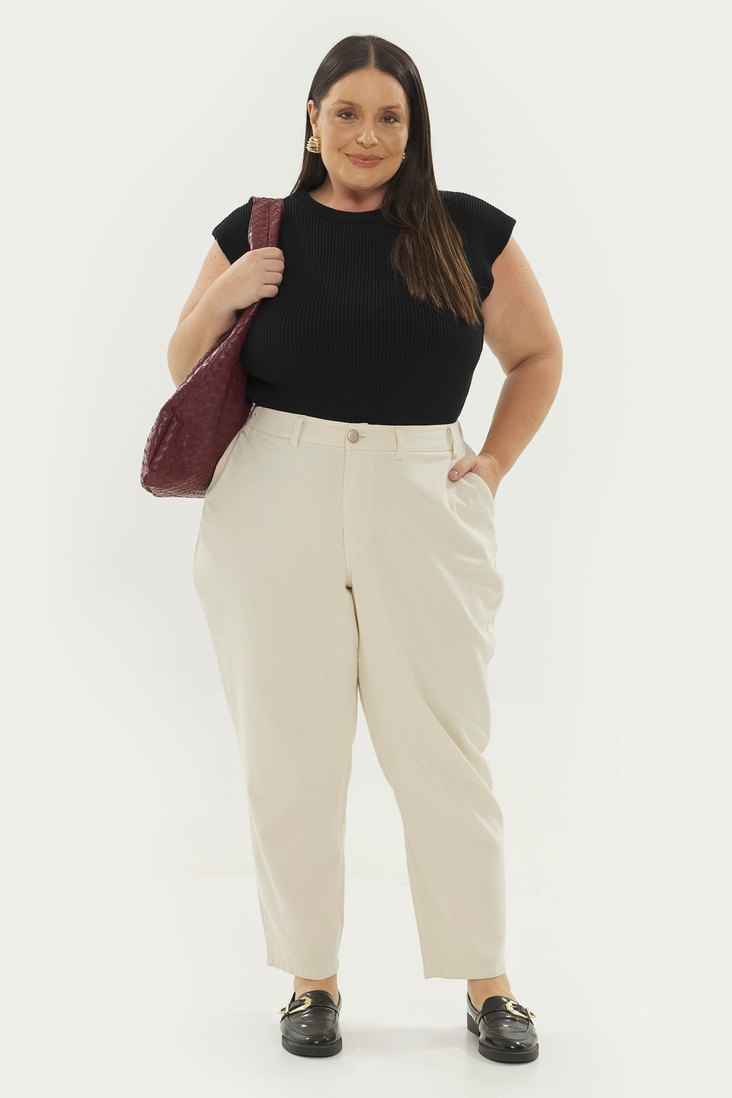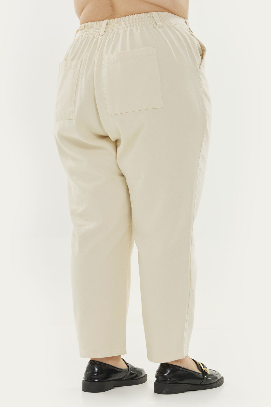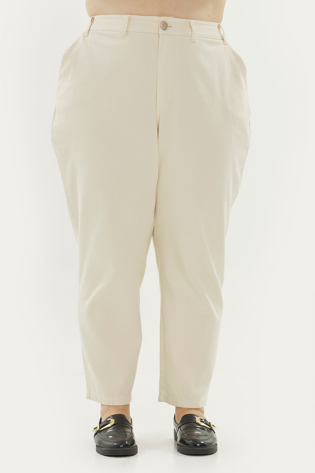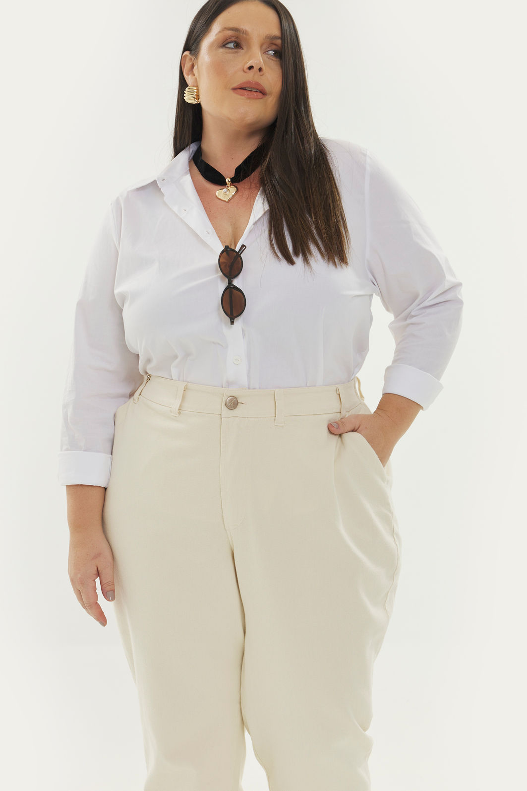 Calça feminina com modelagem reta confeccionada em tecido 100% algodão. A peça possui cintura alta, cós traseiro com elástico, passantes para cinto, bolsos funcionais, caimento reto, acabamento pespontado, fechamento frontal por zíper e botão. Modelagem especializada para corpos plus & curve size.