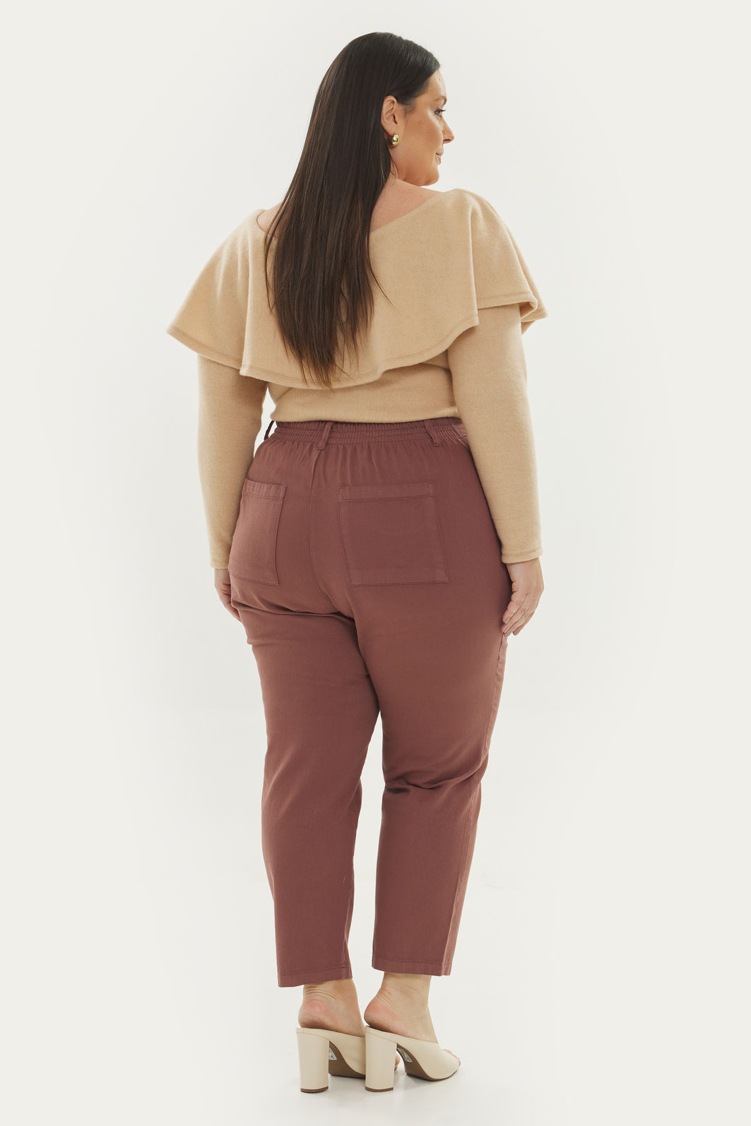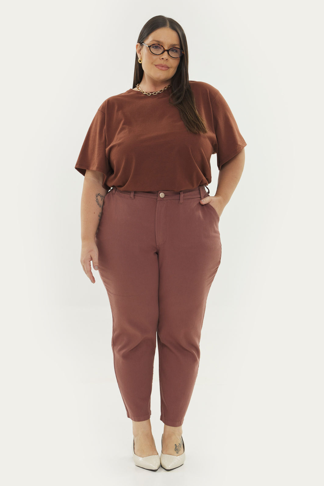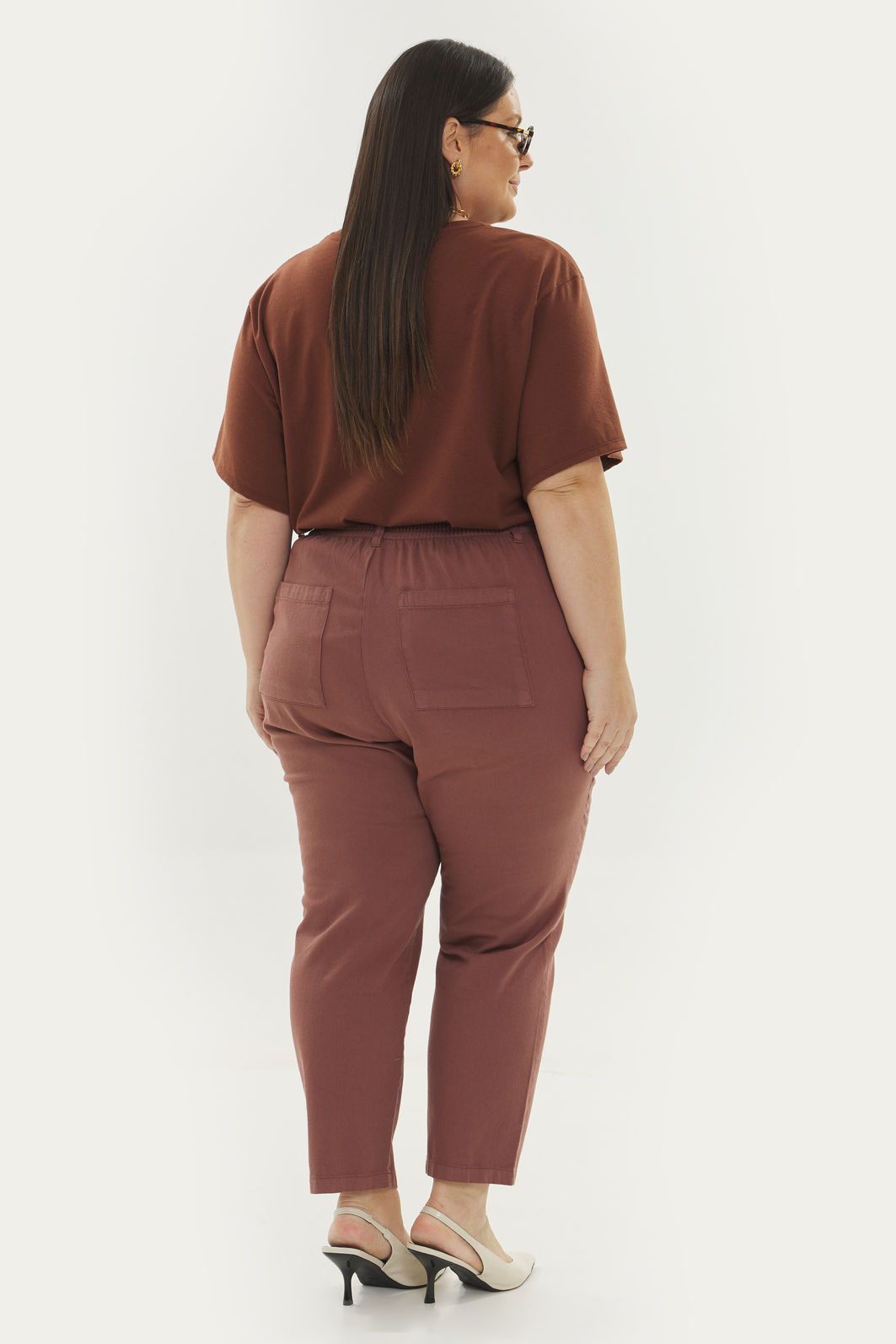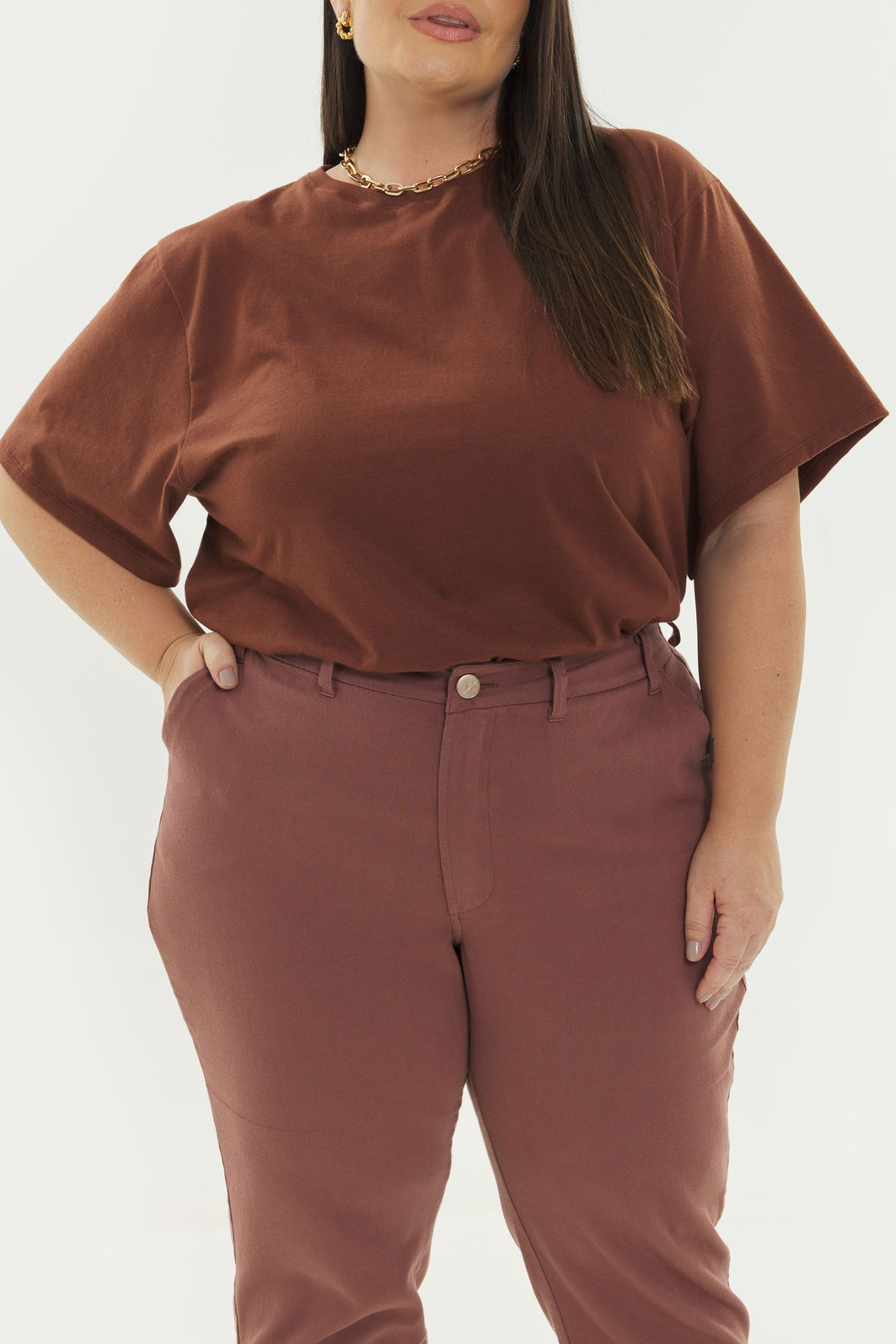Calça feminina com modelagem reta confeccionada em tecido 100% algodão. A peça possui cintura alta, cós traseiro com elástico, passantes para cinto, bolsos funcionais, caimento reto, acabamento pespontado, fechamento frontal por zíper e botão. Modelagem especializada para corpos plus & curve size.