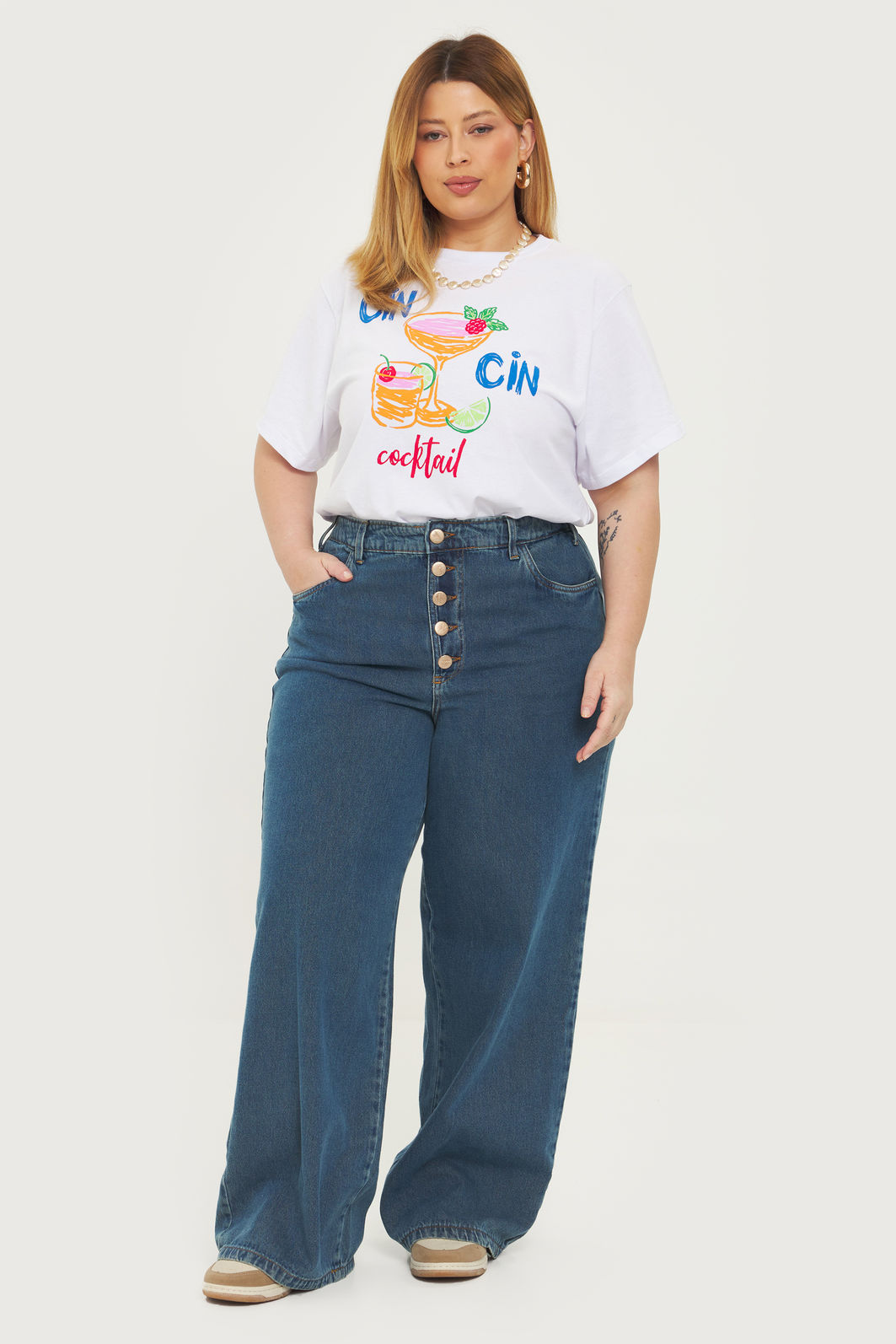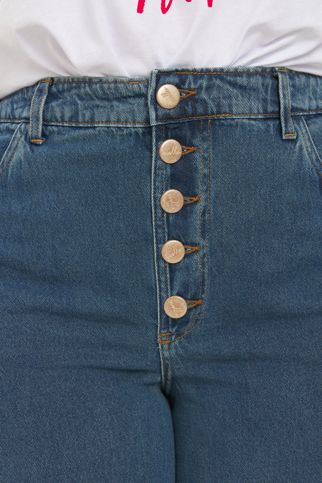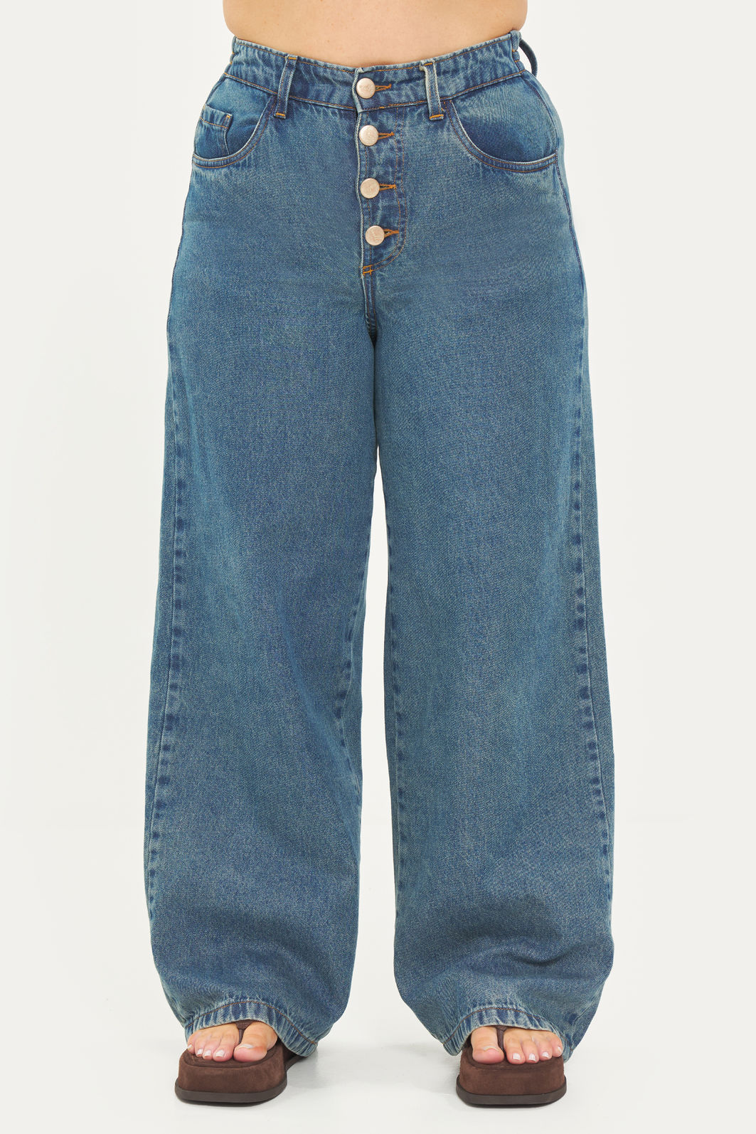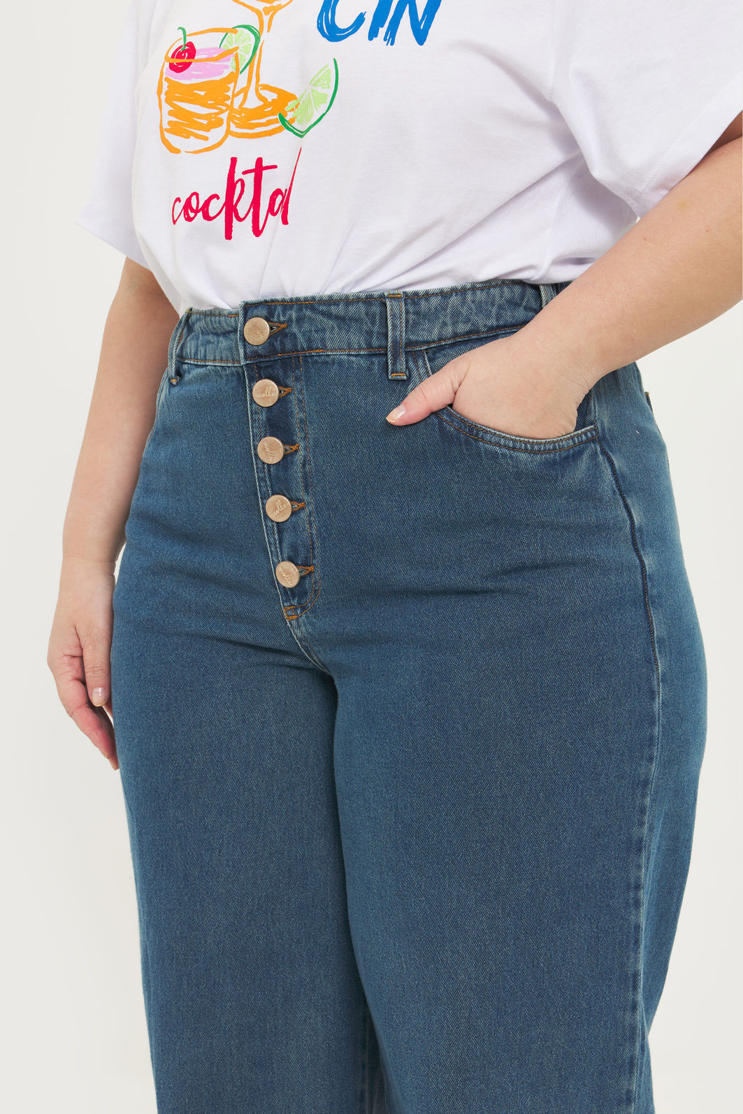Calça pantalona feminina confeccionada em jeans 100% algodão com processo em lavanderia. A peça possui cintura alta, cós traseiro com elástico para melhor adaptação a diferentes corpos, bolsos funcionais, passantes para cinto, fechamento por botões. Modelagem especializada para corpos plus & curve size.