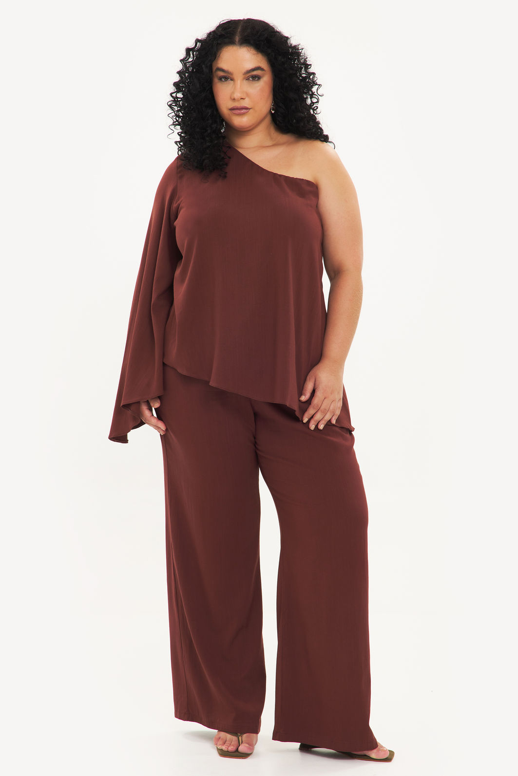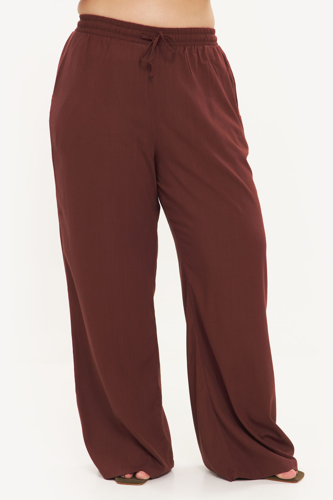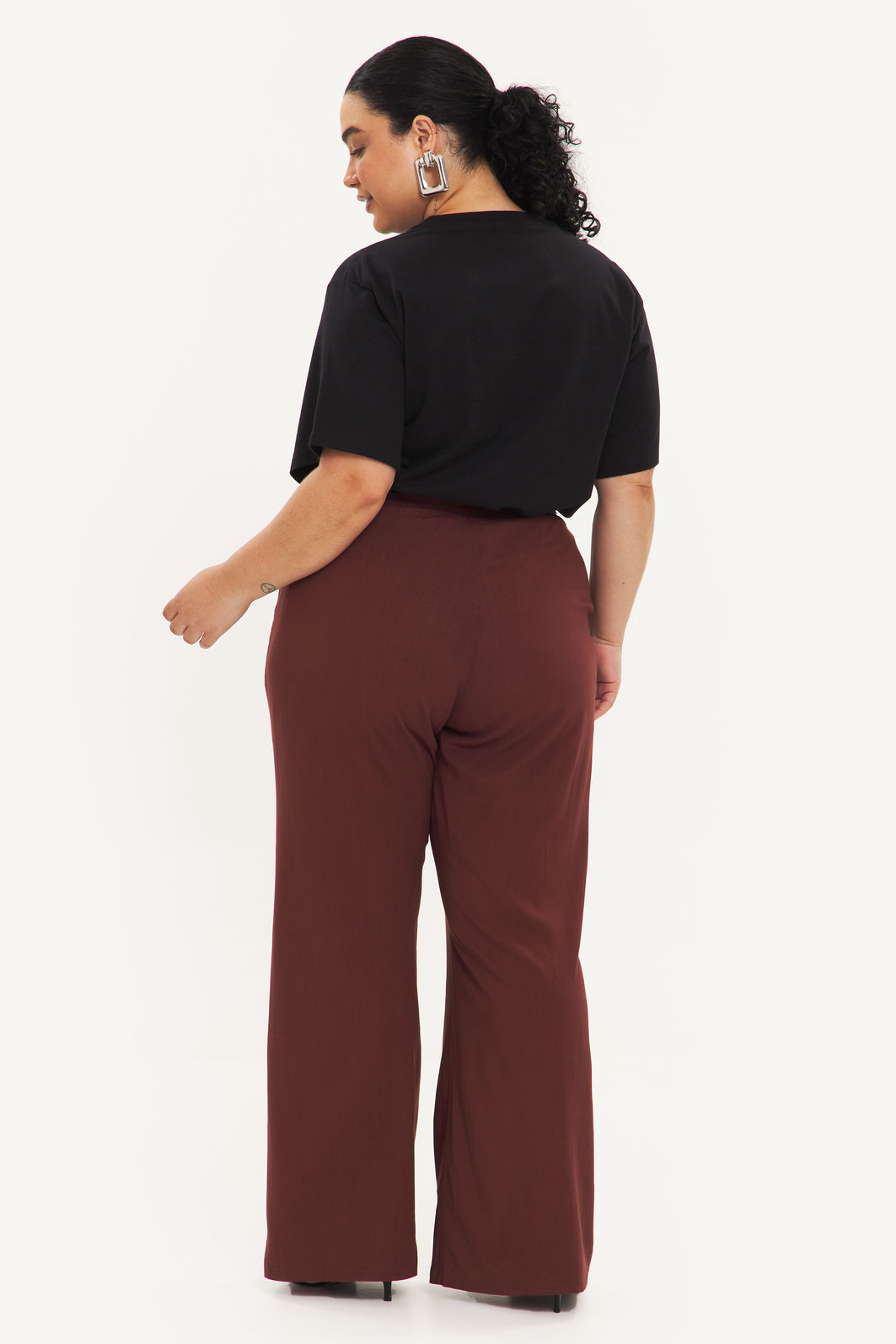 Calça feminina confeccionada em tecido de viscose com elastano. A peça de modelo pantalona possui cintura alta, cós total em elástico para melhor adaptação a diferentes corpos, cordão ajustável, bolsos frontais funcionais, shape solto e caimento reto. Modelagem especializada para corpos plus & curve size.