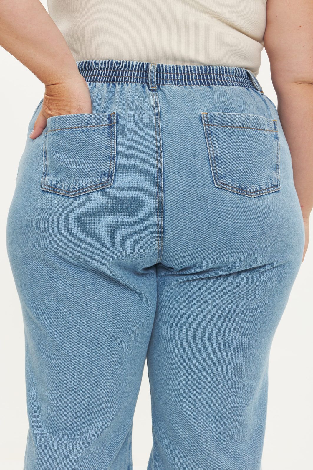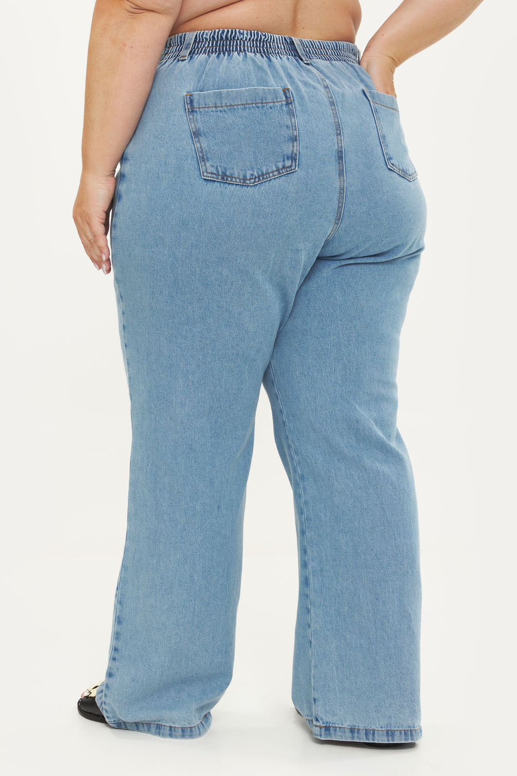 Calça reta feminina confeccionada em jeans 100% algodão com processo em lavanderia. A peça possui cintura alta, cós traseiro com elástico para melhor adaptação a diferentes corpos, bolsos funcionais, passantes para cinto, fechamento por zíper e botão. Modelagem especializada para corpos plus & curve size.