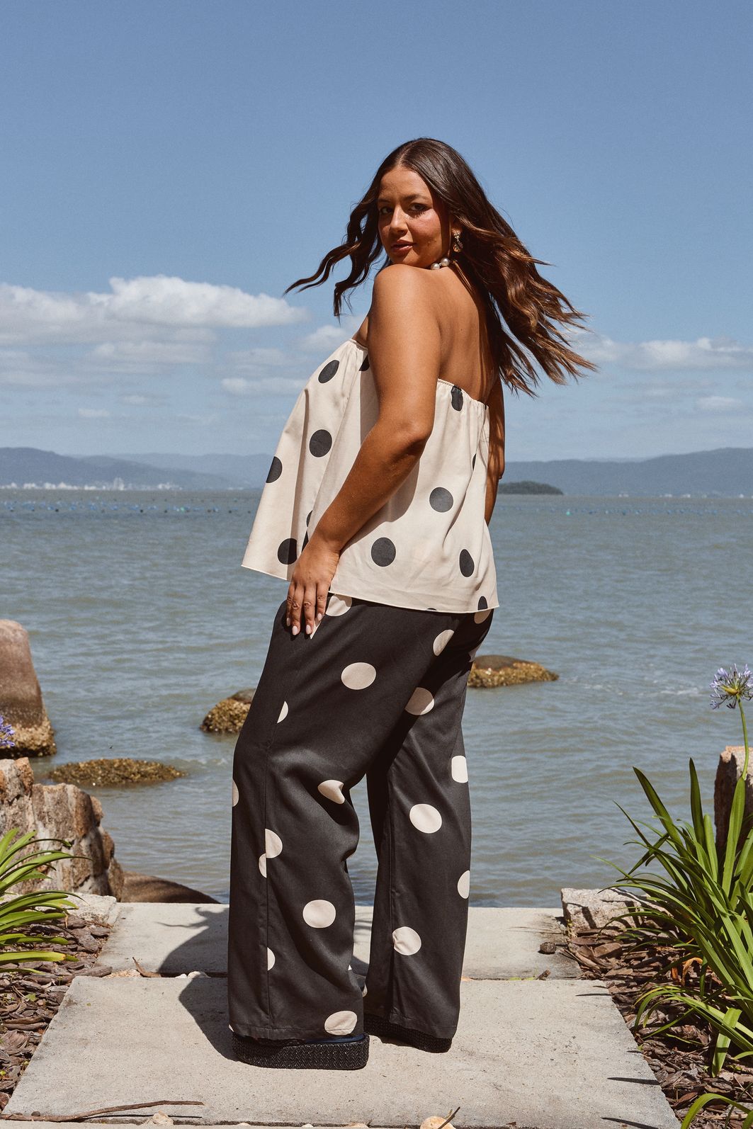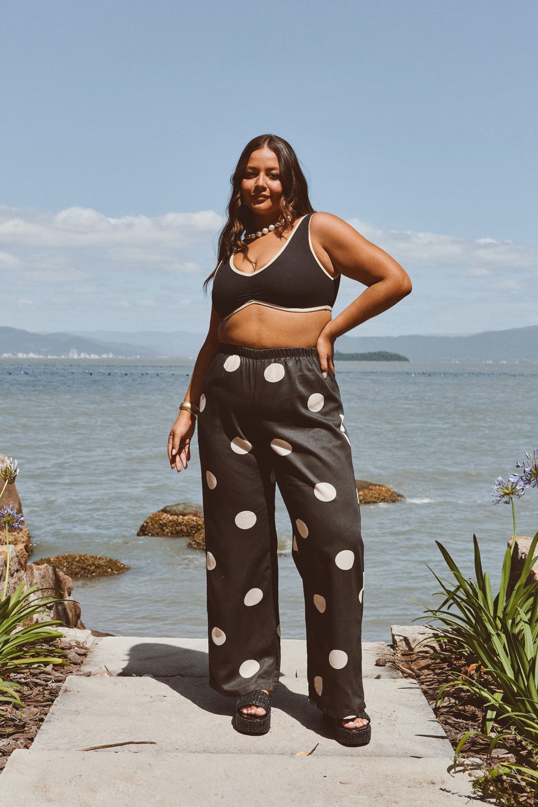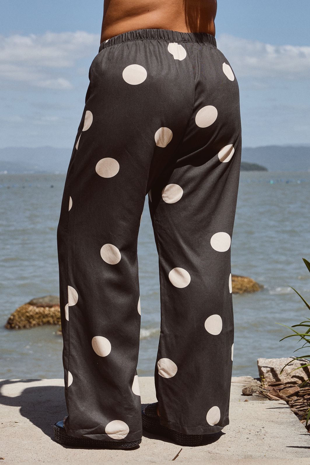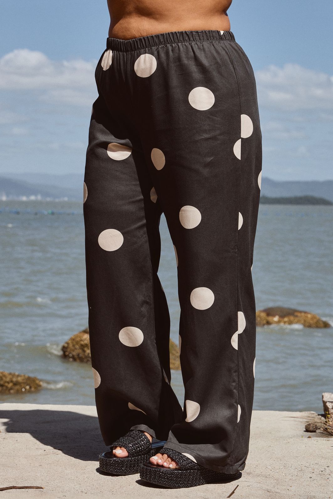 Calça feminina confeccionada em tecido 100% viscose. A peça possui cintura alta, cós total em elástico reforçado para melhor adaptação a diferentes corpos, shape solto e caimento reto. Com estampa exclusiva em cor contrastante. Modelagem especializada para corpos plus & curve size.