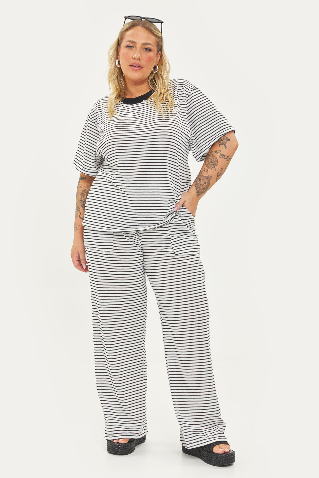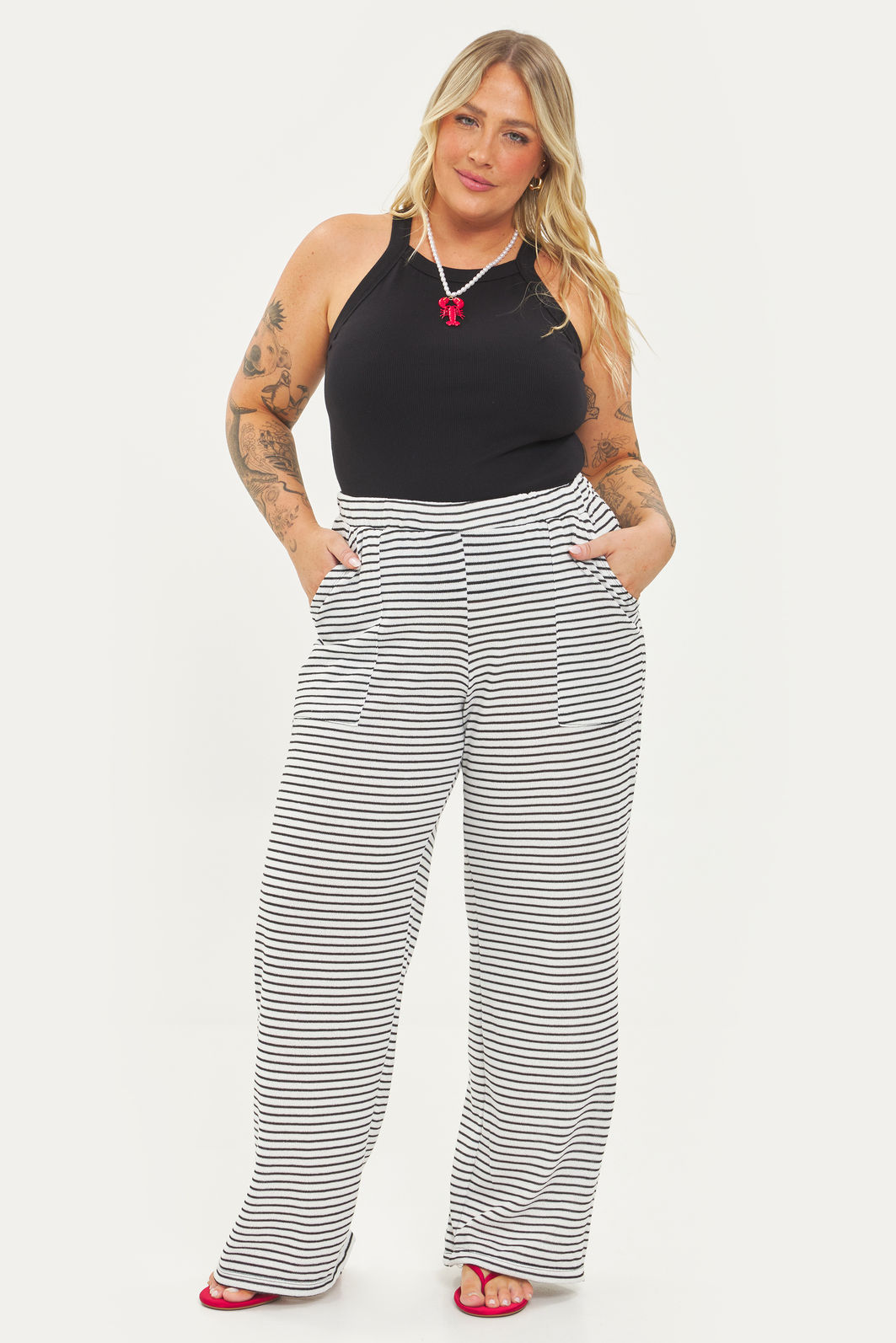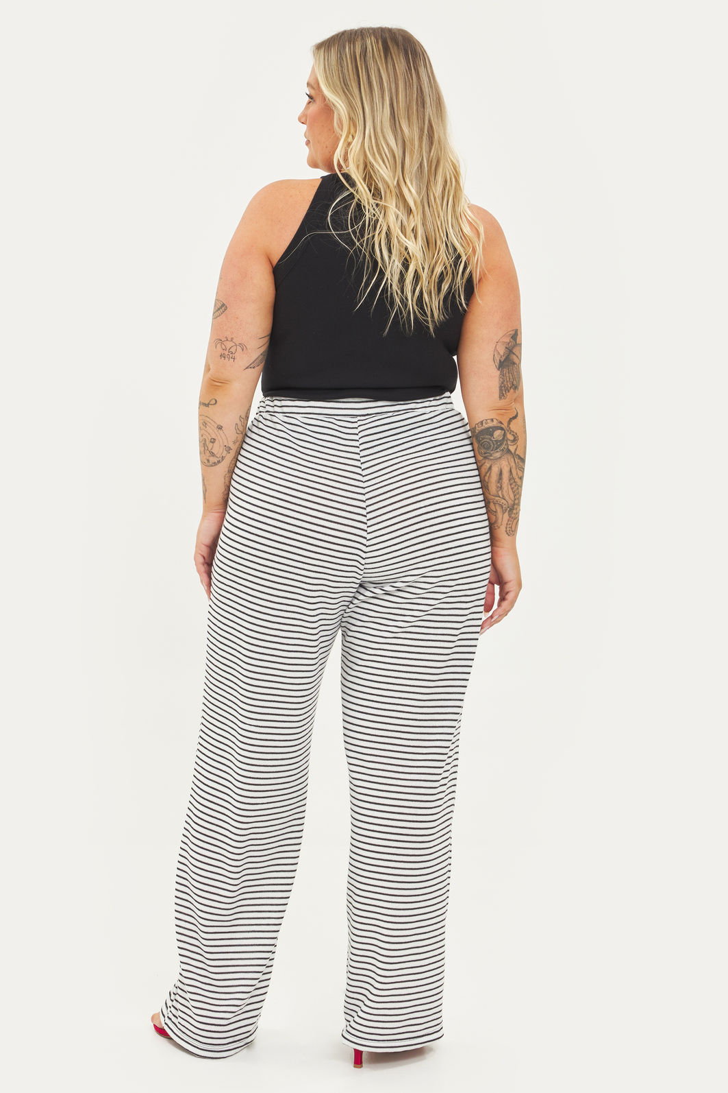 Calça feminina confeccionada em malha de tricot listrada. A peça possui cintura alta, cós total em elástico para melhor adaptação a diferentes corpos, bolsos frontais funcionais, shape solto e caimento reto. Modelagem especializada para corpos plus & curve size.