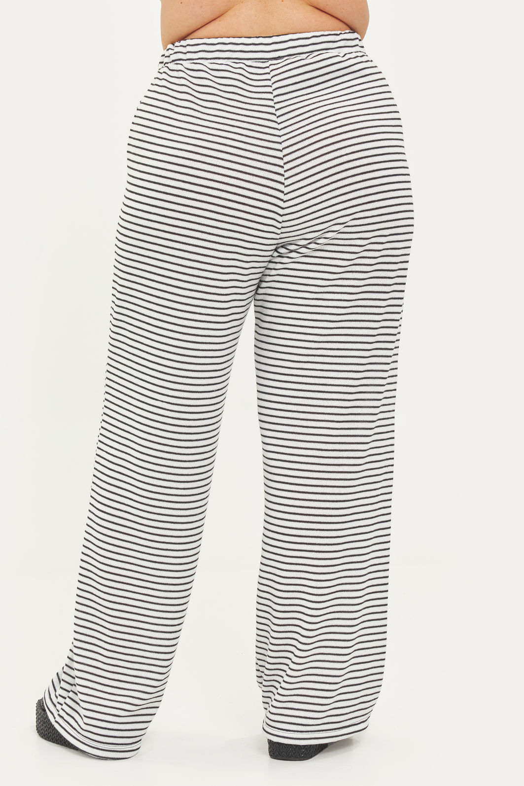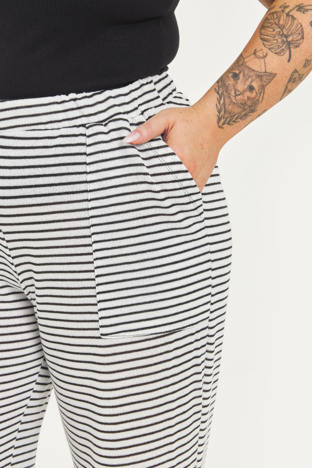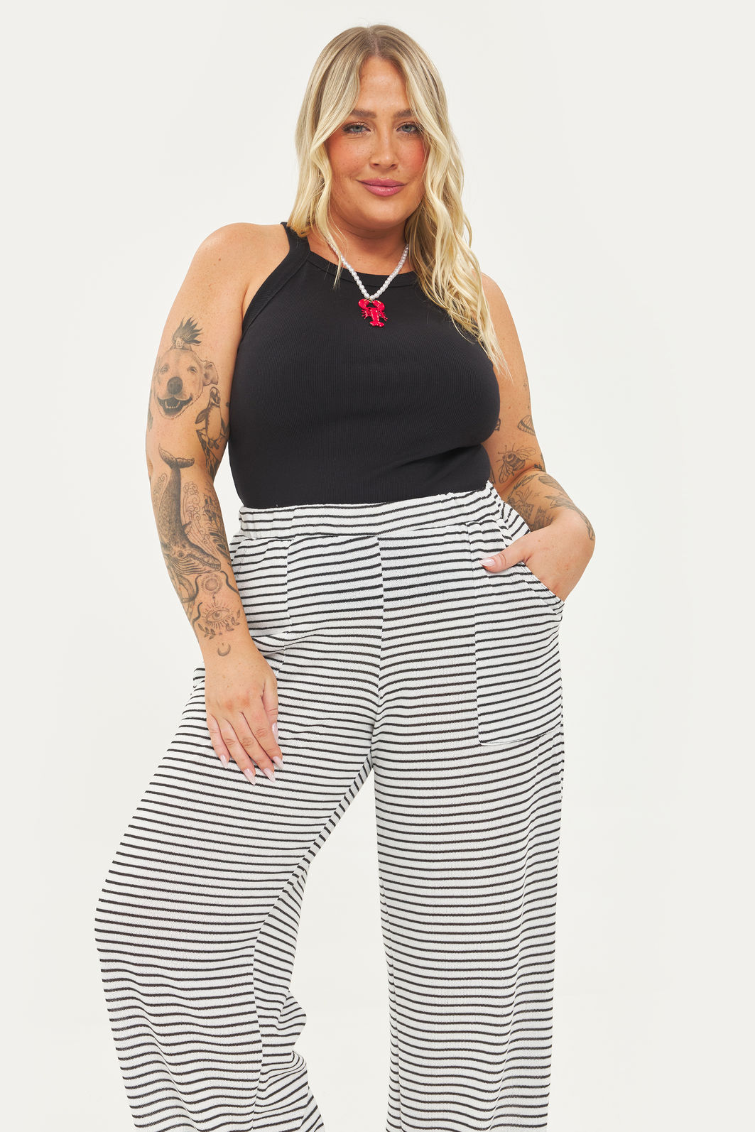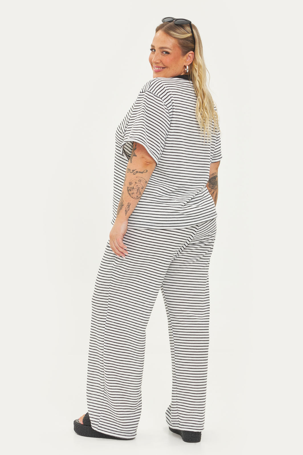 Calça feminina confeccionada em malha de tricot listrada. A peça possui cintura alta, cós total em elástico para melhor adaptação a diferentes corpos, bolsos frontais funcionais, shape solto e caimento reto. Modelagem especializada para corpos plus & curve size.
