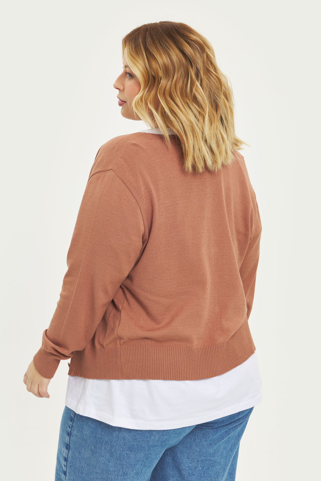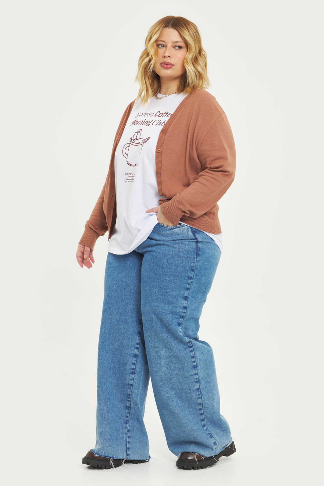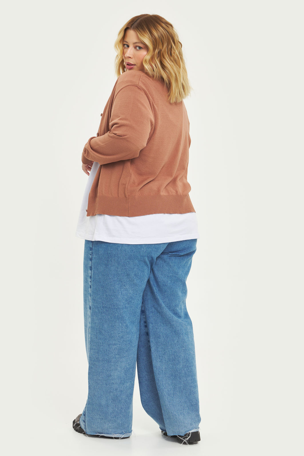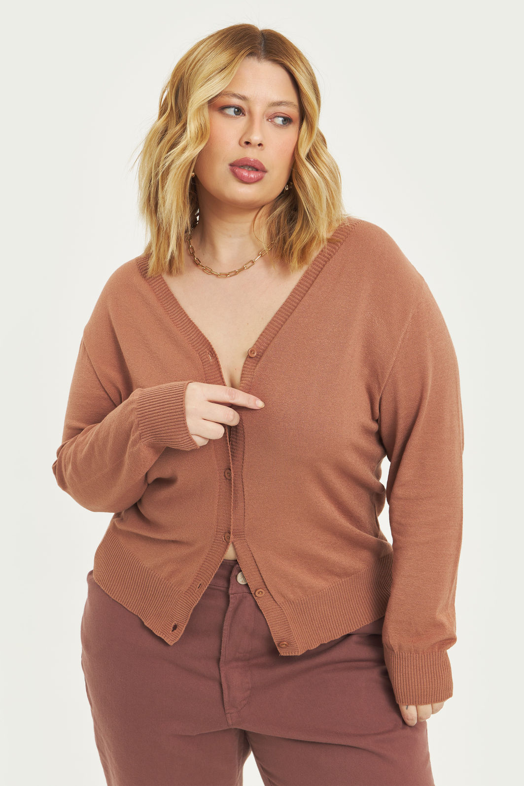 Cardigan feminino confeccionado em tricot. A peça possui mangas longas, caimento reto, fechamento frontal por botão tinto na cor e acabamento canelado. Modelagem especializada para corpos plus & curve size.