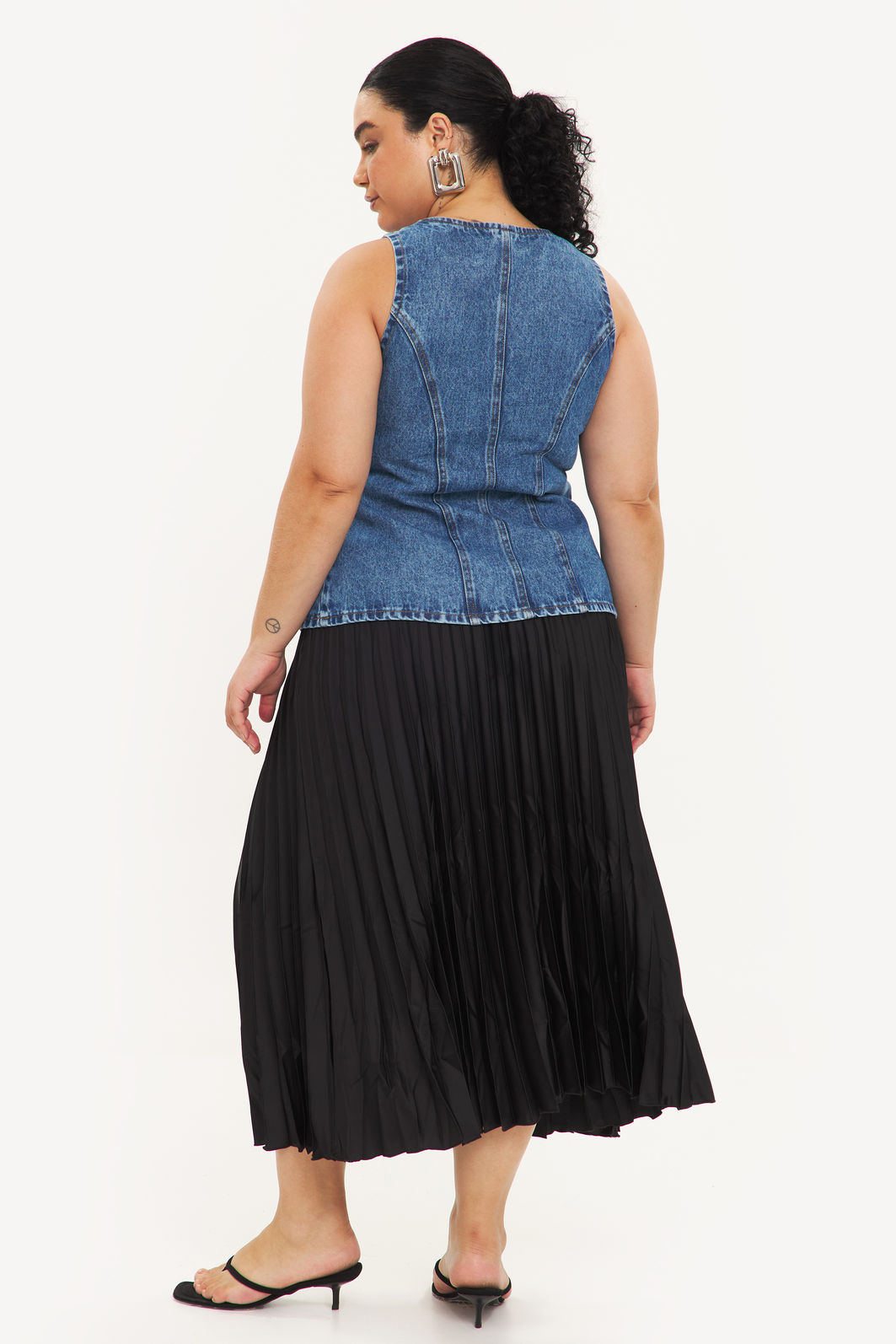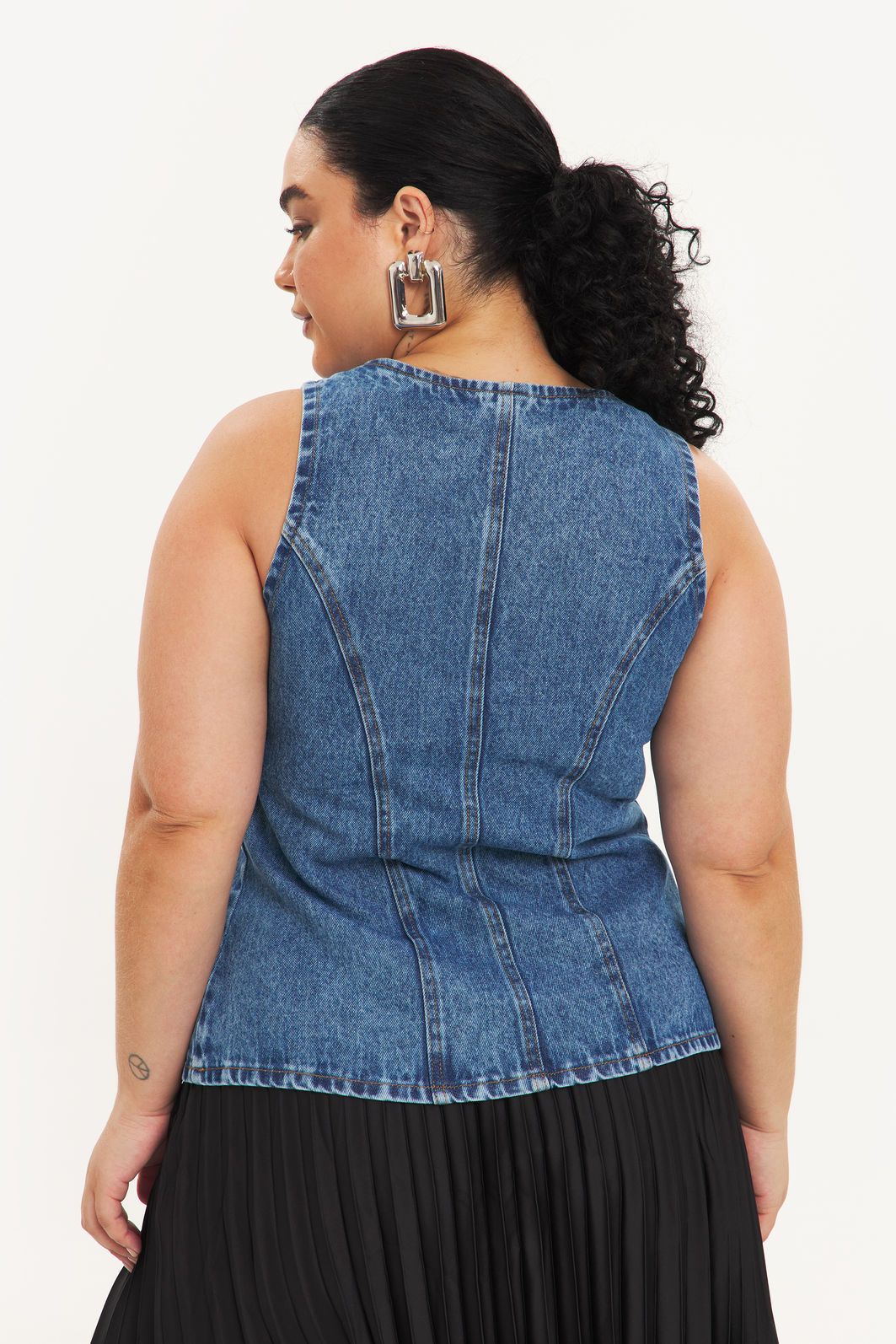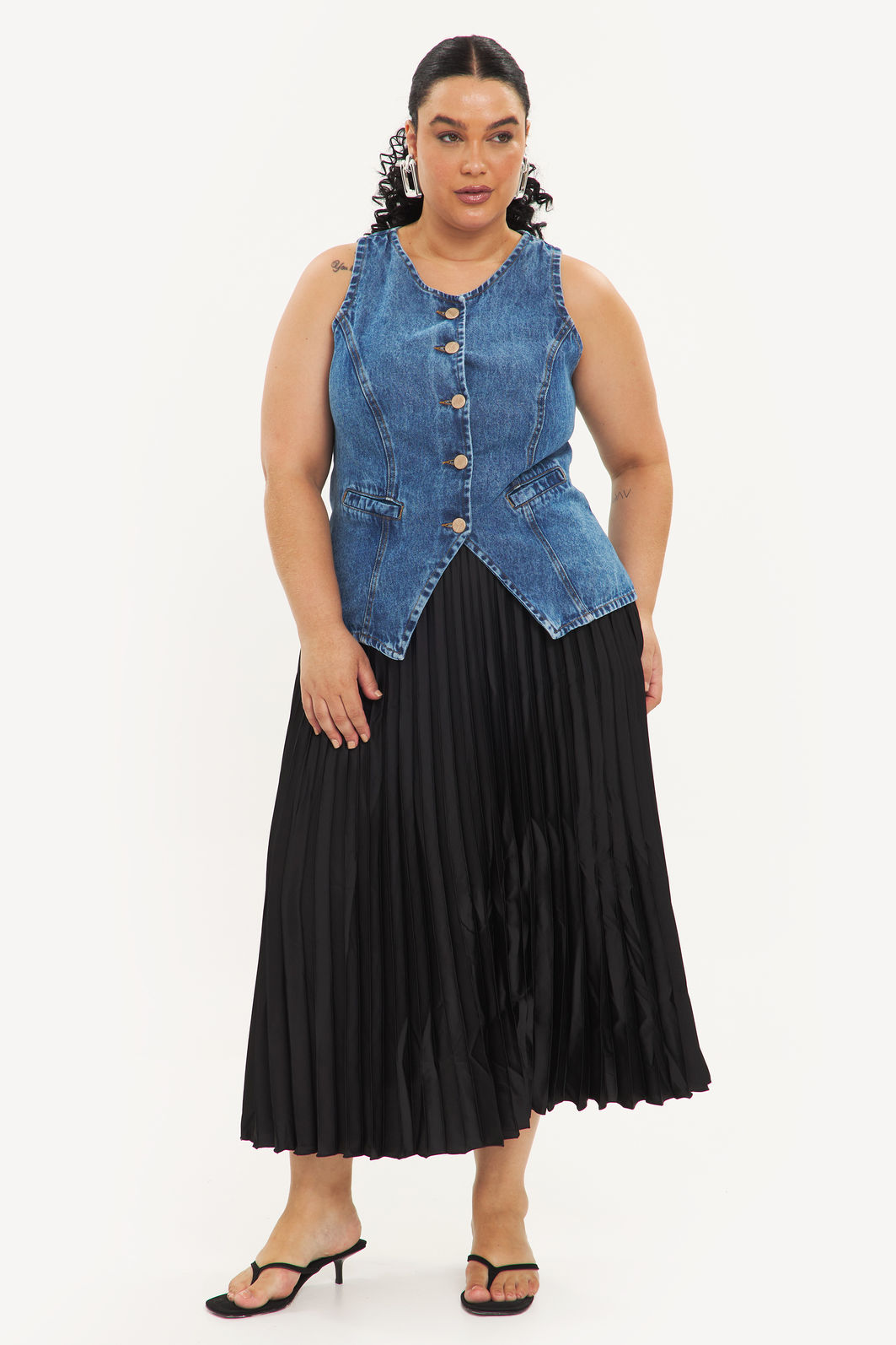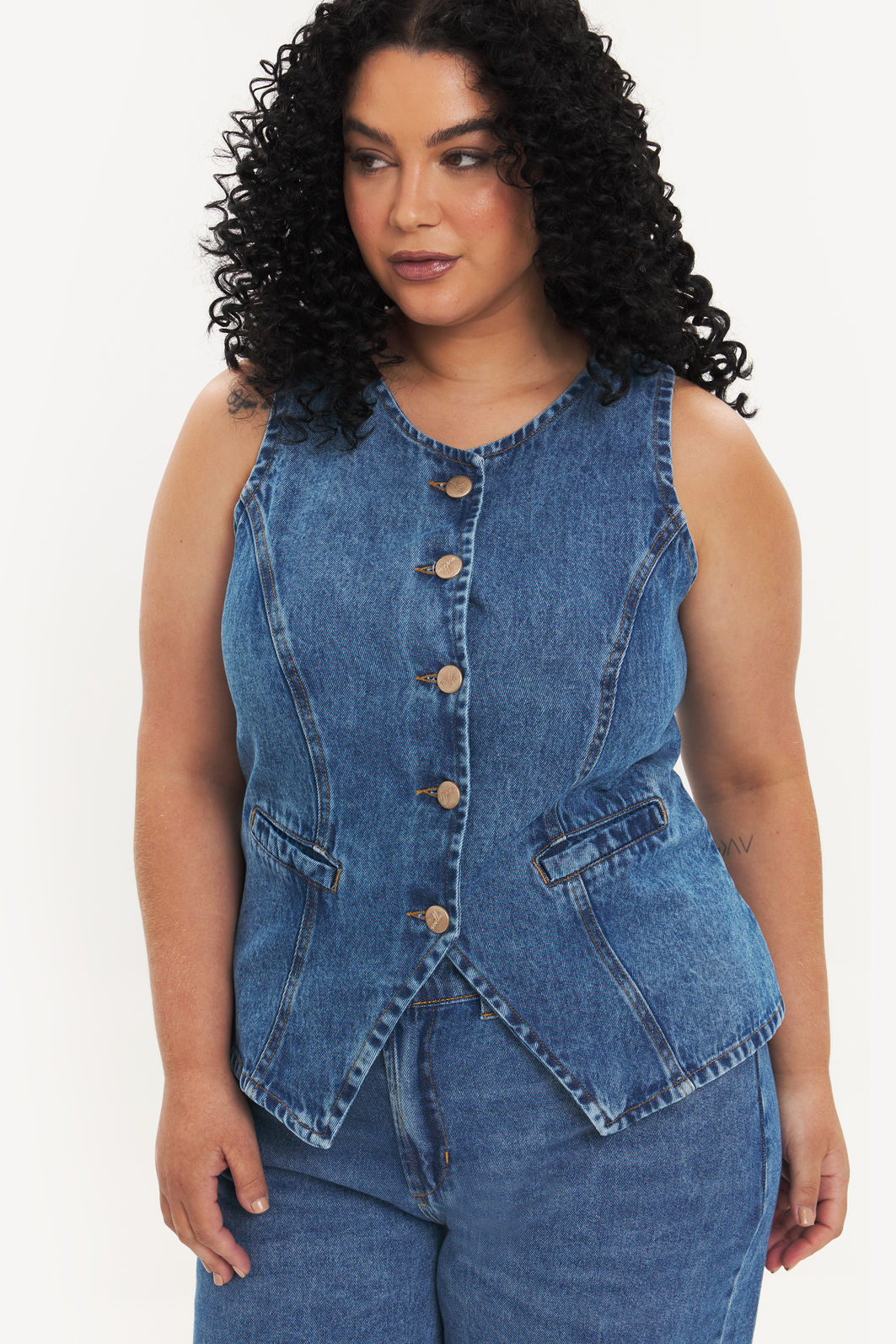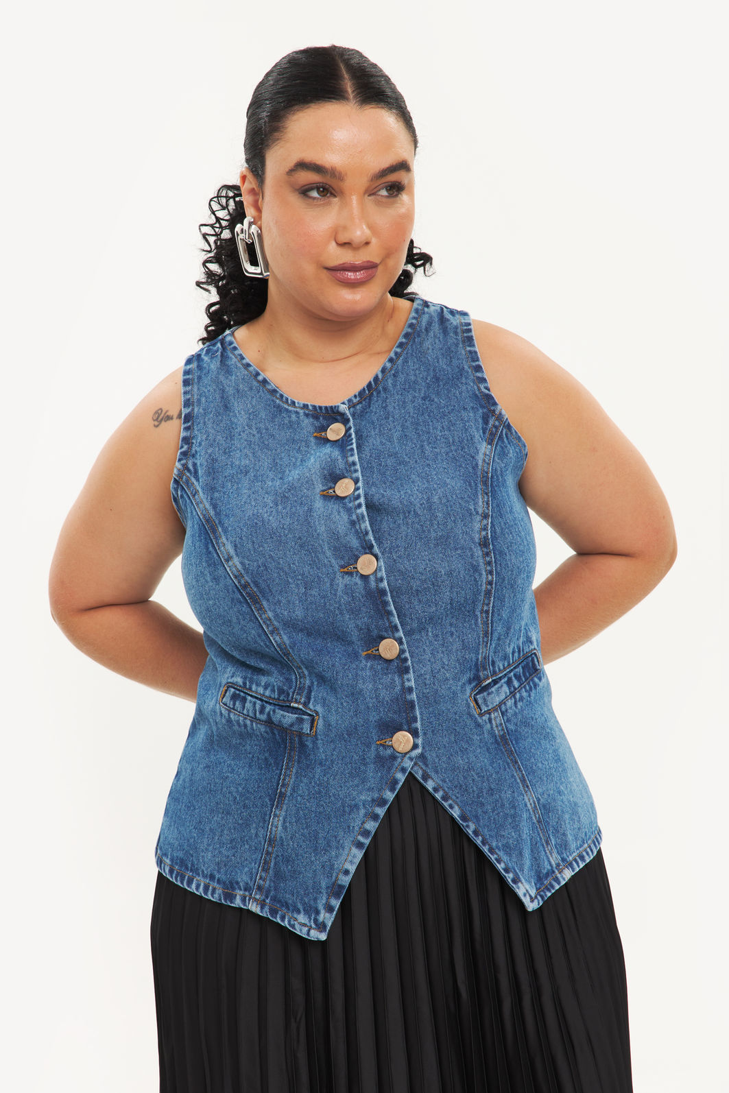 Colete feminino confeccionada em jeans 100% algodão com processo em lavanderia. A peça possui cavas regulares, bolso falso frontal, recorte frontal e posteriores, shape ajustado, acabamentos pespontados e fechamento frontal em abotoamento. Modelagem especializada para corpos plus & curve size.