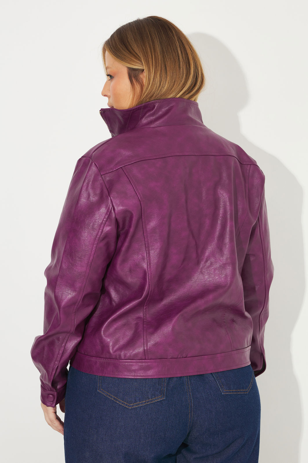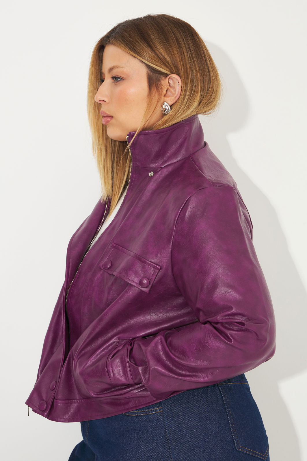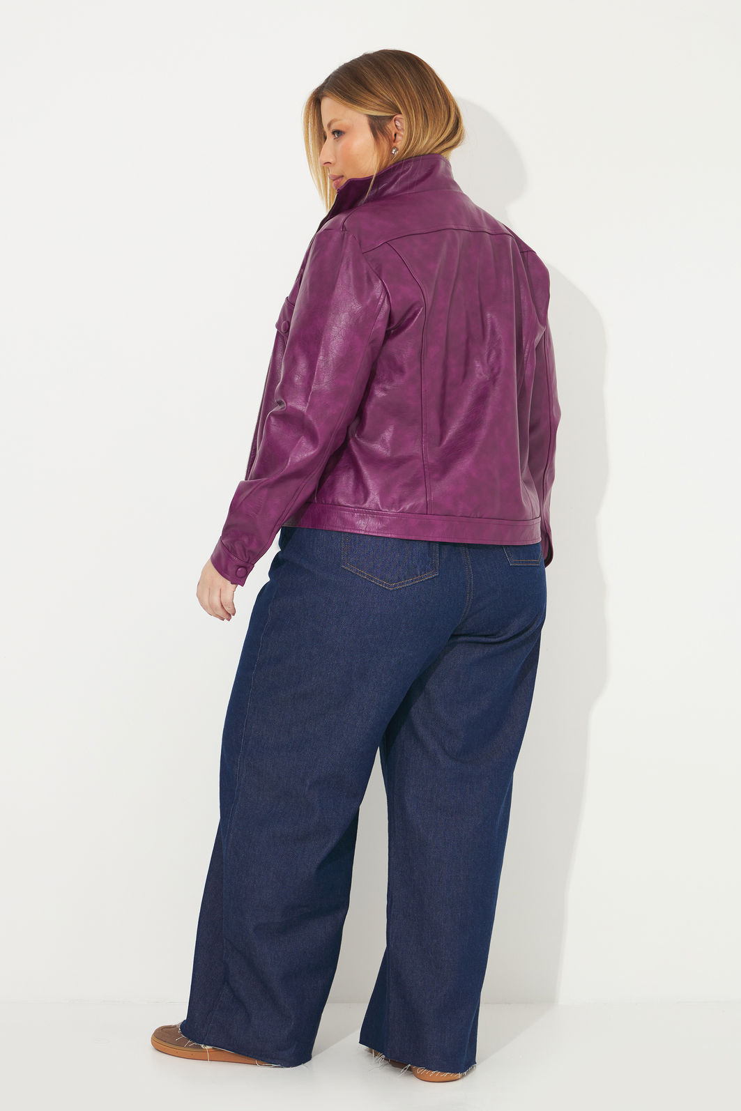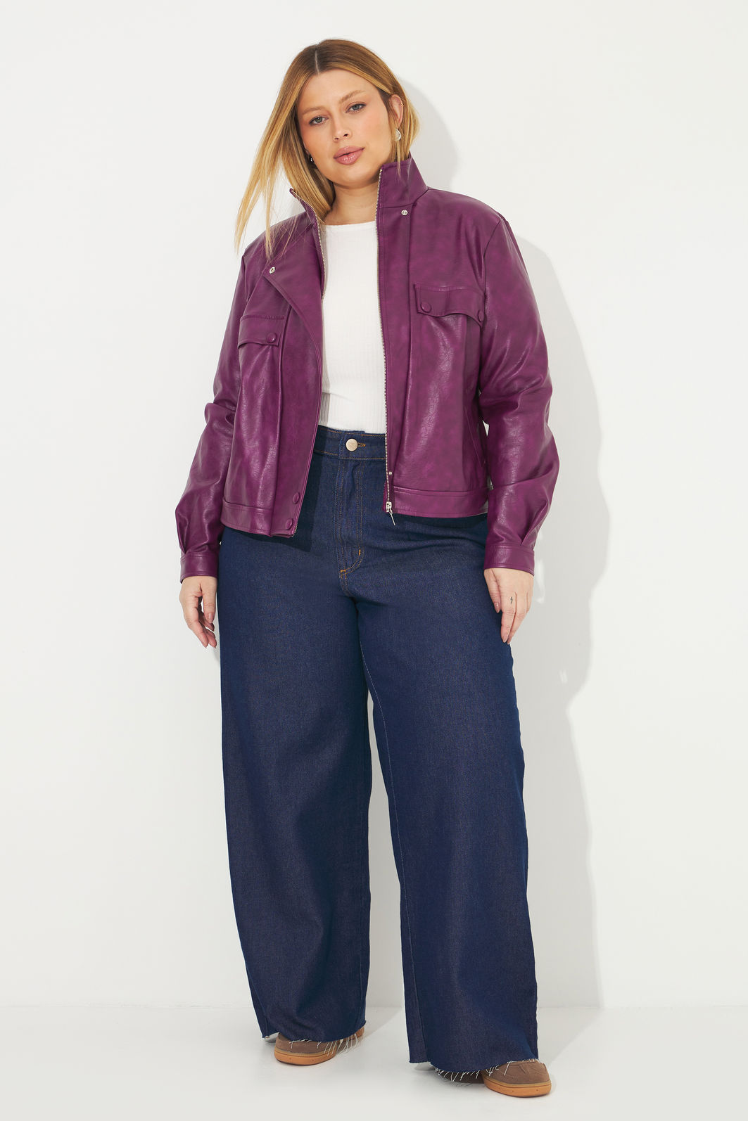 Jaqueta feminina confeccionada em tecido de viscose com revestimento de poliuretano. A peça possui mangas longas com abertura e botões nos punhos, detalhe de lapela frente, detalhes com botões de pressão, shape solto, bolsos funcionais e fechamento frontal por zíper. Modelagem especializada para corpos plus & curve size.