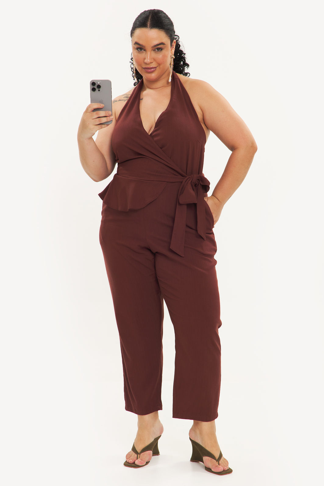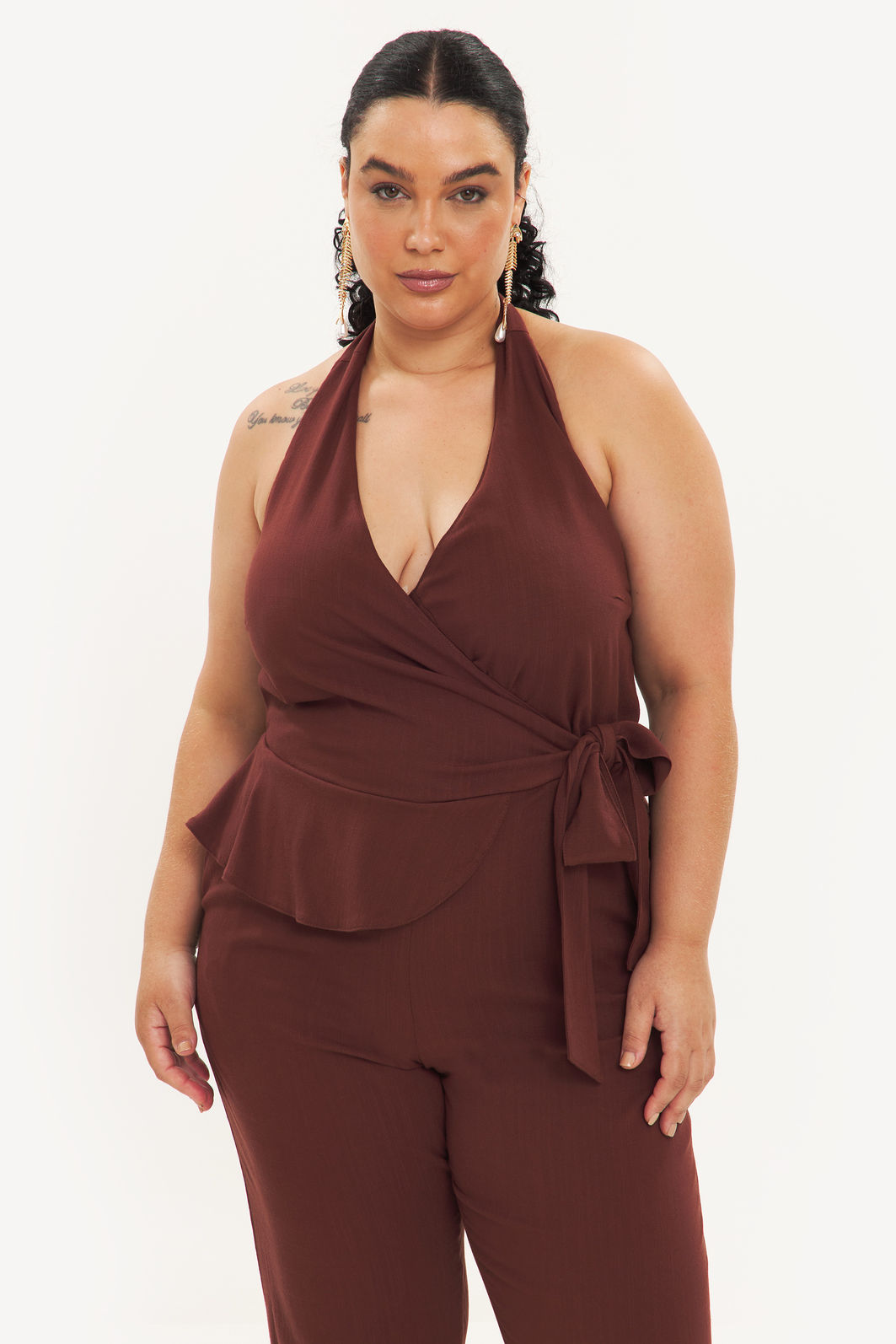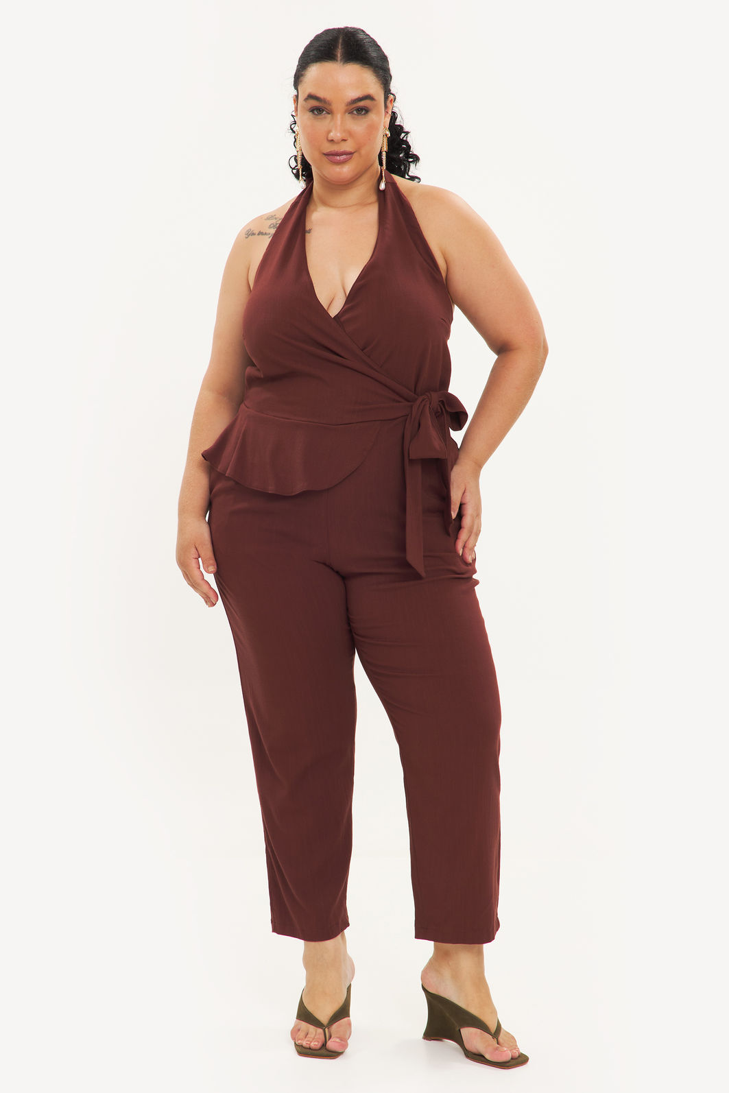 Macacão feminino confeccionado em tecido de viscose com elastano. A peça de modelo frente única, amarração em formato de laço na nuca, decote v, cintura com detalhe de babado e faixa para amarração, bolsos frontais funcionais, comprimento longo, shape solto e caimento reto. Modelagem especializada para corpos plus & curve size.