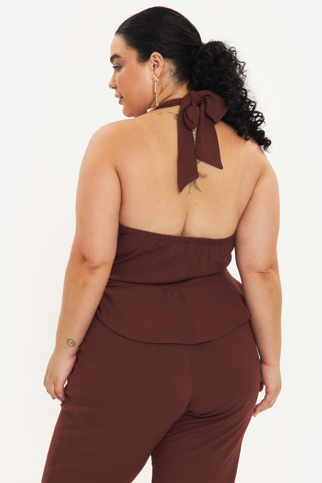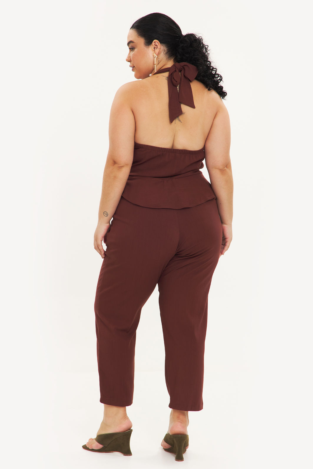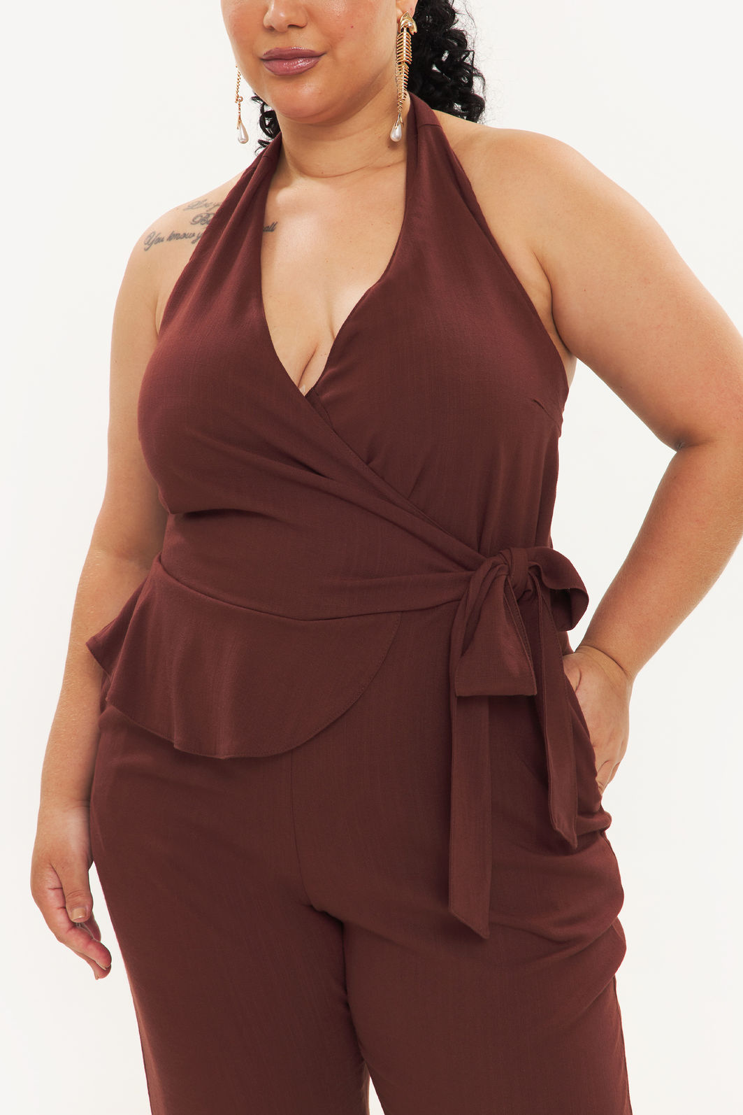 Macacão feminino confeccionado em tecido de viscose com elastano. A peça de modelo frente única, amarração em formato de laço na nuca, decote v, cintura com detalhe de babado e faixa para amarração, bolsos frontais funcionais, comprimento longo, shape solto e caimento reto. Modelagem especializada para corpos plus & curve size.
