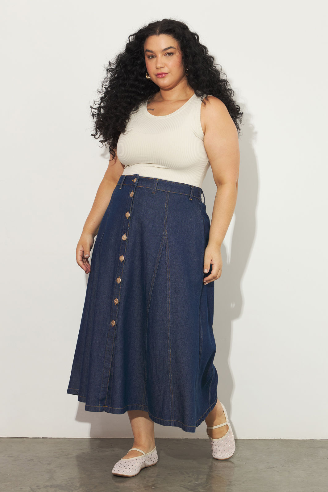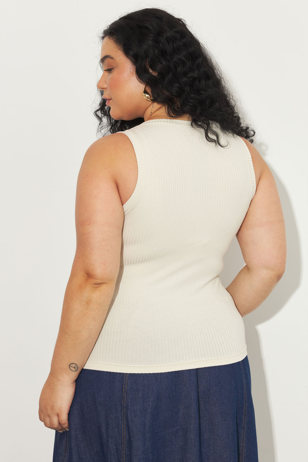 Regata canelada feminina confeccionada em viscose com elastano. A peça possui decote redondo, alças médias, shape justo e caimento reto. Modelagem especializada para corpos plus & curve size.