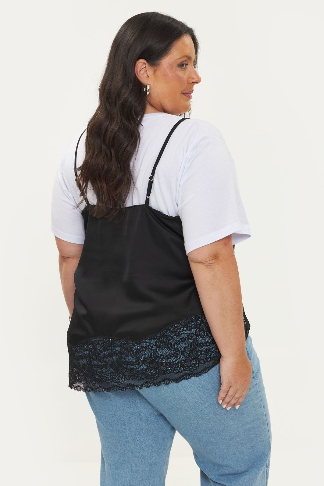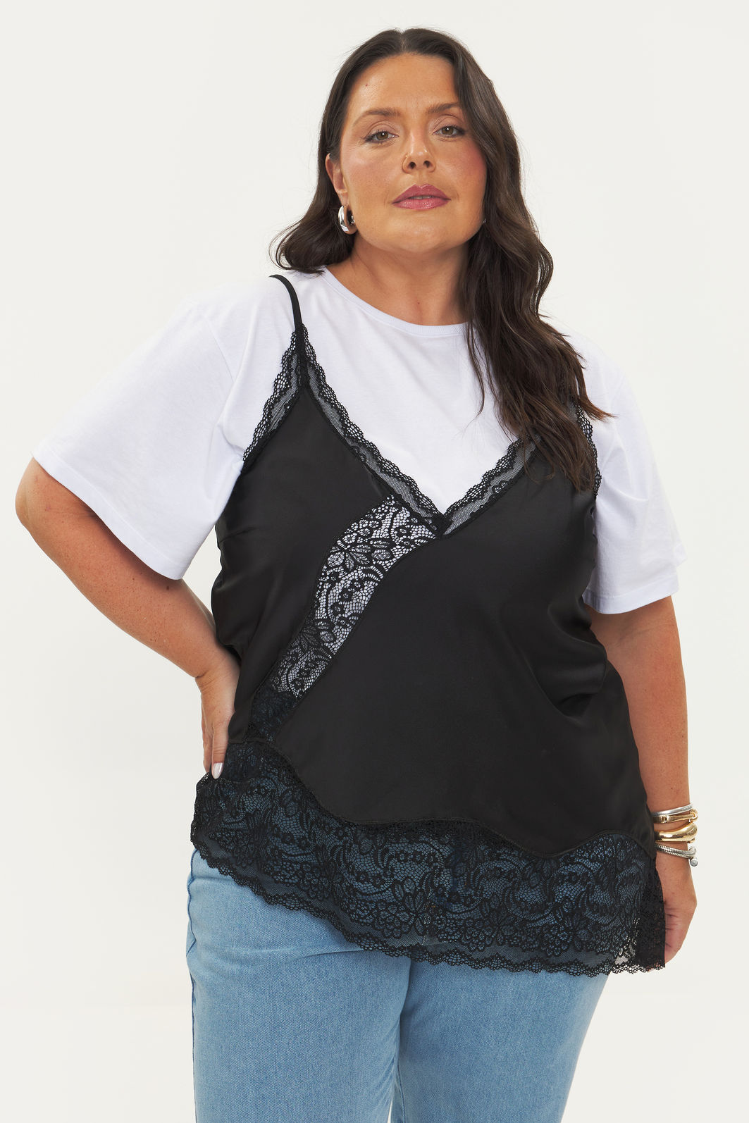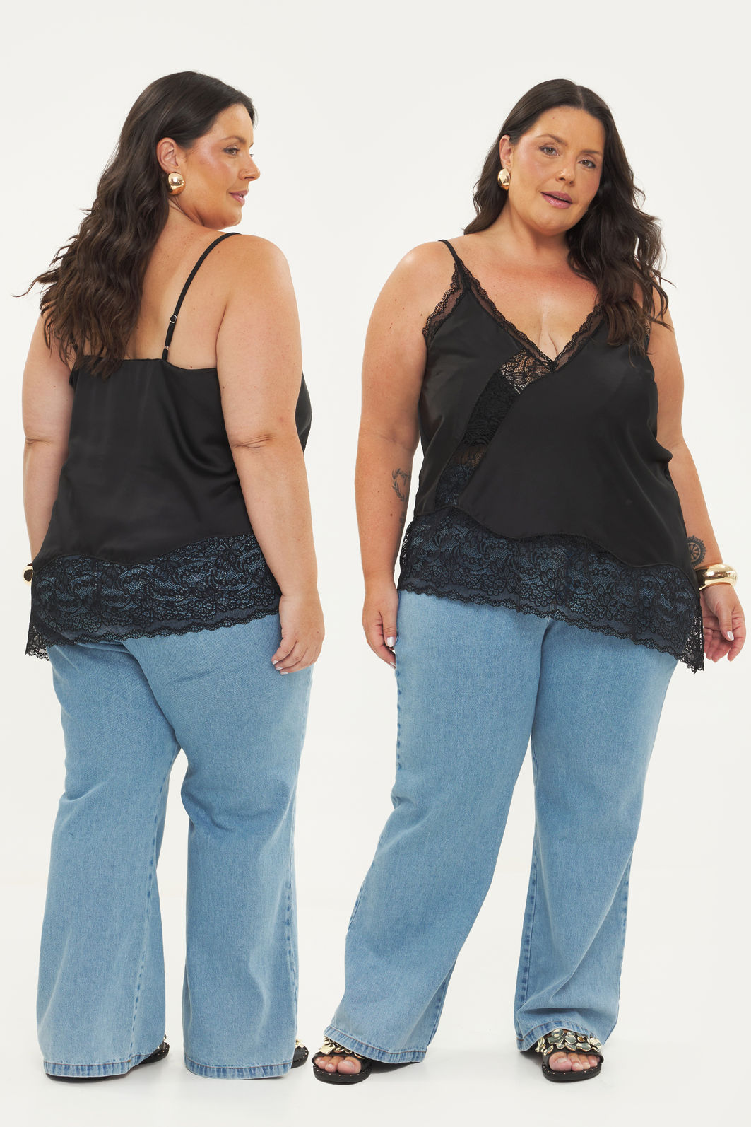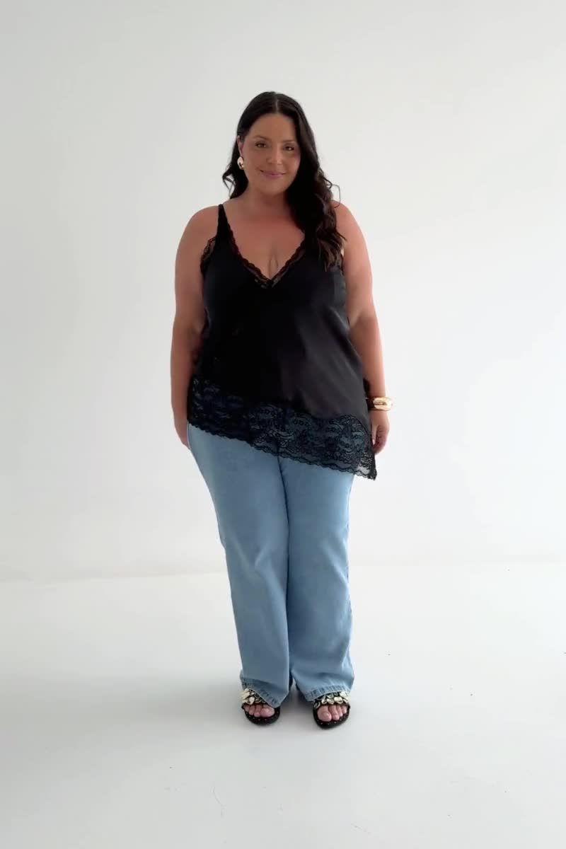 Regata feminina confeccionada em tecido acetinado. A peça de modelo assimétrico possui alças finas com regulagem, detalhes em renda, decote v e shape levemente solto. Modelagem especializada para corpos plus & curve size.