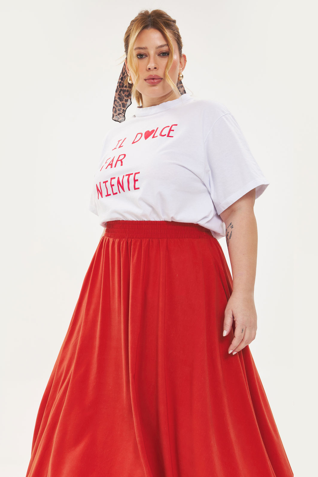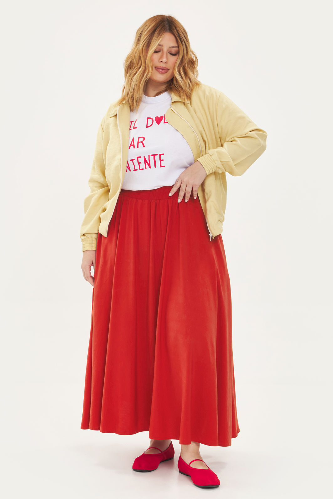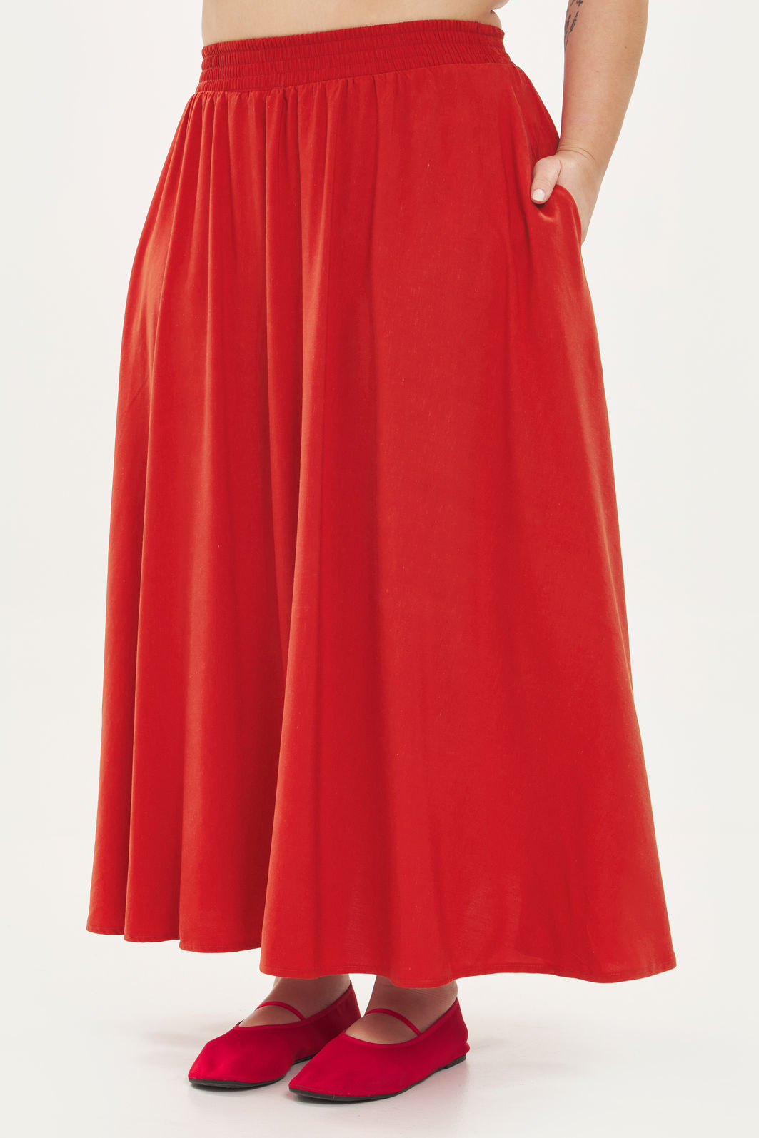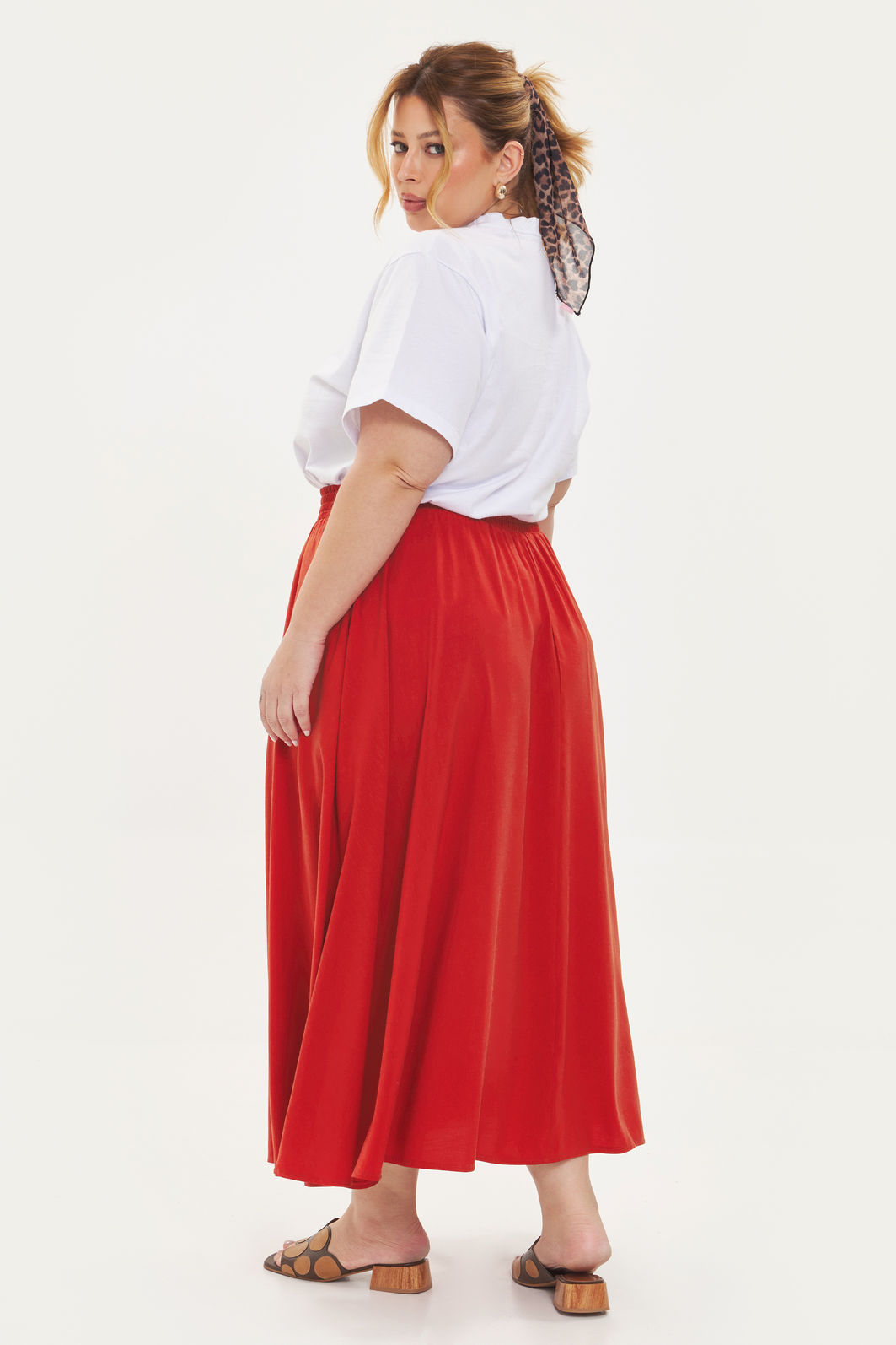 Saia midi feminina confeccionada em tecido de viscose com linho. A peça possui comprimento midi, shape evasê e cós total em elástico para melhor adaptação a diferentes corpos, bolsos frontais funcionais. Modelagem especializada para corpos plus & curve size.