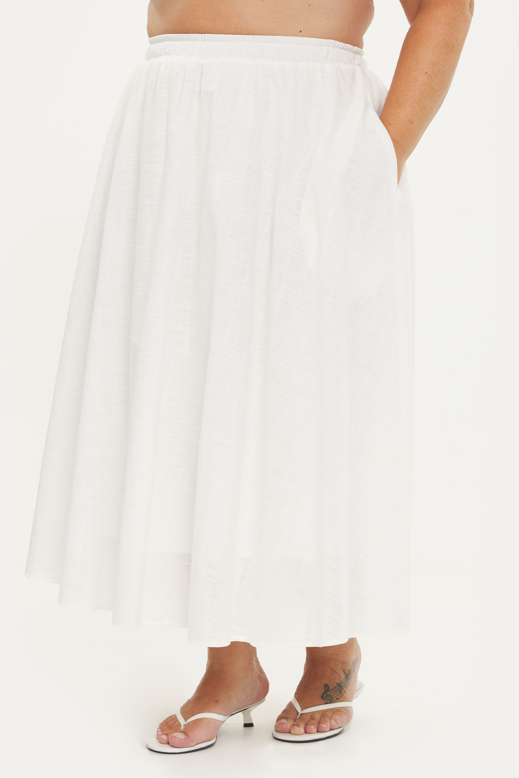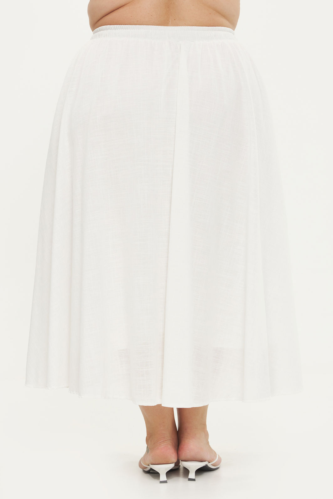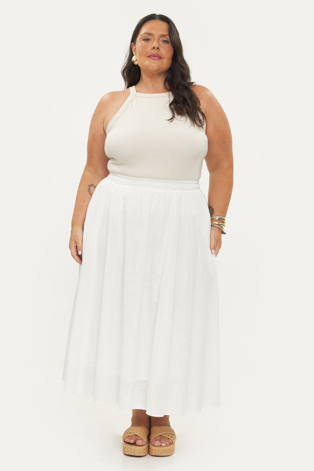Saia feminina confeccionada em tecido 100% algodão. A peça possui forro, comprimento midi, bolsos frontais funcionais, shape evasê e cós total em elástico para melhor adaptação a diferentes corpos. Modelagem especializada para corpos plus & curve size.
