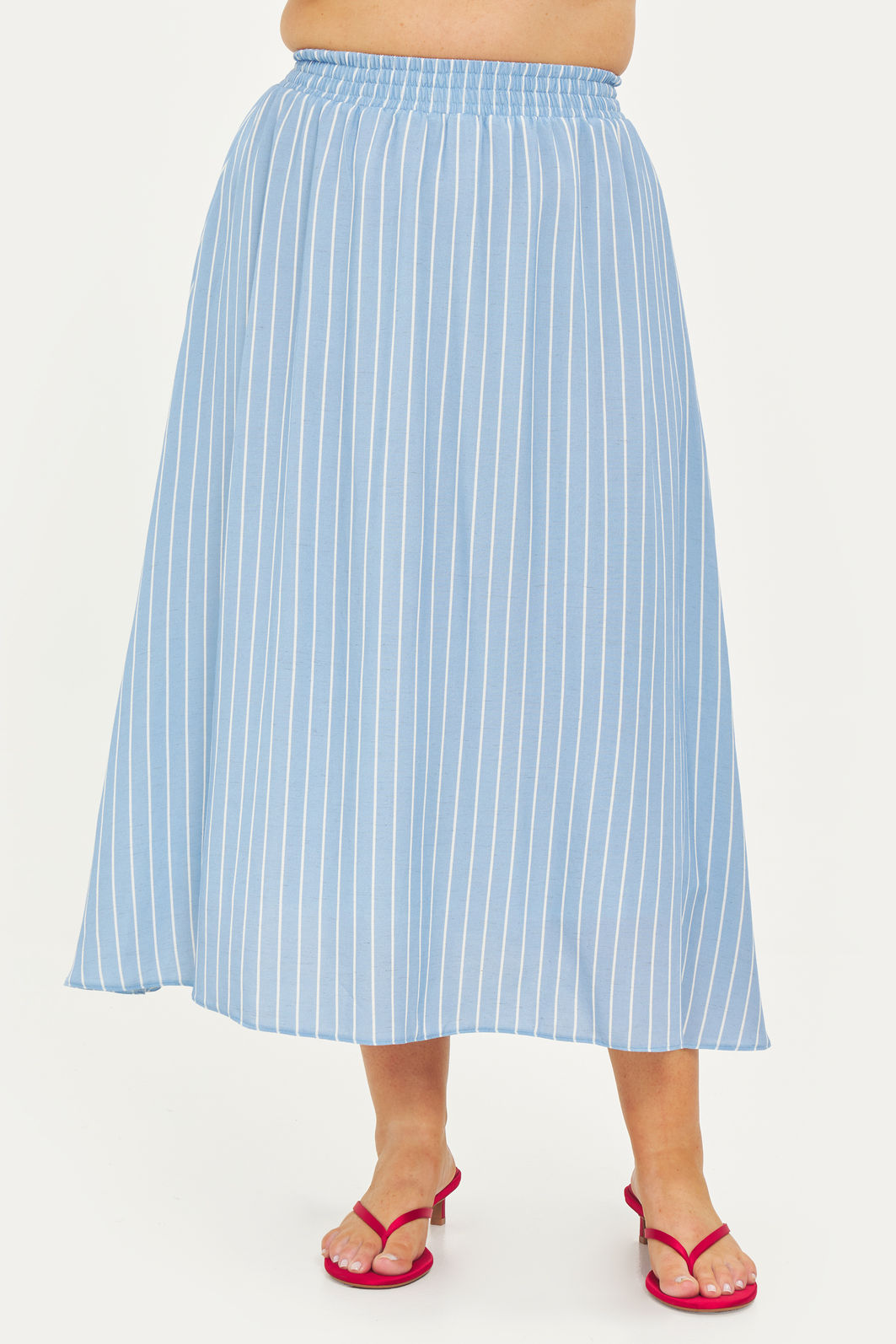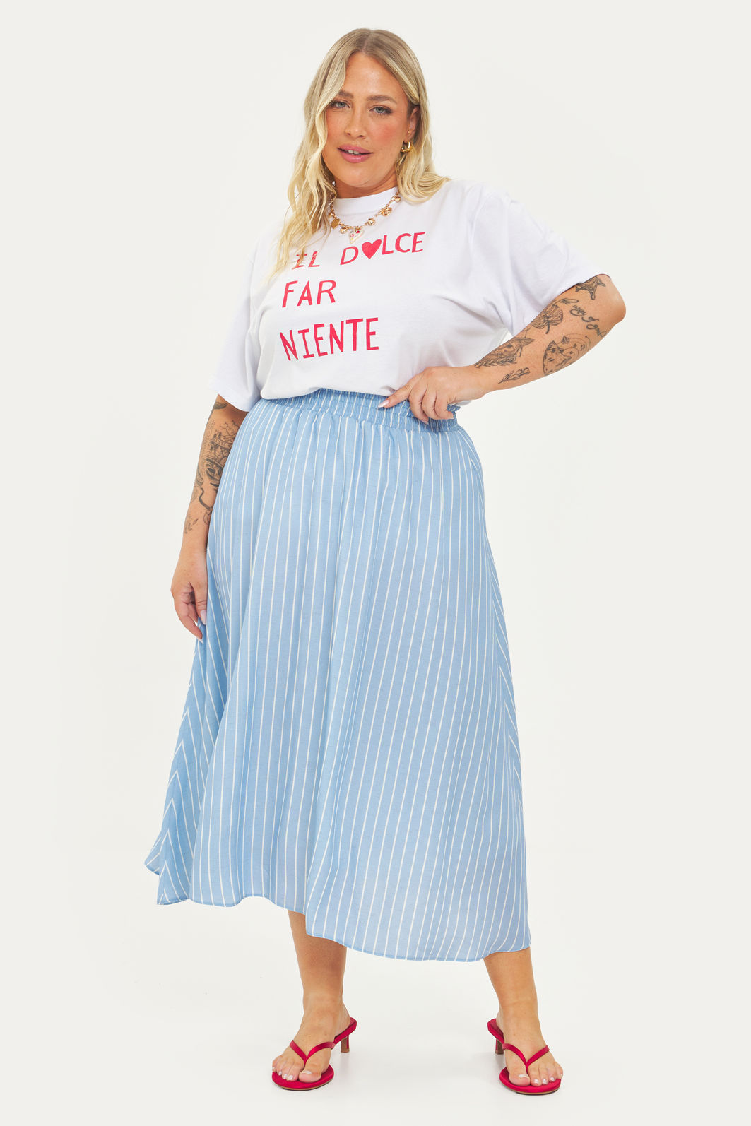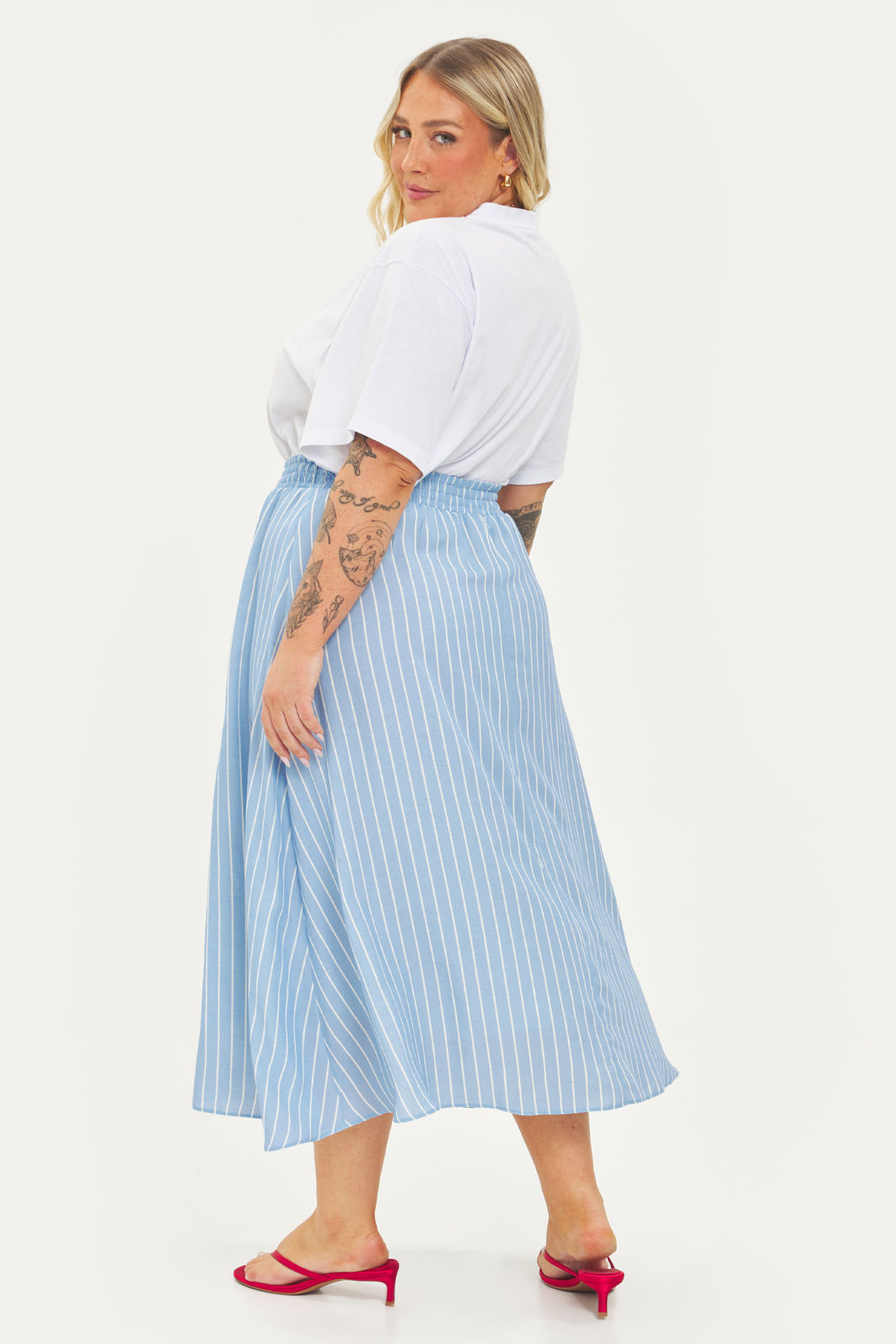Saia midi feminina confeccionada em tecido fluído de viscose com linho e forro 100% poliéster. A peça possui comprimento midi, shape evasê e cós total em elástico para melhor adaptação a diferentes corpos. Com estampa exclusiva em cor contrastante. Modelagem especializada para corpos plus & curve size.