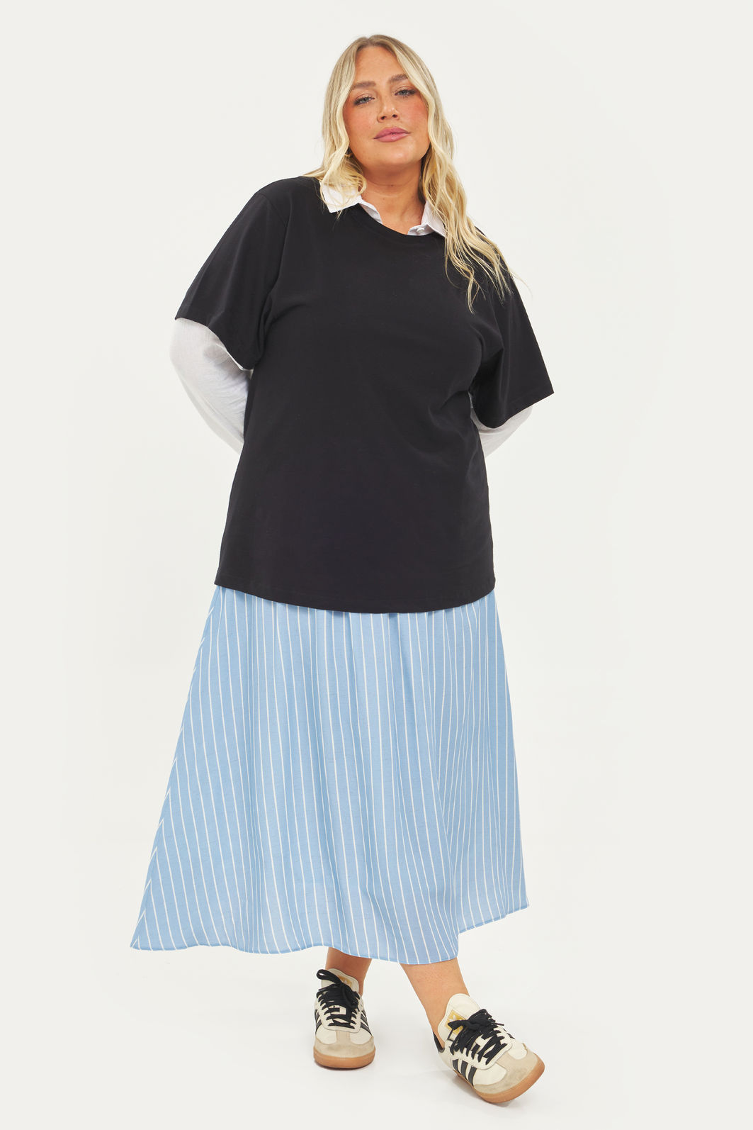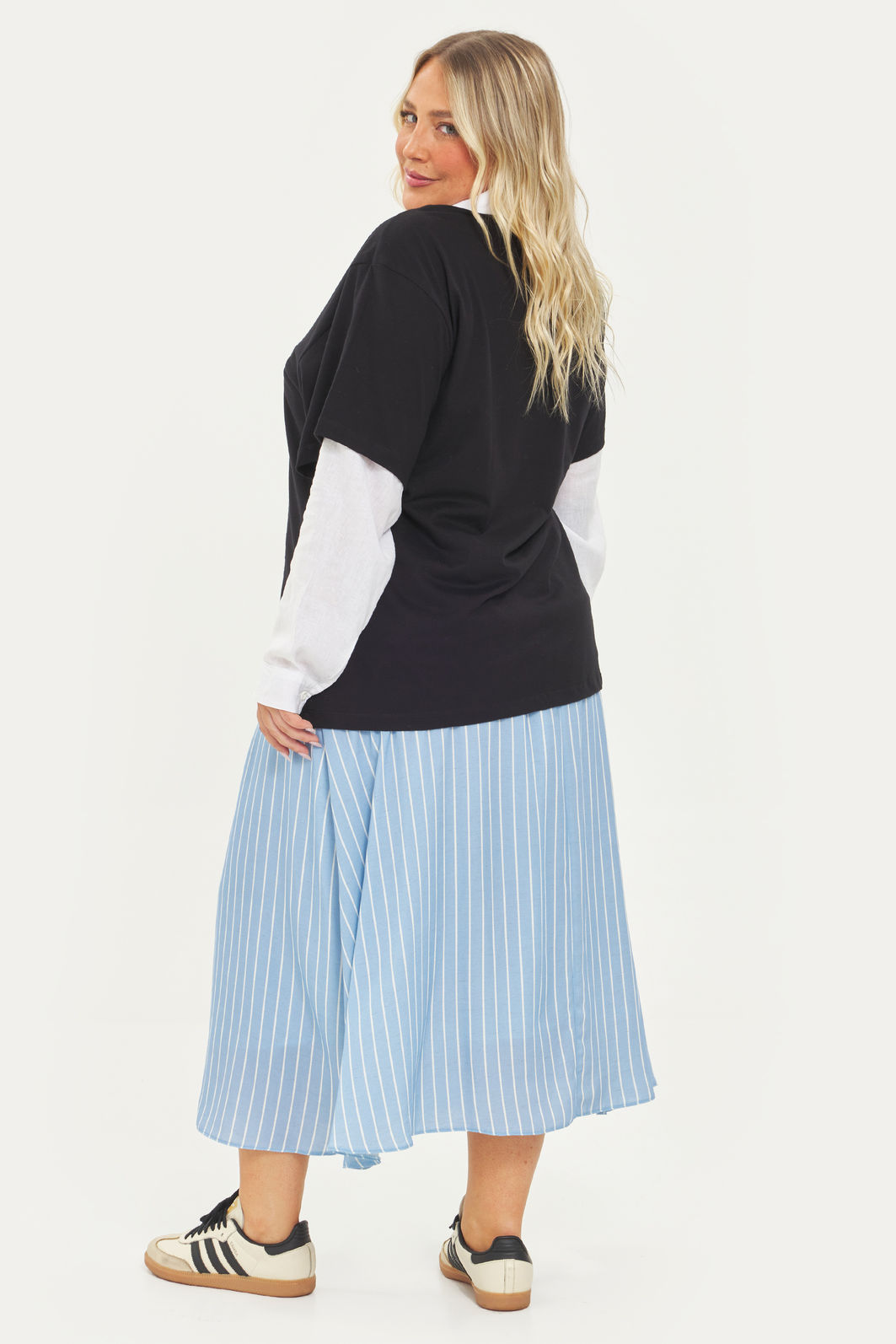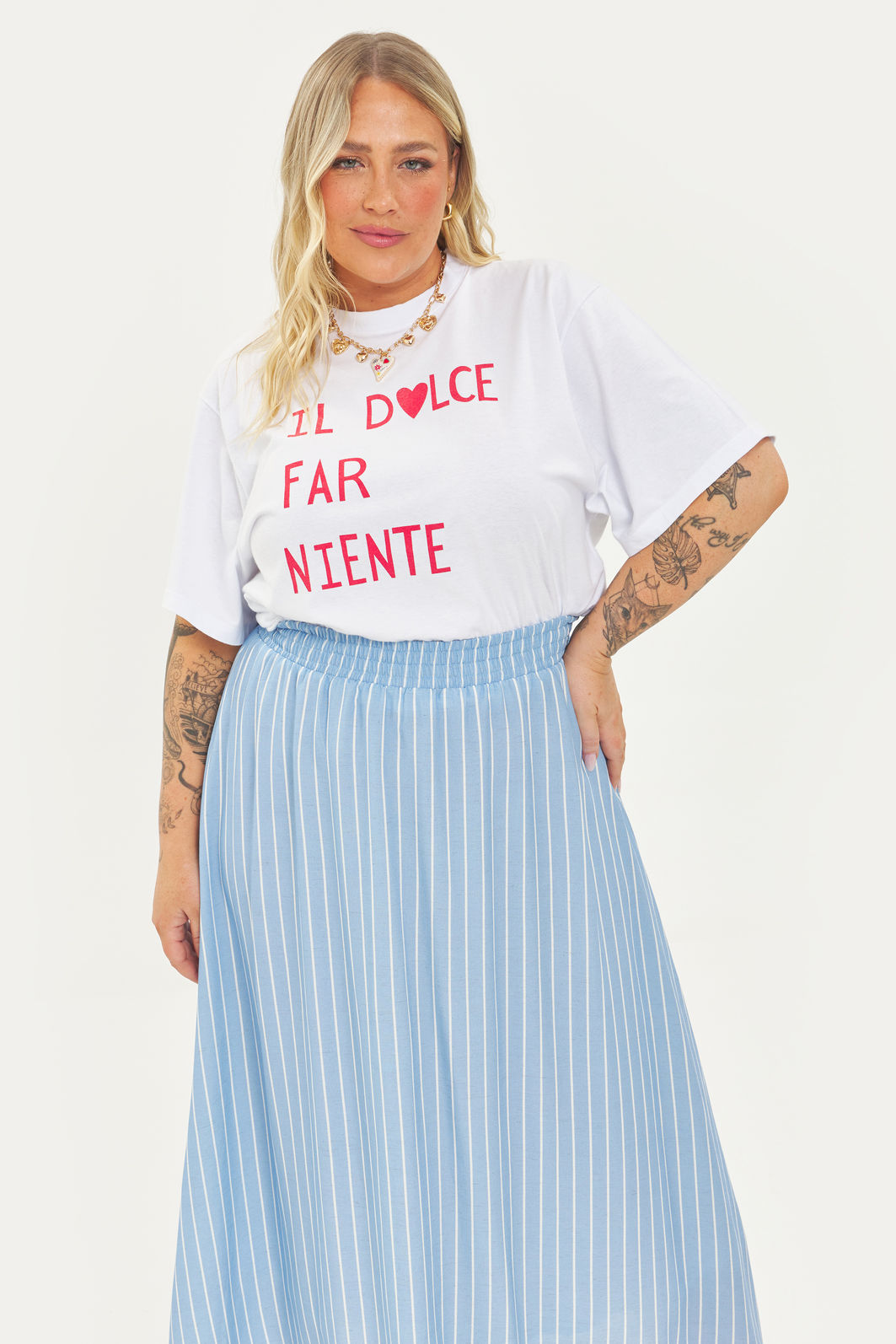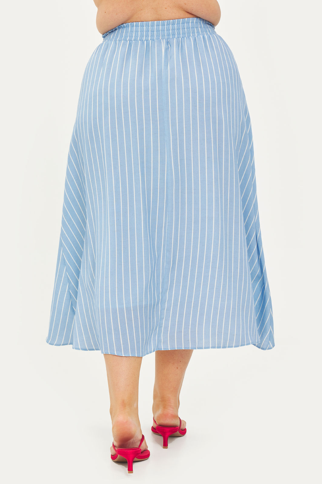 Saia midi feminina confeccionada em tecido fluído de viscose com linho e forro 100% poliéster. A peça possui comprimento midi, shape evasê e cós total em elástico para melhor adaptação a diferentes corpos. Com estampa exclusiva em cor contrastante. Modelagem especializada para corpos plus & curve size.