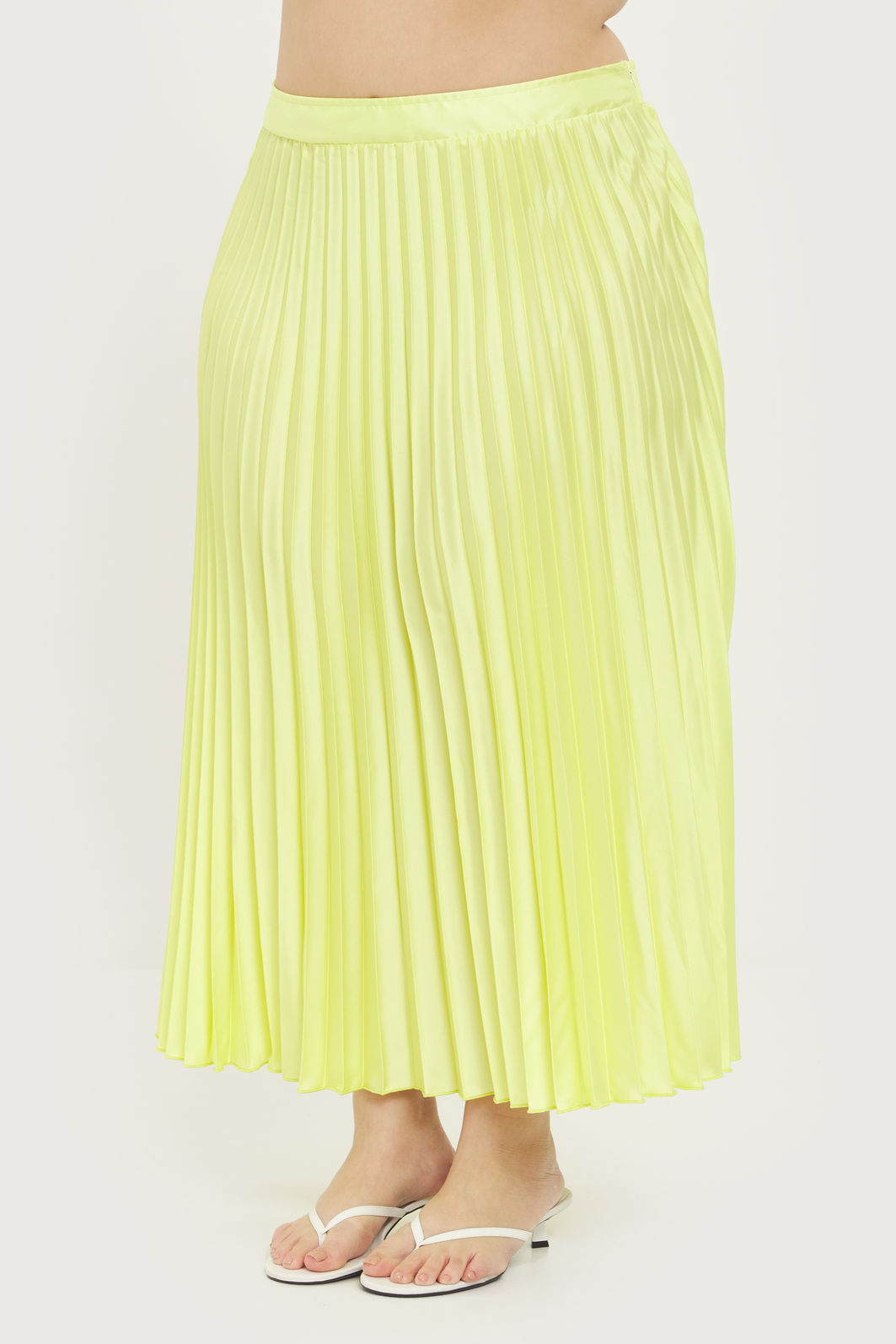 Saia plissada feminina confeccionada em tecido acetinado. A peça possui cintura alta, zíper invisível lateral, comprimento midi e shape solto. Cós entretelado para não ficar marcas de dobra conforme o uso. Modelagem especializada para corpos plus & curve size.