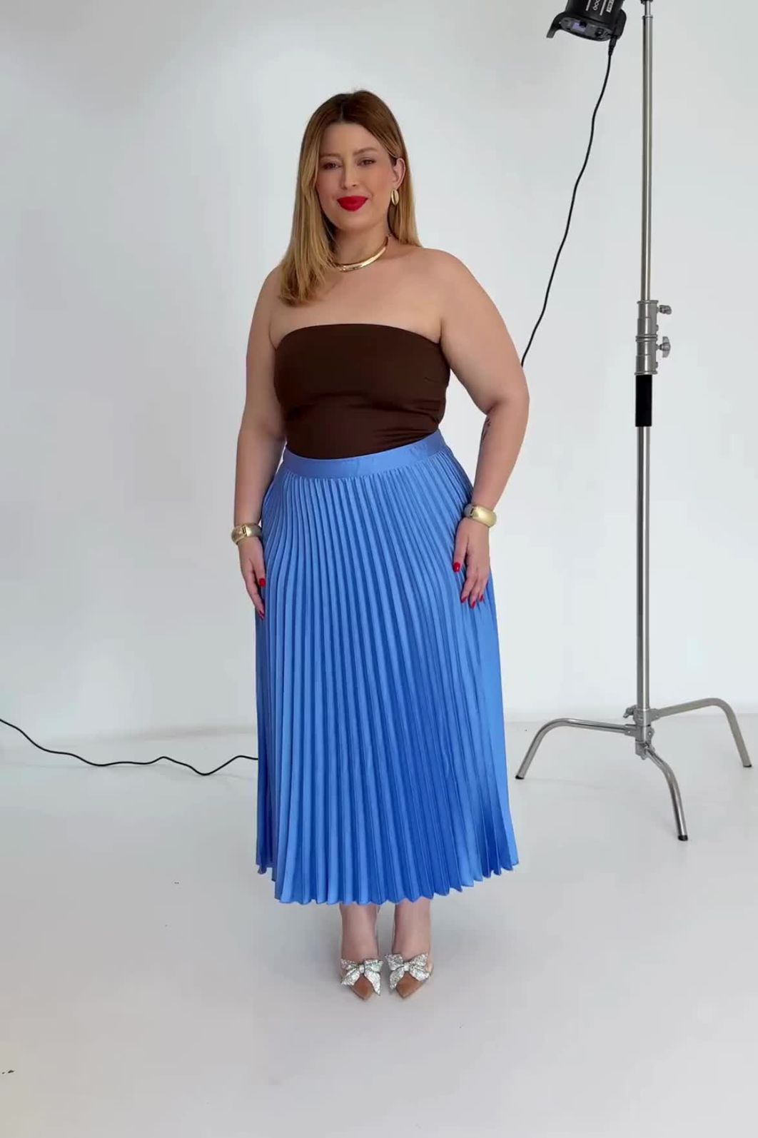 Saia plissada feminina confeccionada em tecido acetinado. A peça possui cintura alta, zíper invisível lateral, comprimento midi e shape solto. Cós entretelado para não ficar marcas de dobra conforme o uso. Modelagem especializada para corpos plus & curve size.