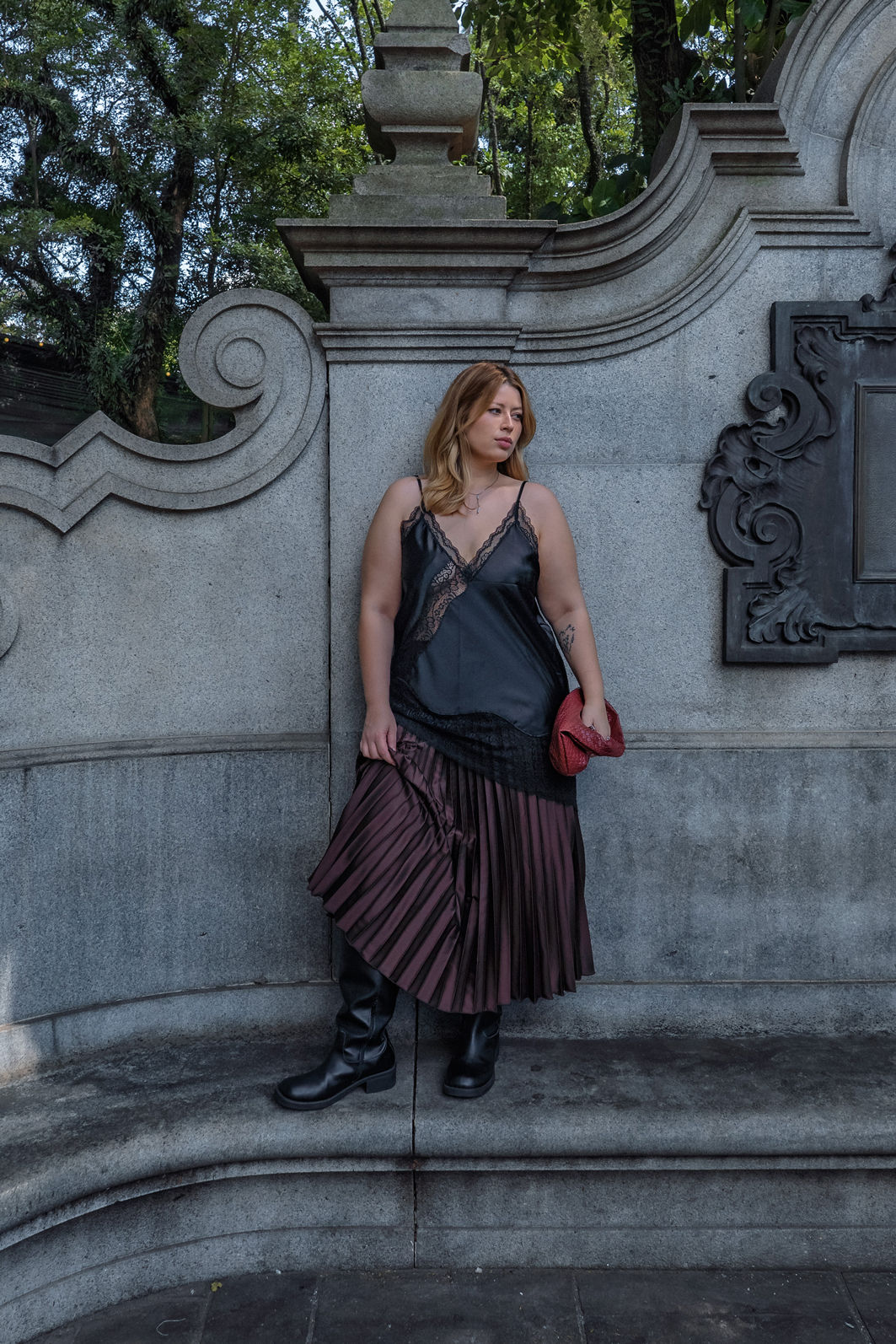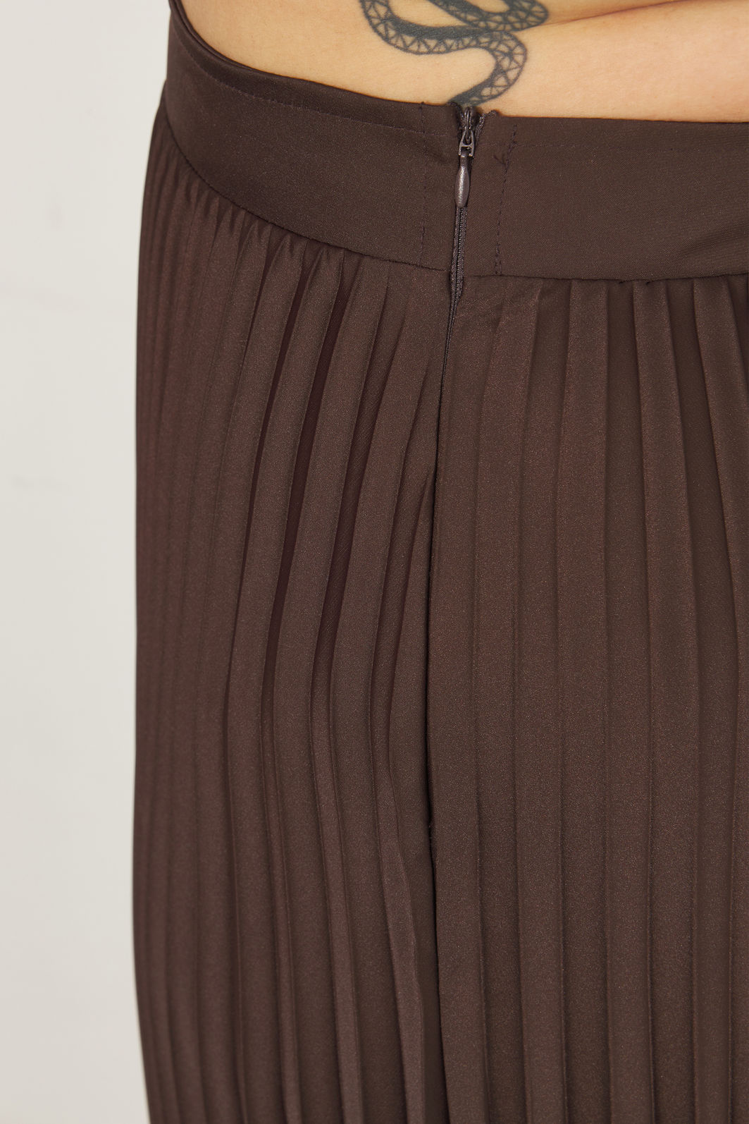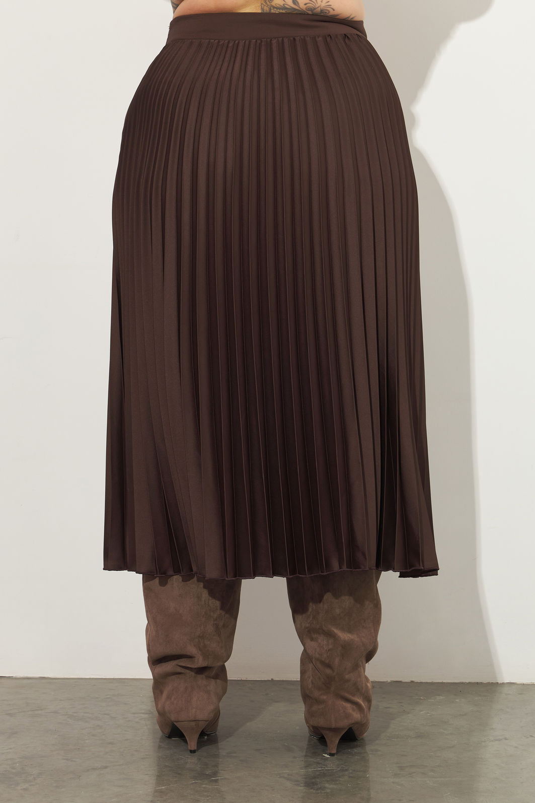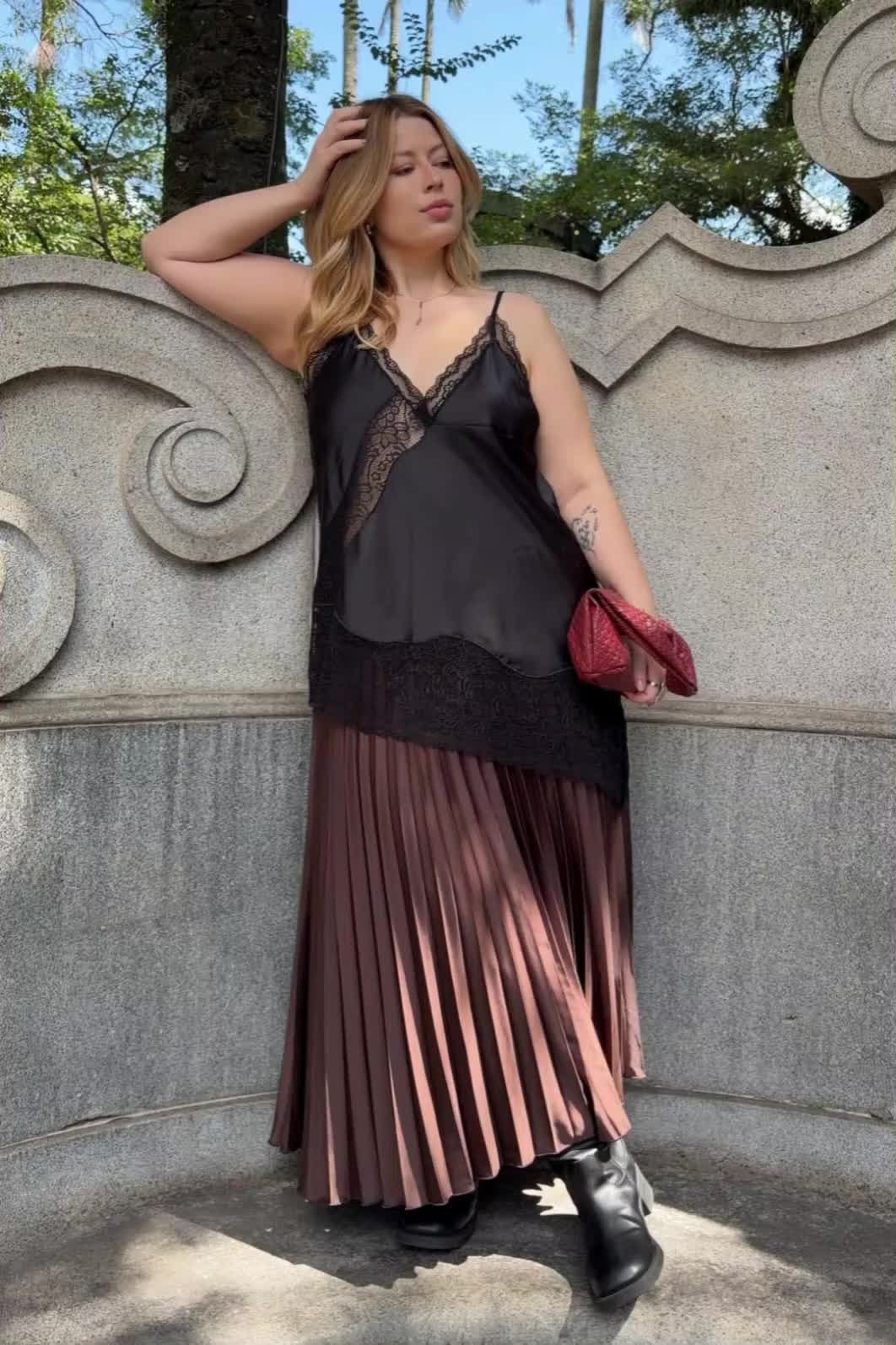 Saia plissada feminina confeccionada em tecido acetinado. A peça possui cintura alta, zíper invisível lateral, comprimento midi e shape solto. Cós entretelado para não ficar marcas de dobra conforme o uso. Modelagem especializada para corpos plus & curve size.
