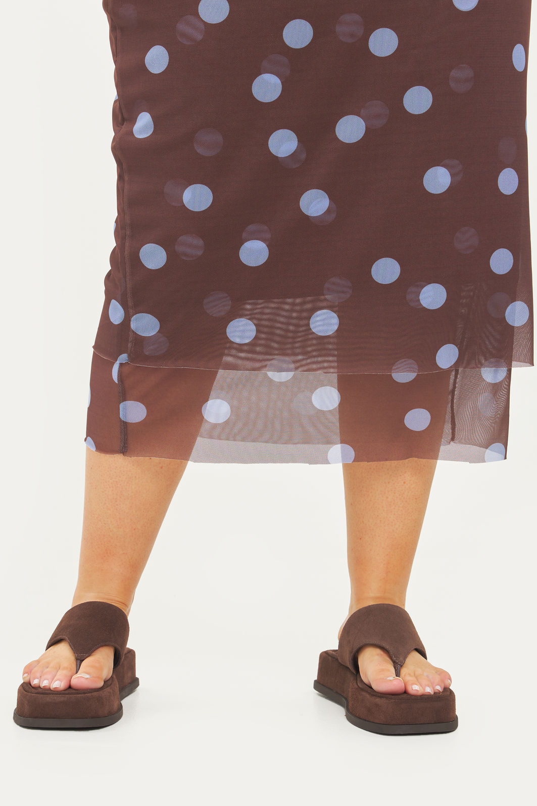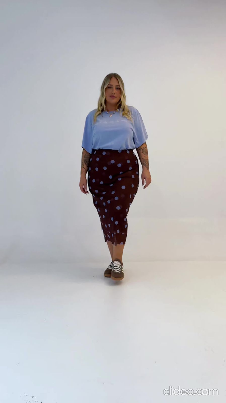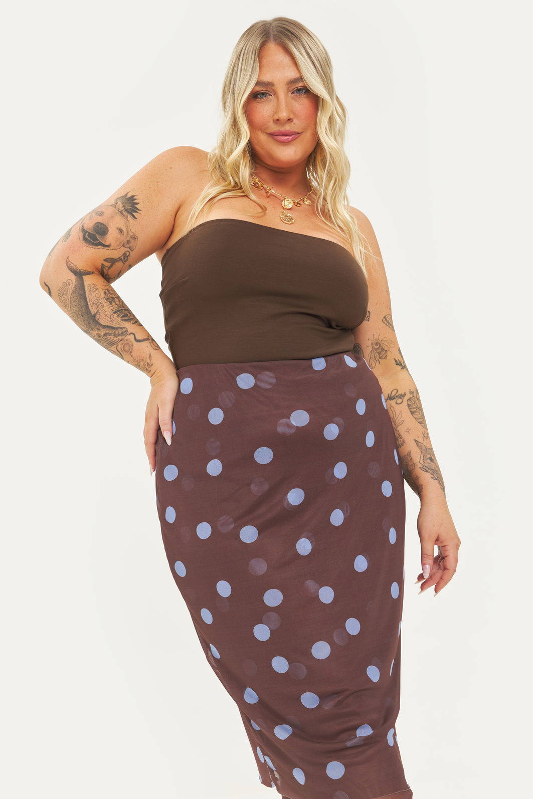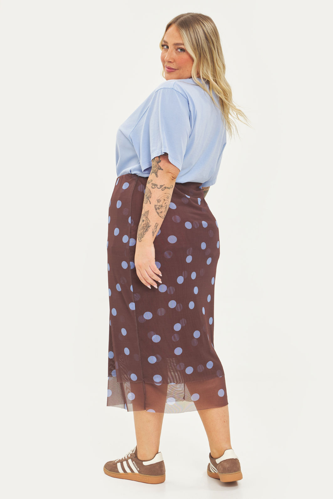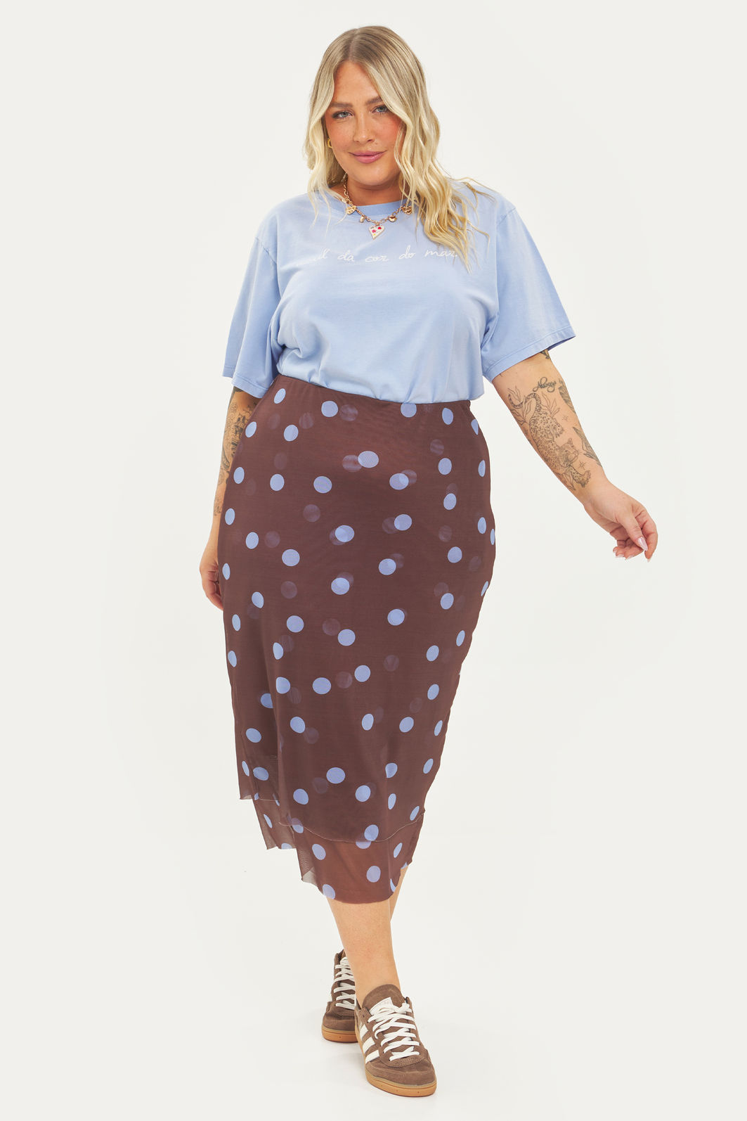 Saia feminina confeccionada em tule com forro. A peça possui cintura alta, 2 camadas de tule, shape justo, comprimento midi, caimento reto e cós total em elástico. Com estampa exclusiva em cor contrastante. Modelagem especializada para corpos plus & curve size.