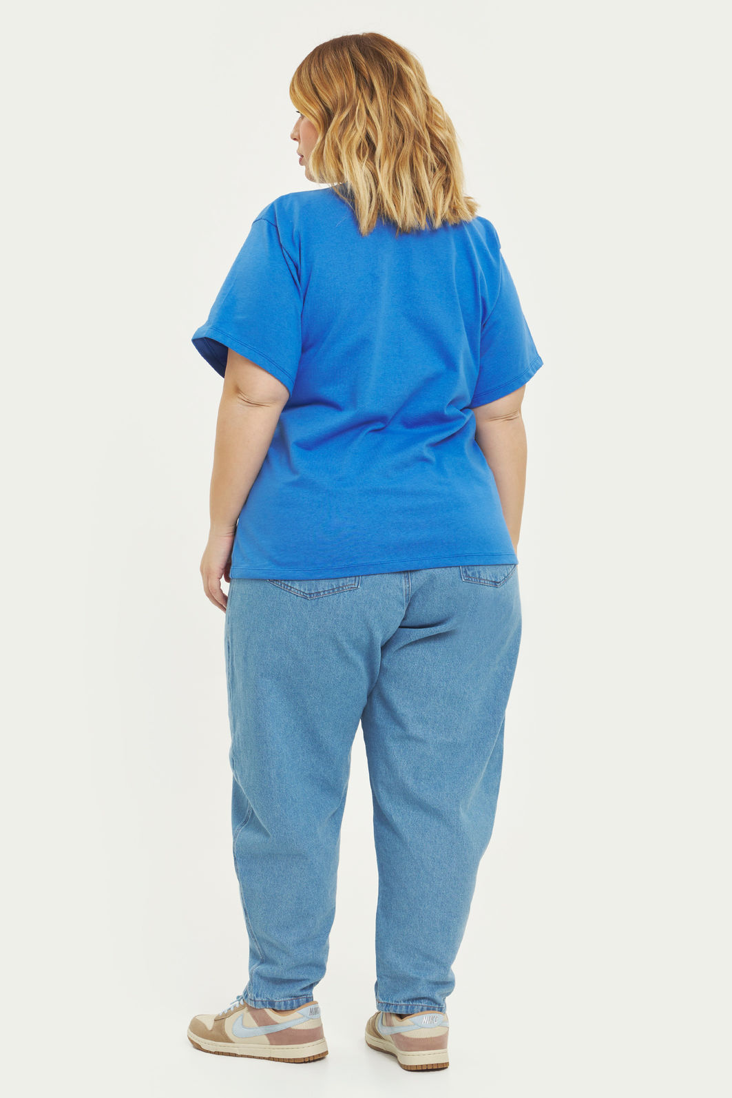 T-shirt confeccionada em malha de algodão. A peça possui decote redondo, mangas curtas, caimento reto, shape solto e acabamento em bainha. Modelagem especializada para corpos plus & curve size.