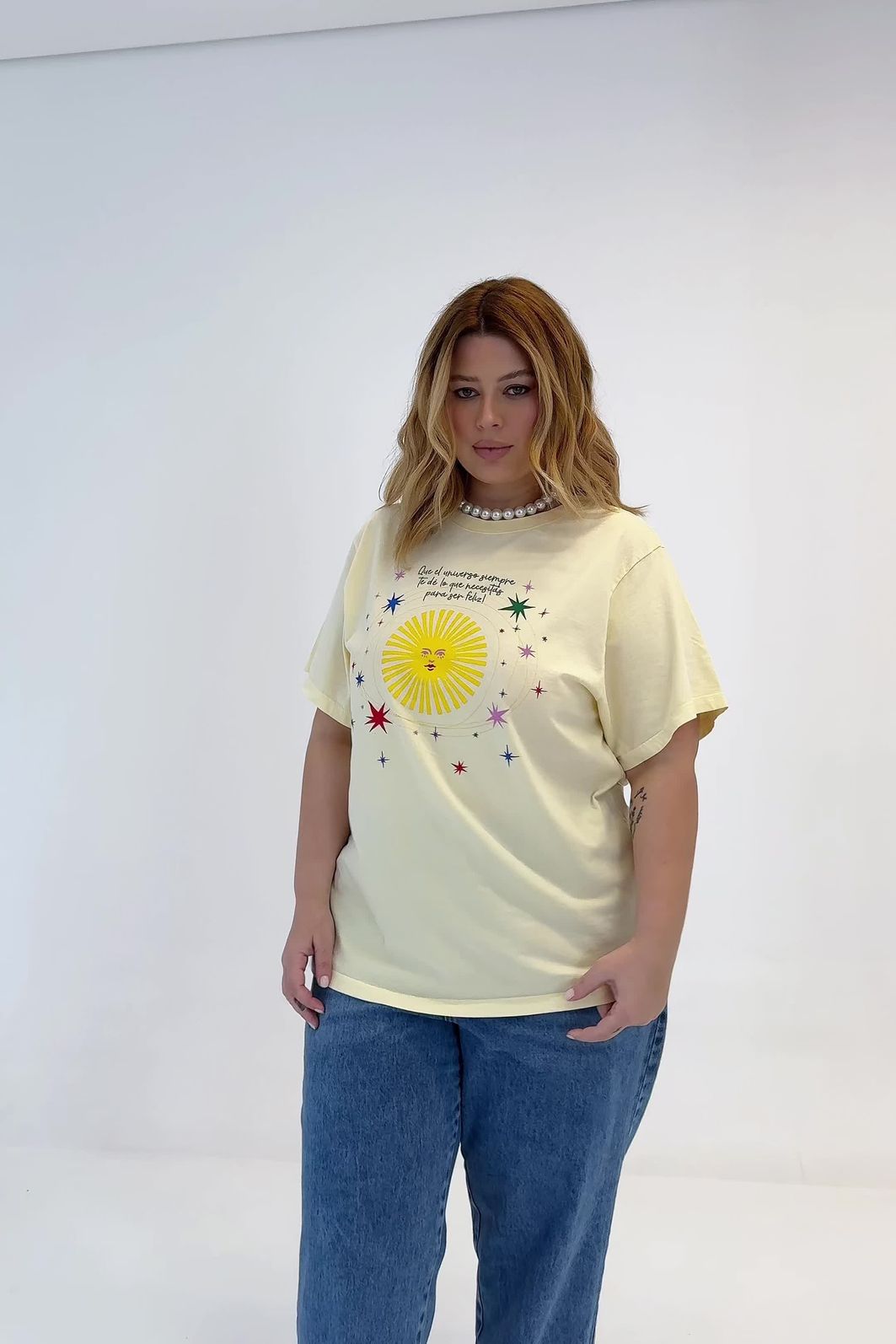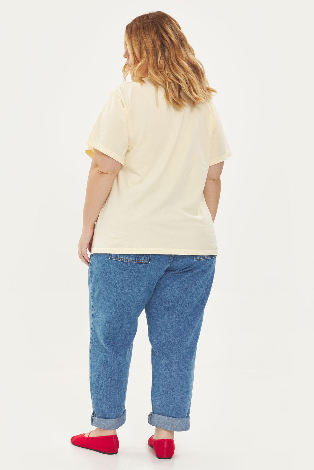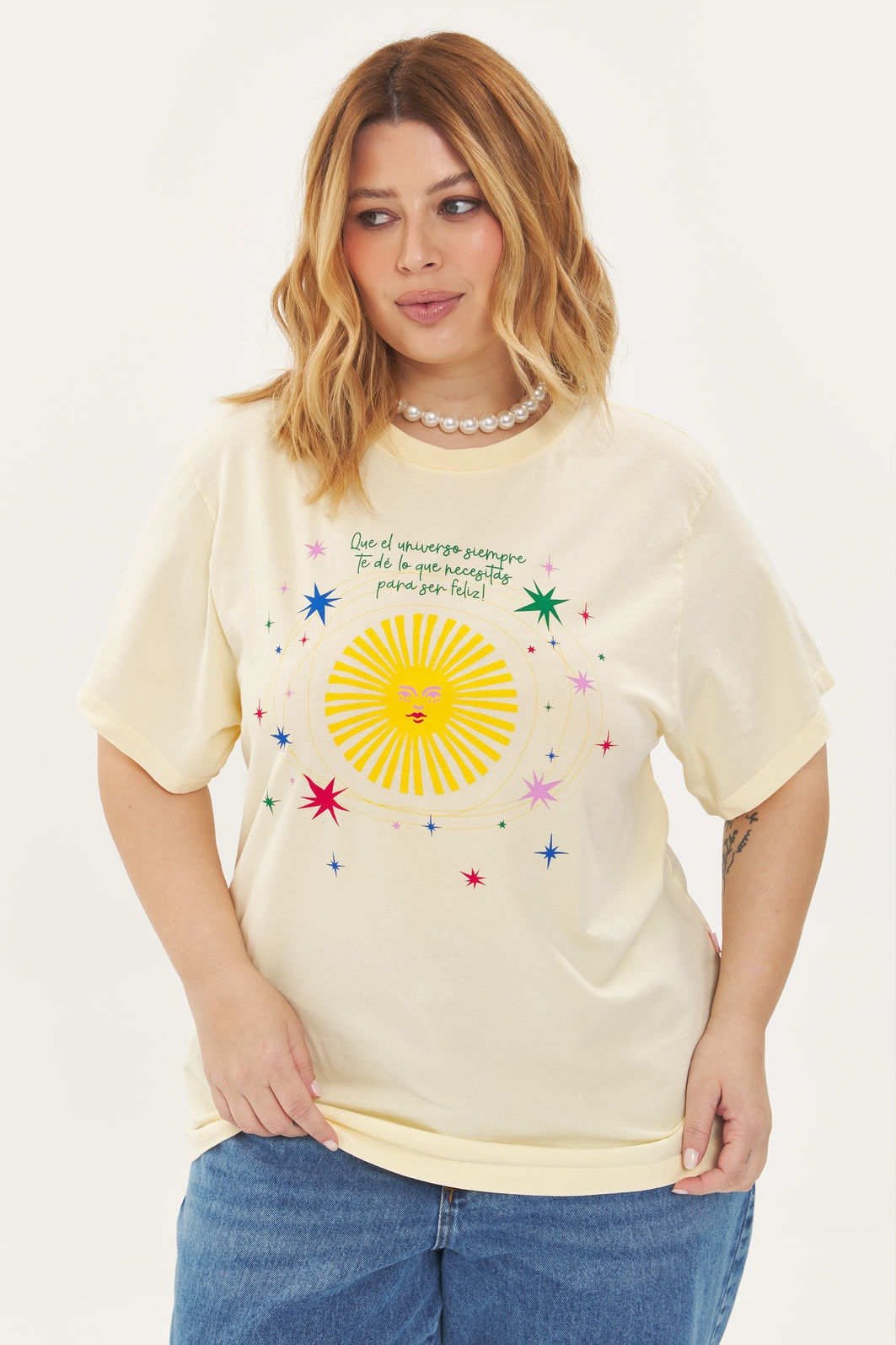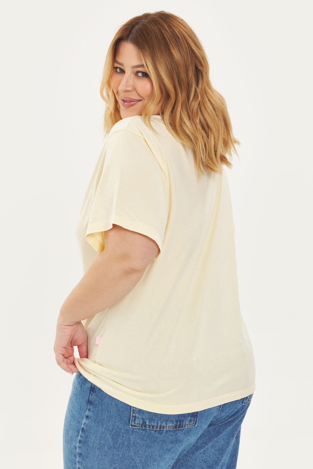 T-shirt feminina confeccionada em malha de algodão com processo em lavanderia. A peça possui decote redondo em ribana, mangas curtas, estampa frontal em silk, caimento reto, shape solto e acabamento em bainha. Modelagem especializada para corpos plus & curve size.