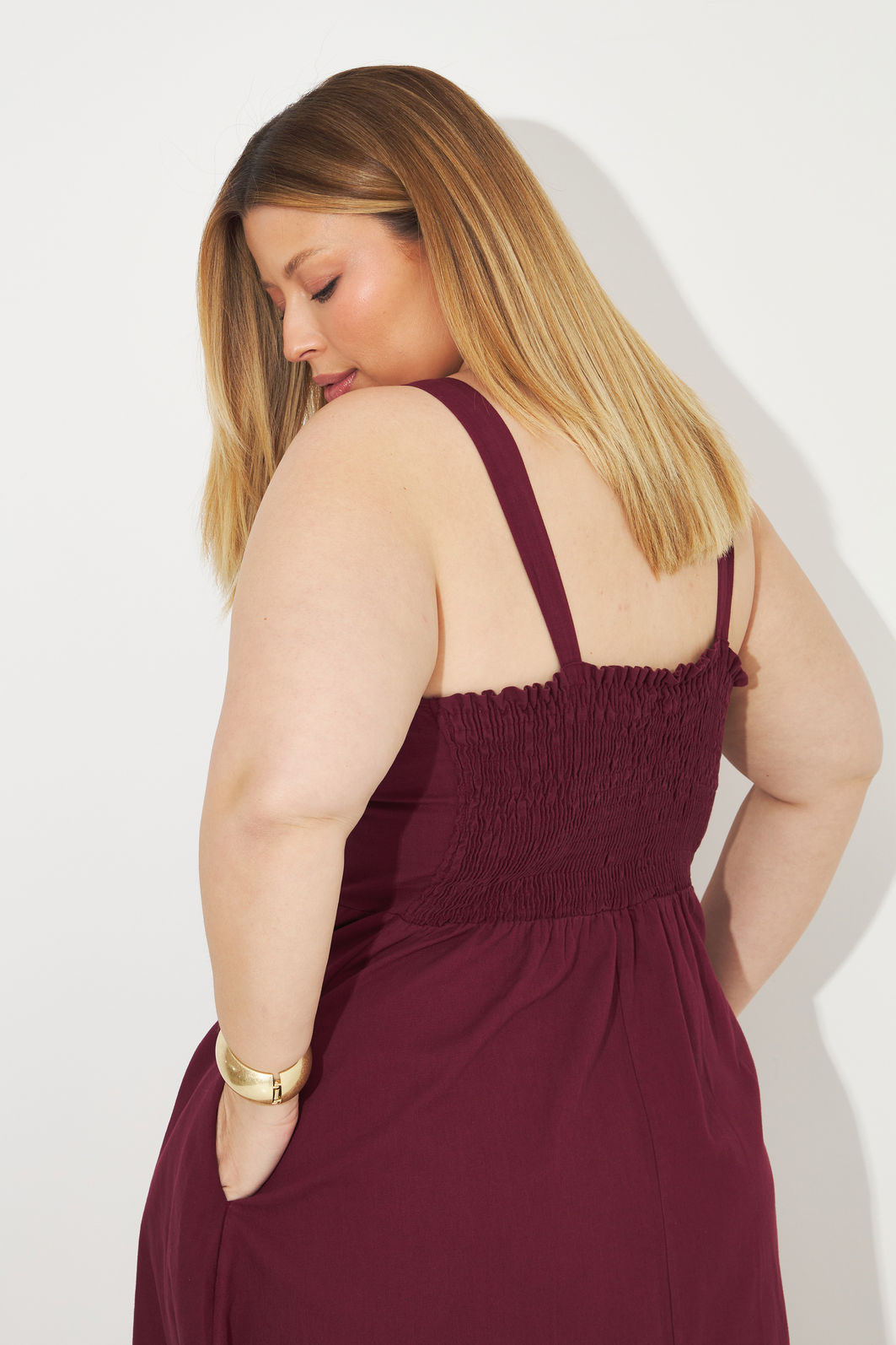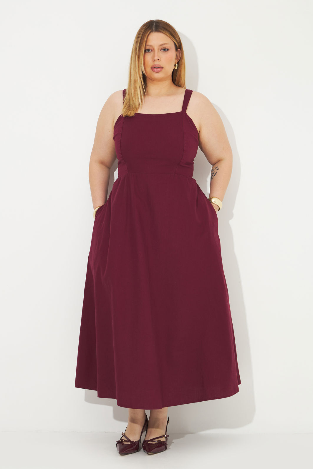Vestido feminino confeccionado em tecido de algodão com precesso em lavanderia. A peça possui decote quadrado, alças médias, shape solto, lastex nas costas para melhor adaptação a diferentes corpos, bolsos funcionais, comprimento midi e caimento evasê. Modelagem especializada para corpos plus & curve size.