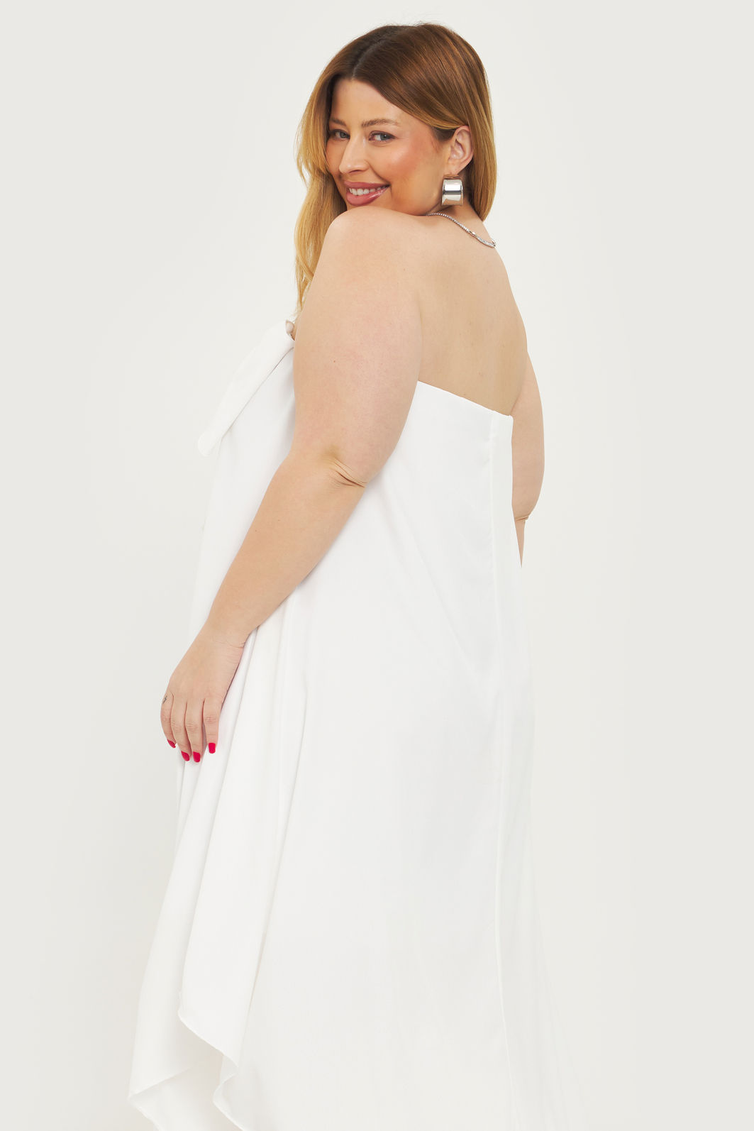 Vestido feminino confeccionado em tecido leve. A peça de modelo tomara que caia solta ao corpo possui decote reto com elástico embutido, laço, forro, barra assimétrica, transparência e shape solto.