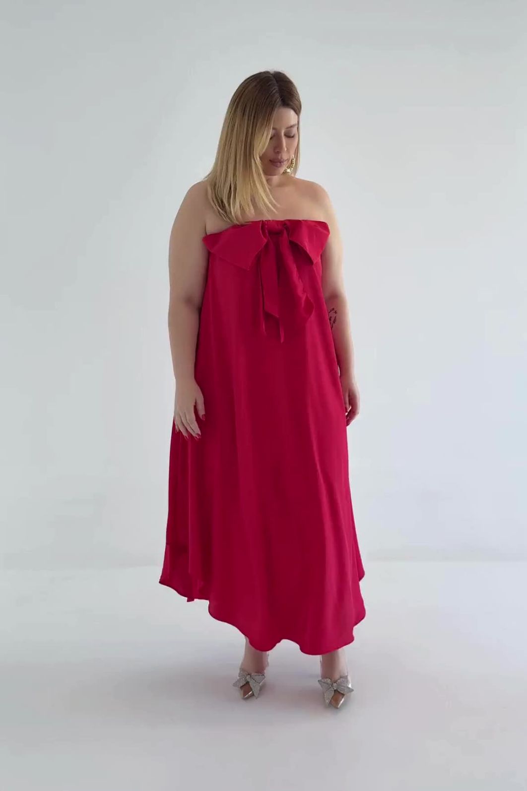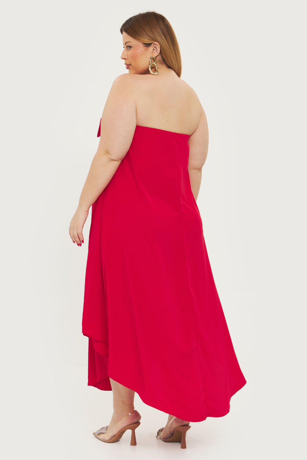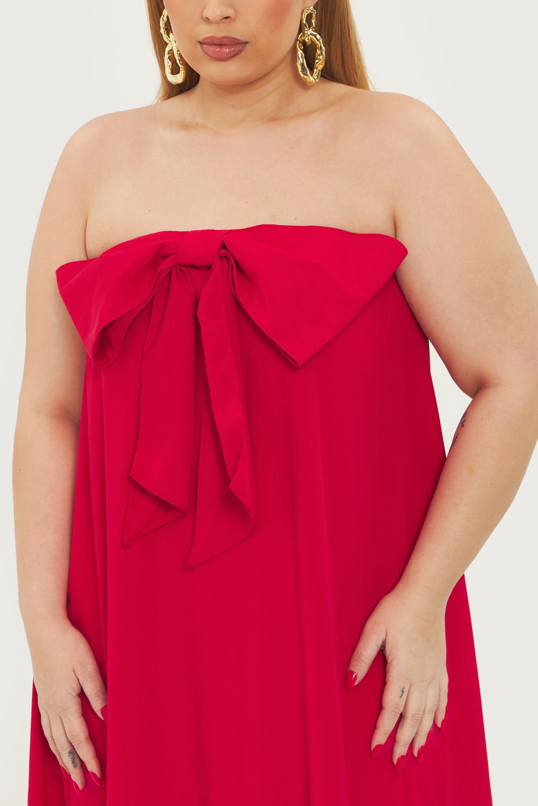 Vestido feminino confeccionado em tecido leve. A peça de modelo tomara que caia solta ao corpo, possui decote reto com elástico embutido, laço, barra assimétrica, com forro e shape solto. Modelagem especializada para corpos plus & curve size.