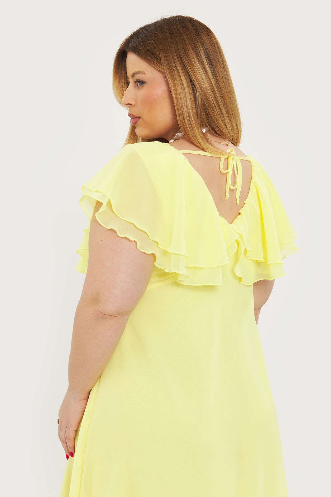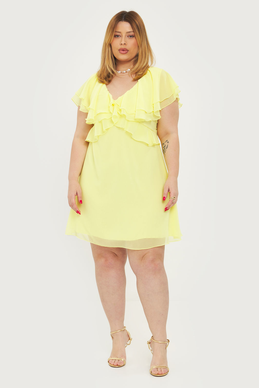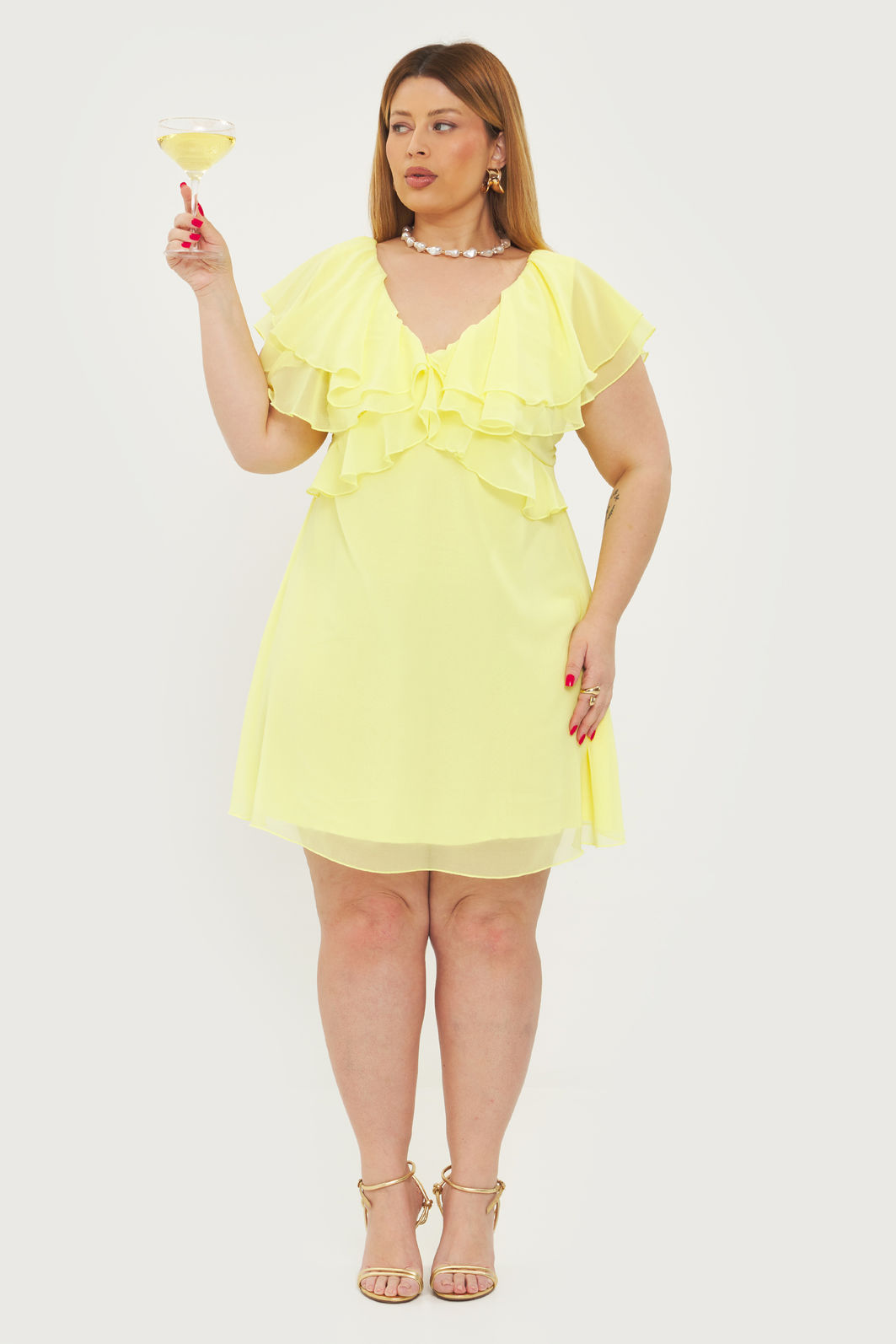 Vestido feminino confeccionado em tecido fluído com transparência. A peça possui forro em viscose, decote V com babados, cordão nas costas para melhor ajuste, comprimento curto e caimento evasê. Modelagem especializada para corpos plus & curve size.