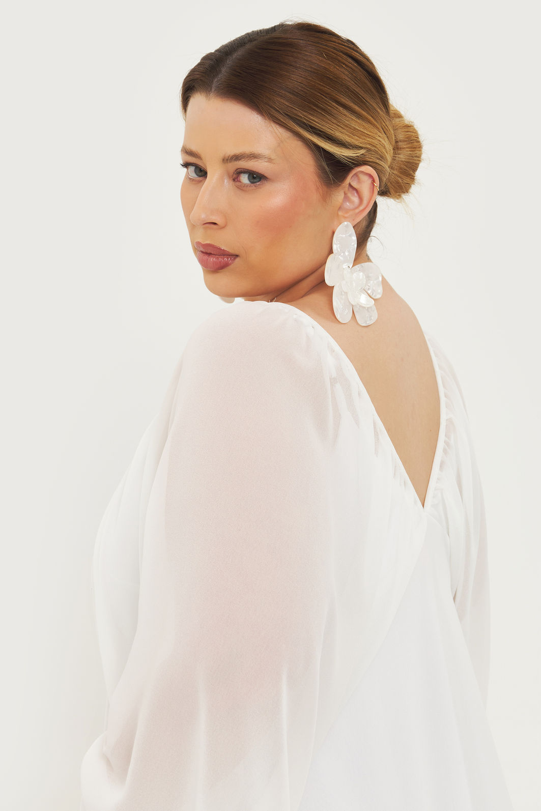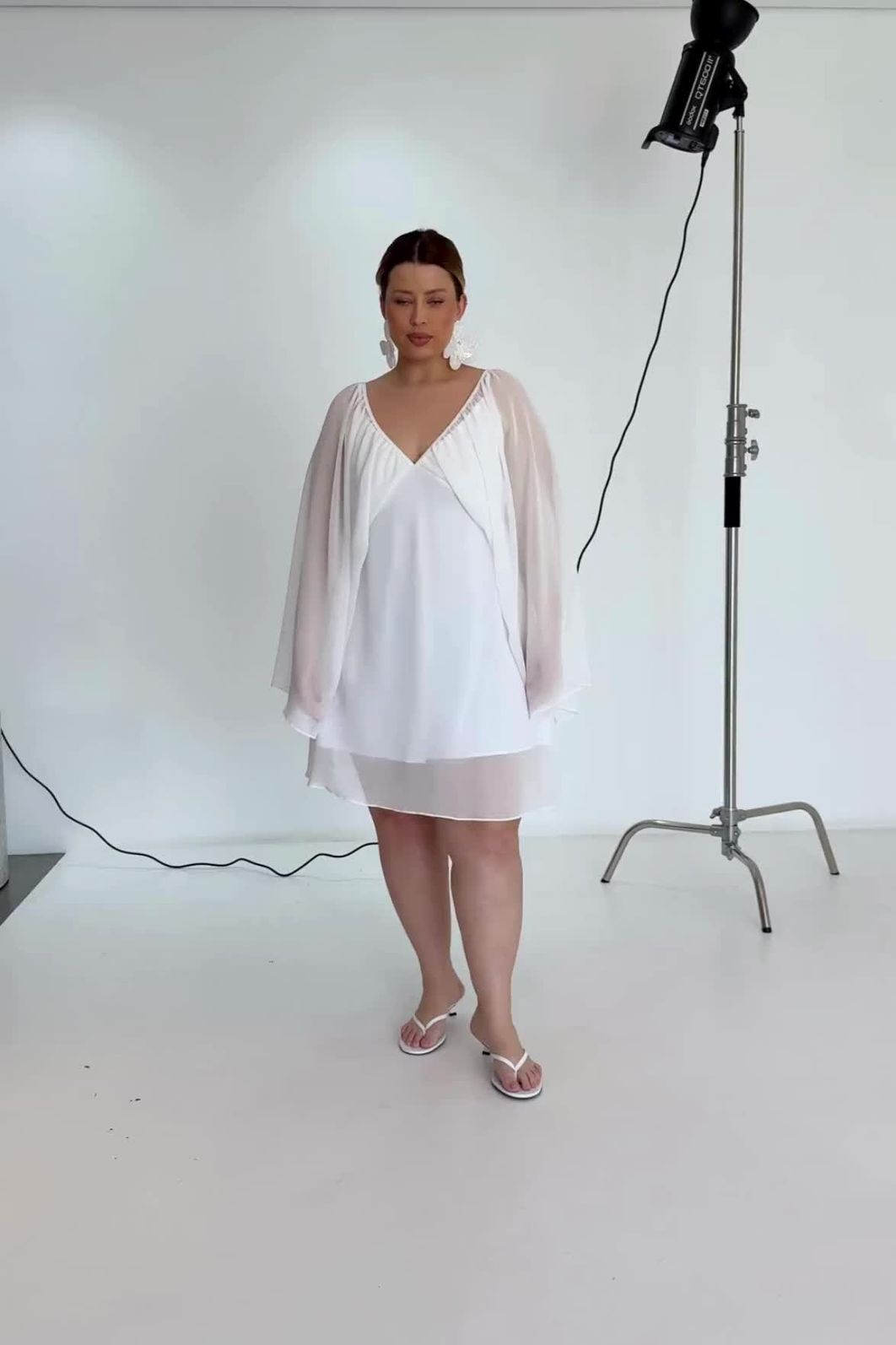 Vestido feminino confeccionado em tecido leve. A peça possui comprimento curto, decote V, mangas amplas, forro, caimento evasê e shape solto.