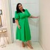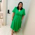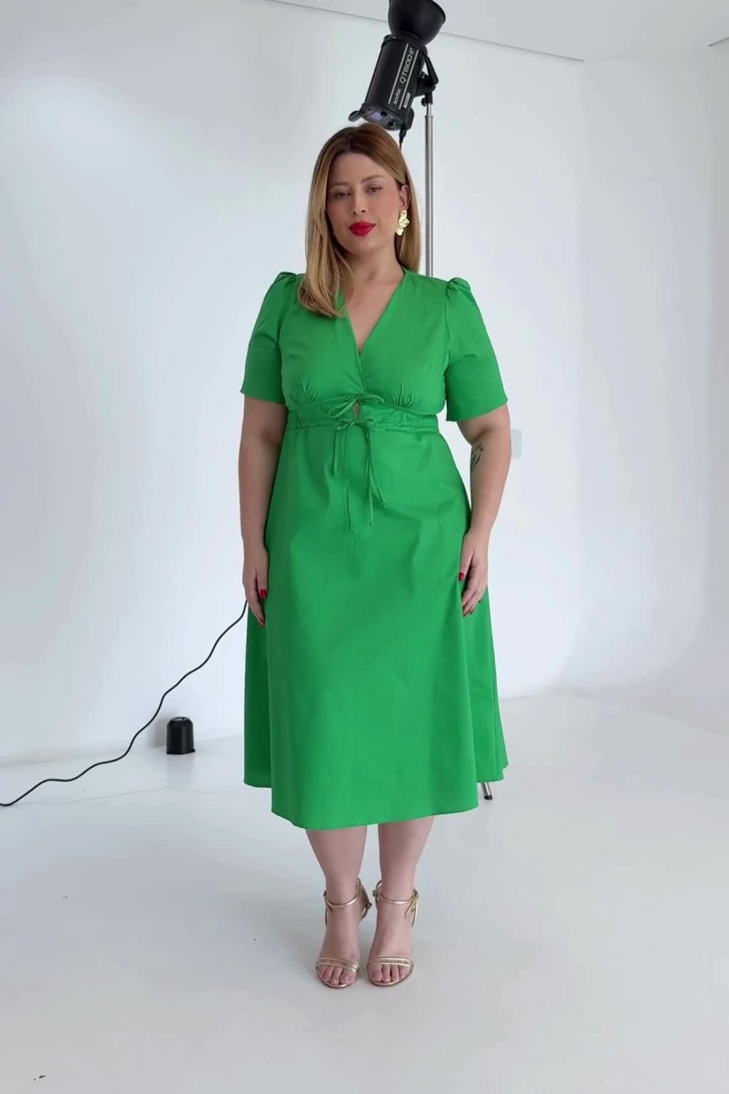 Vestido feminino confeccionado em tecido de algodão com elastano. A peça possui decote V, mangas bufantes, recorte cintura com canaleta para passagem de cordão para melhor adaptação a diferentes corpos, comprimento midi, caimento evasê. Modelagem especializada para corpos plus & curve size.