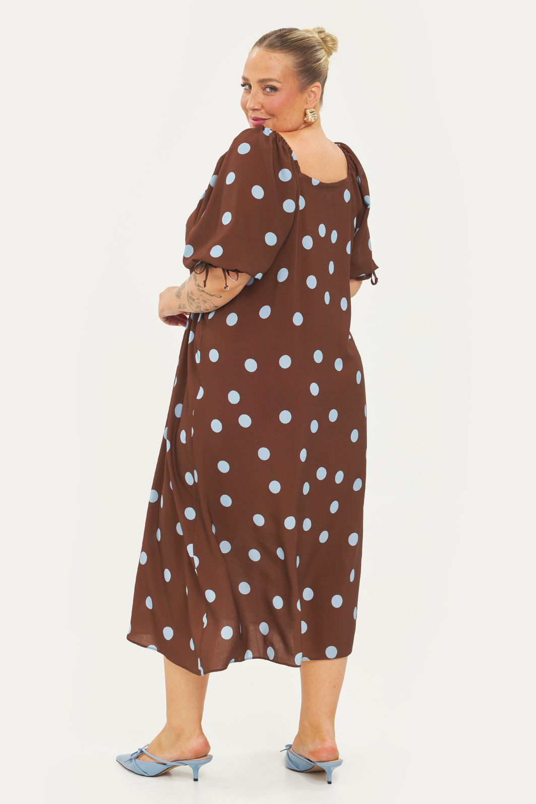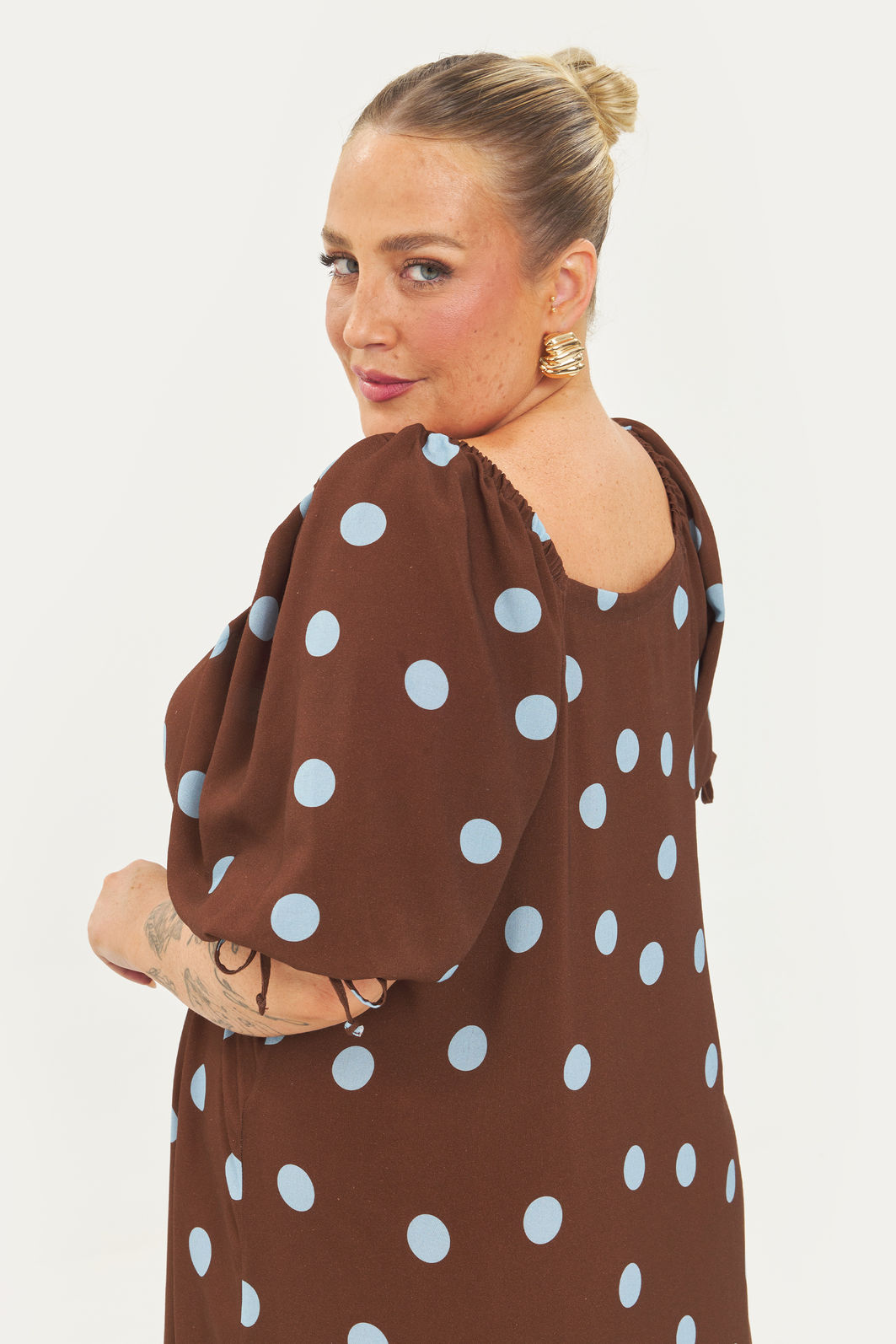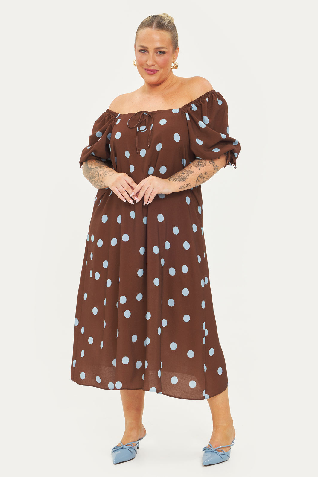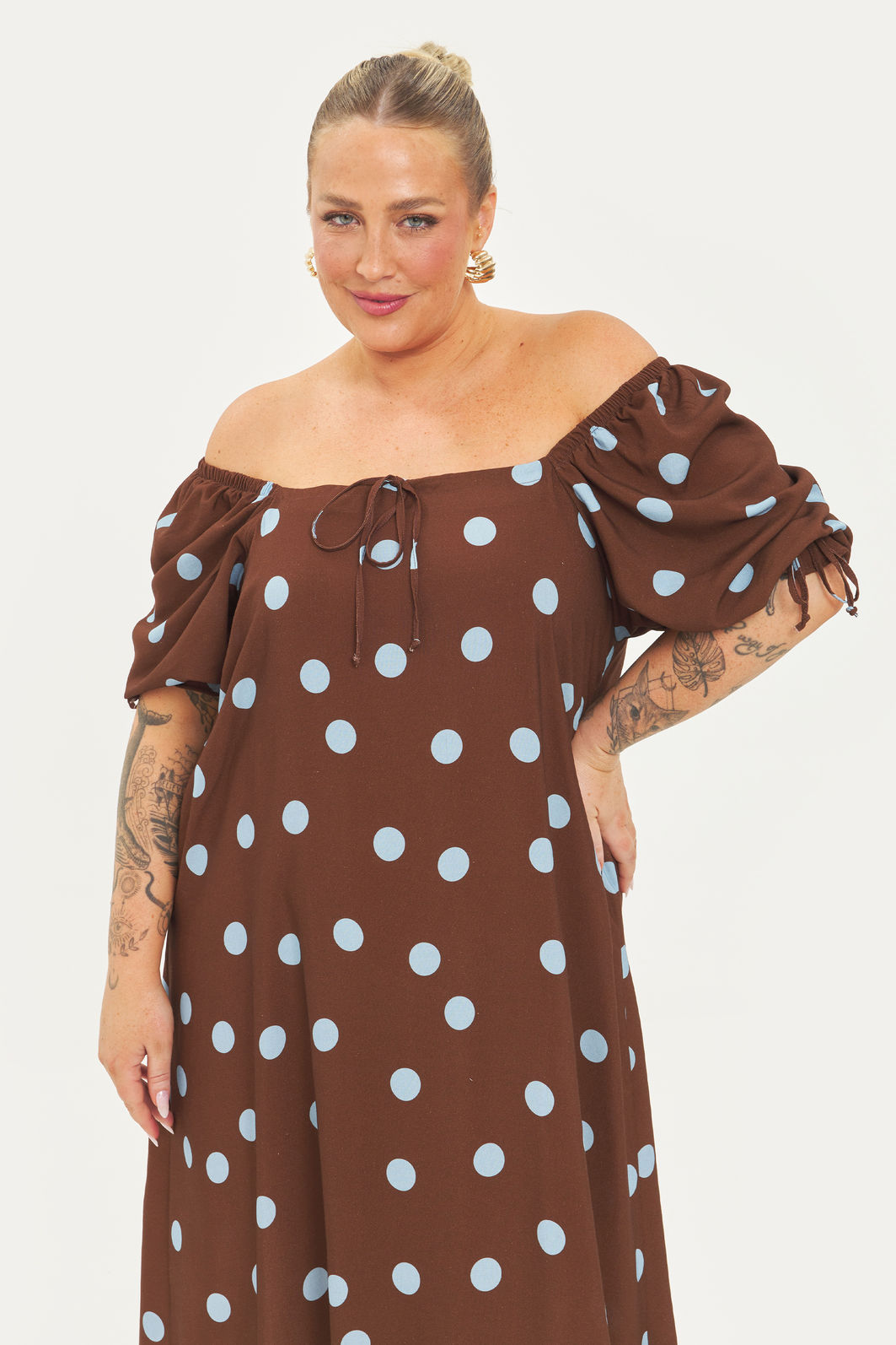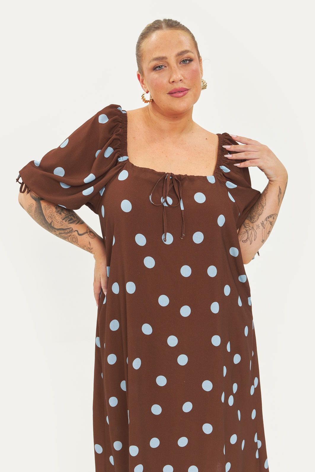 Vestido feminino confeccionado em tecido fluído de viscose com linho. A peça possui decote quadrado com cordão para amarração, mangas curtas levemente bufantes com elástico nos ombros, comprimento midi, shape solto e caimento evasê. Com estampa exclusiva em cor contrastante. Modelagem especializada para corpos plus & curve size.