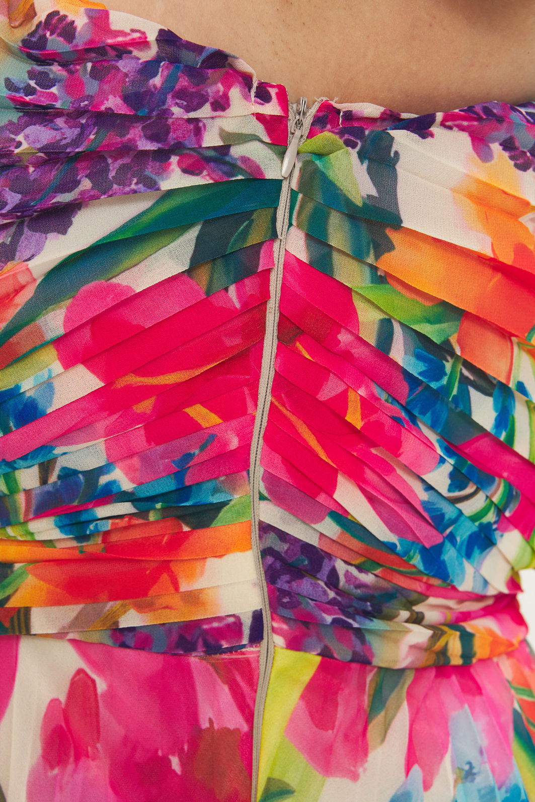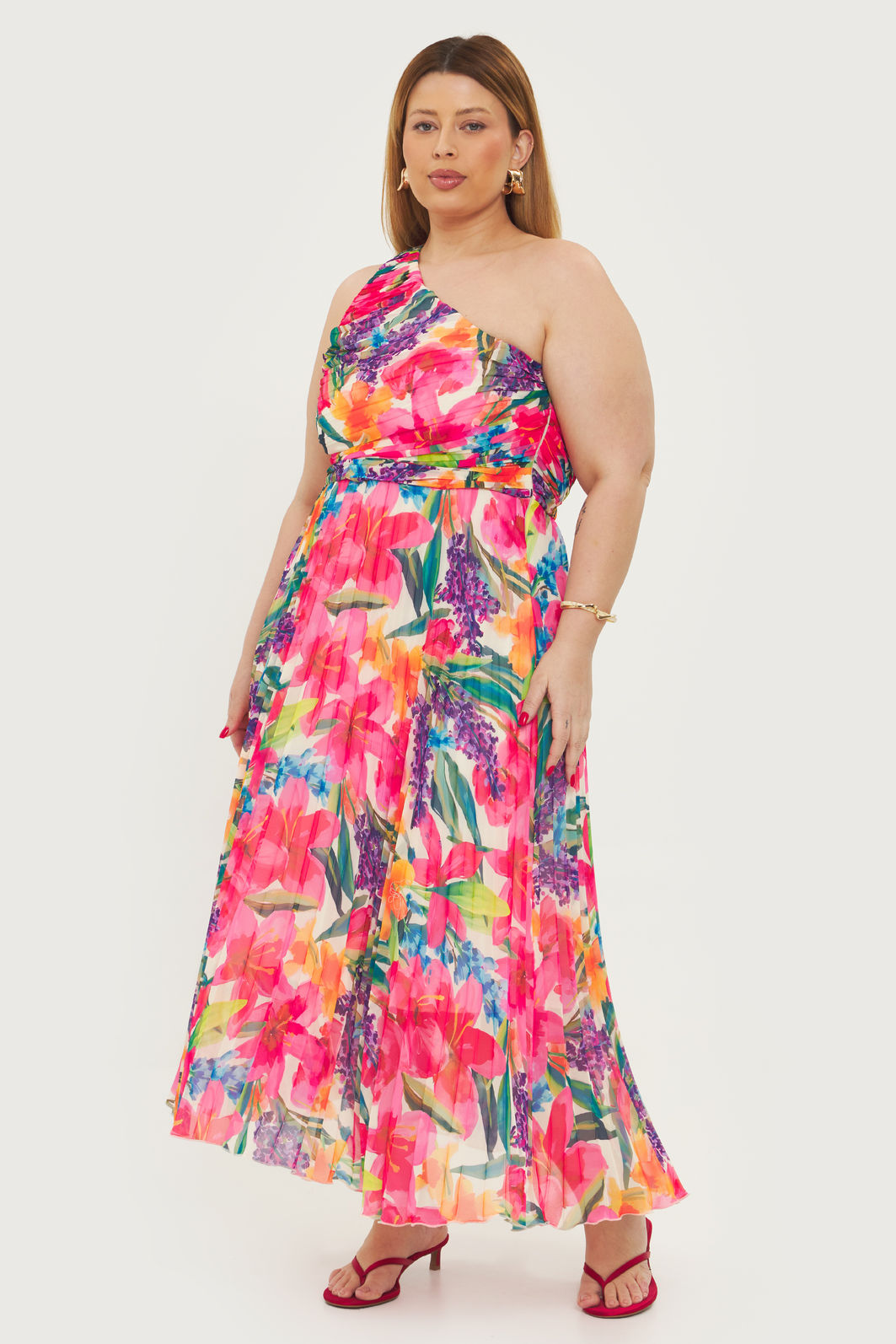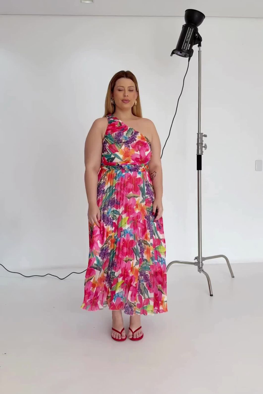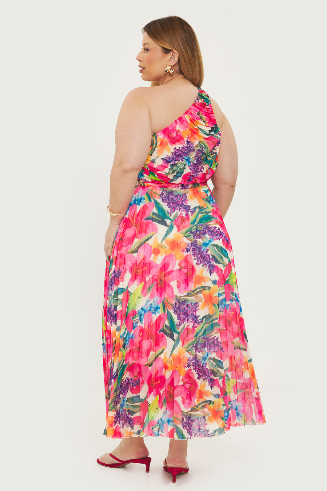 Vestido plissado confeccionado em tecido fluido. A peça possui modelagem de um ombro só, shape soltinho levemente acinturado, zíper invisível na lateral, além de forro para maior conforto e segurança, comprimento midi. Com estampa floral exclusiva em cor contrastante. Modelagem especializada para corpos plus & curve size.