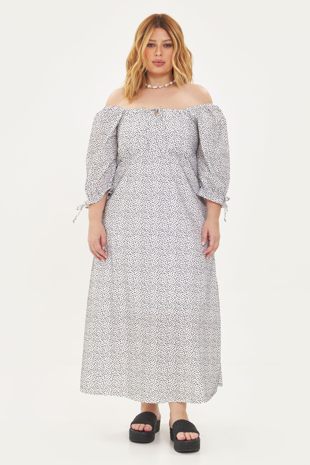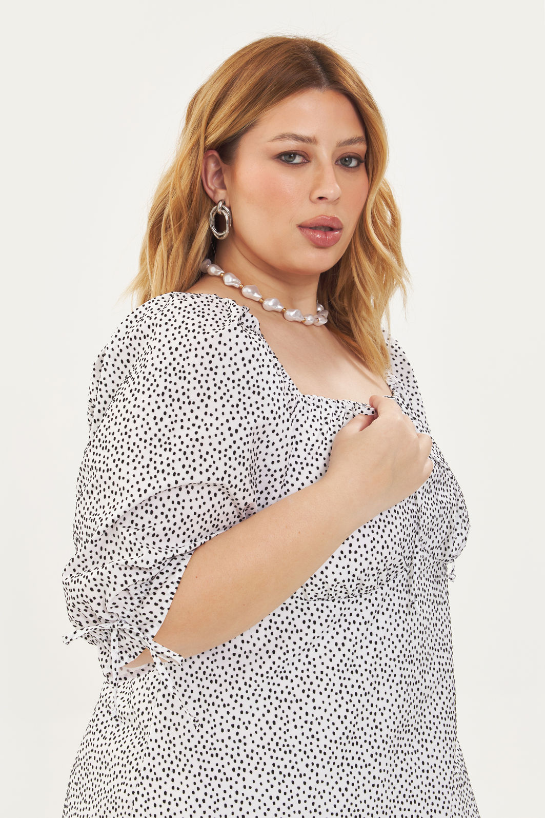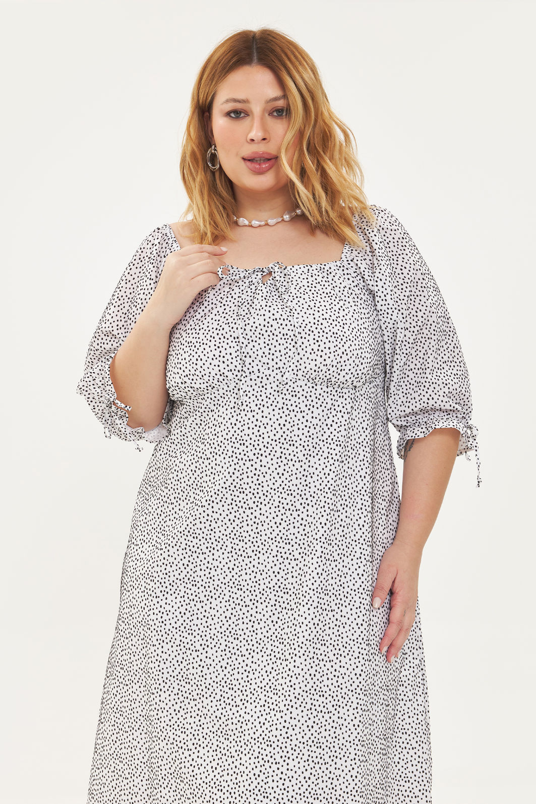 Vestido feminino confeccionado em tecido 100% algodão, com forro 100% poliéster e estampa exclusiva em cor contrastante. A peça possui decote quadrado com cordão para amarração, recorte no busto, costas com lastex para melhor sustentação, mangas curtas levemente bufantes com elástico nos ombros e punhos e detalhe de cordão para amarração, comprimento midi, forro, shape solto. Modelagem especializada para corpos plus & curve size.